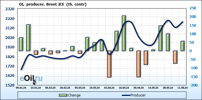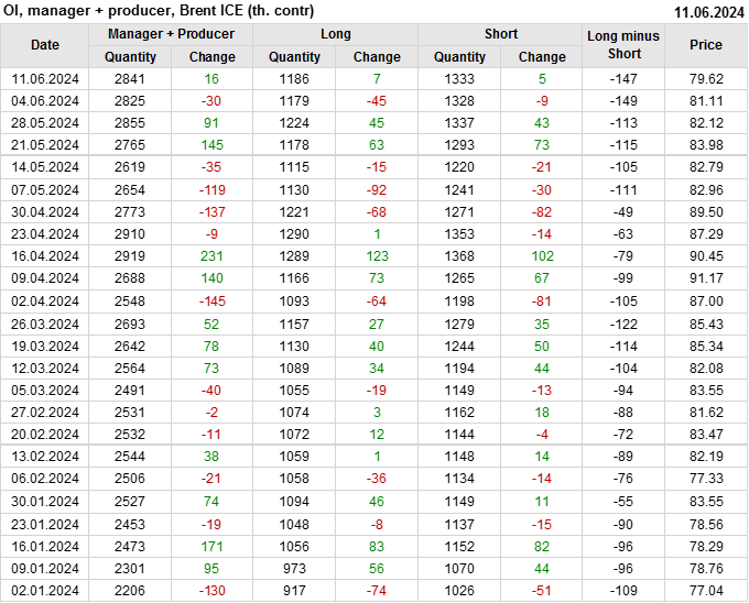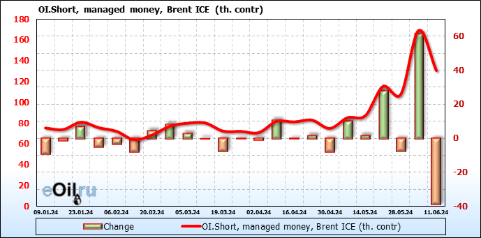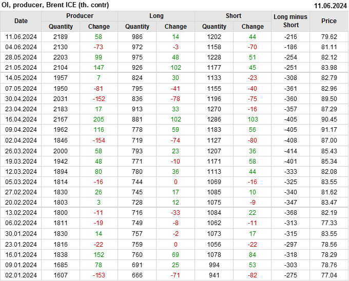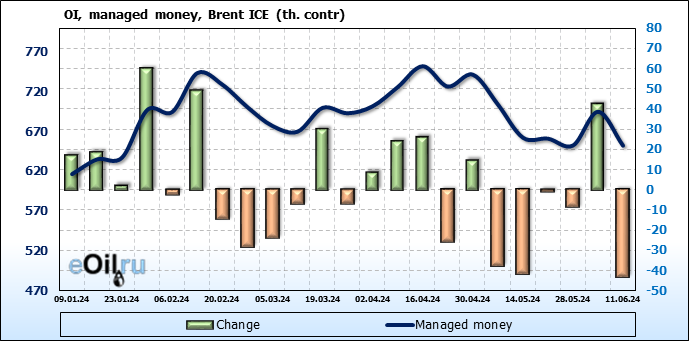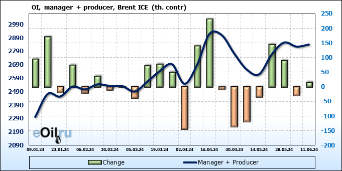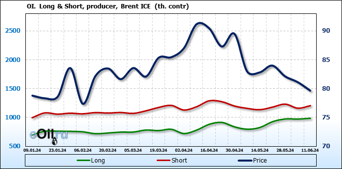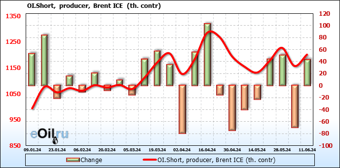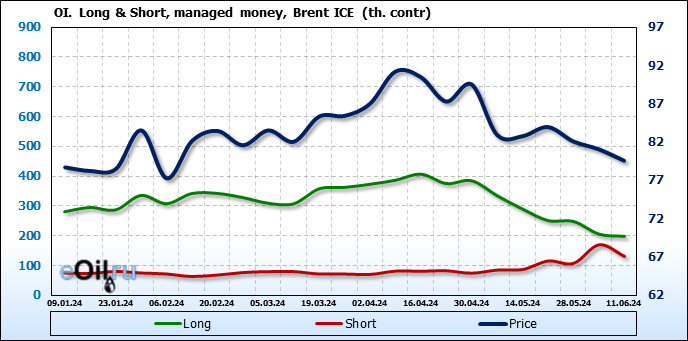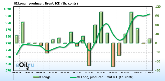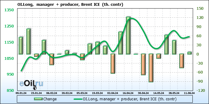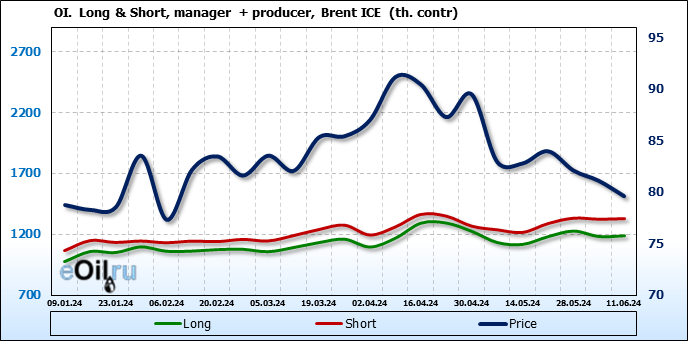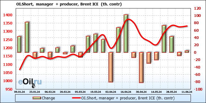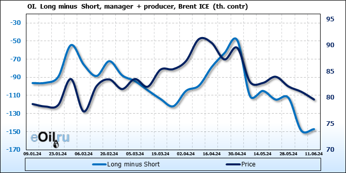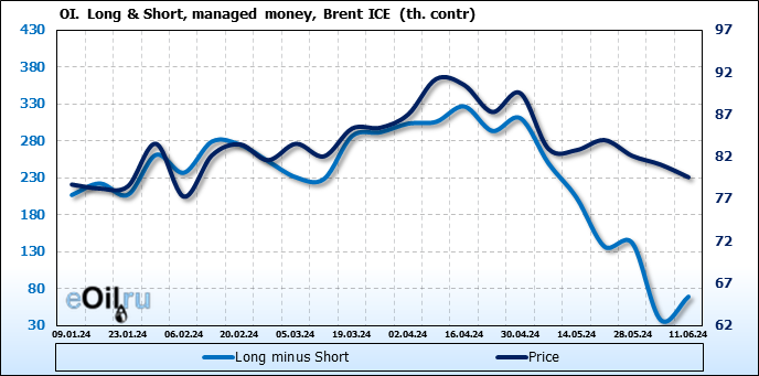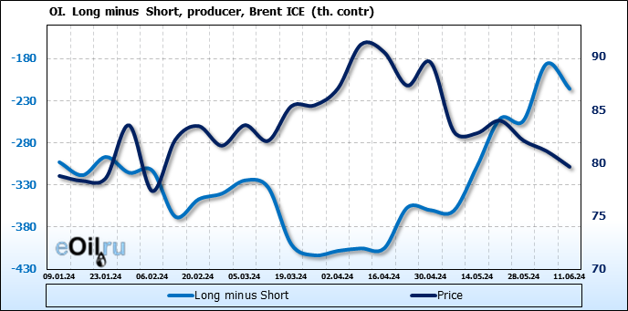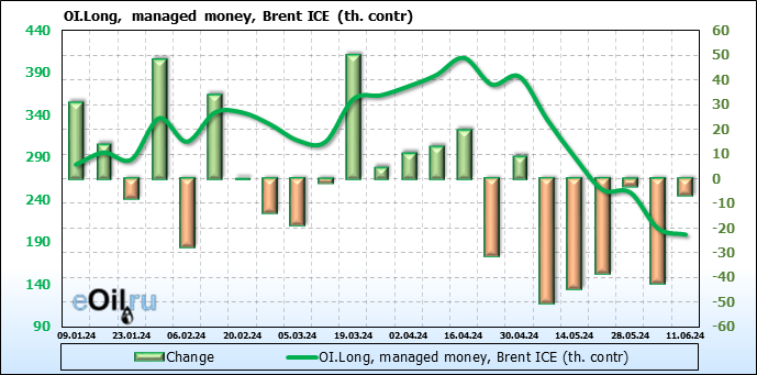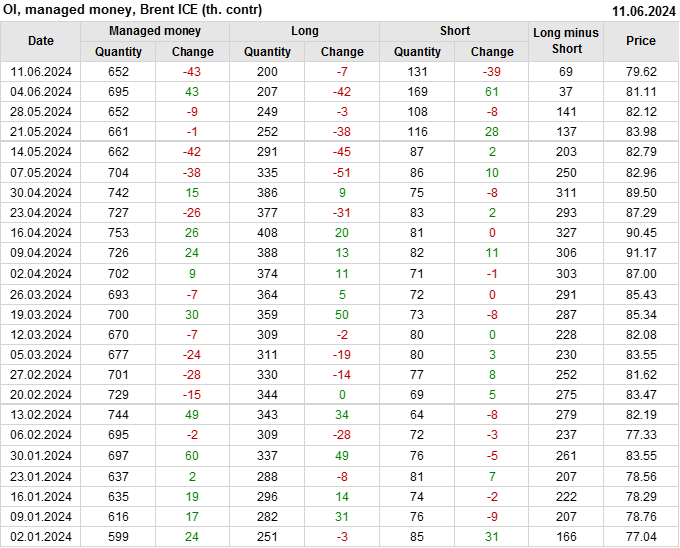 За прошедшую неделю, 05.06.24 — 11.06.24, разница между длинными и короткими позициями управляющих увеличилась на 31.4 тыс. контрактов. В тоже время, цена упала на 1.49 доллара.
