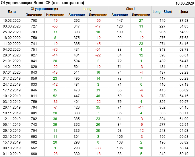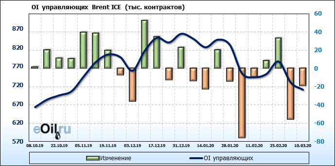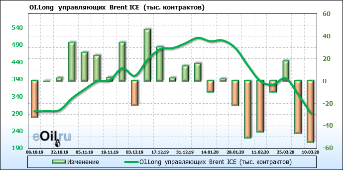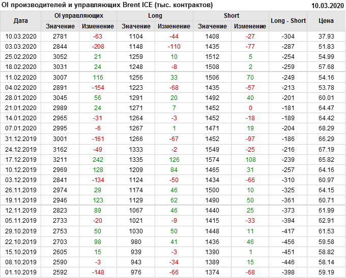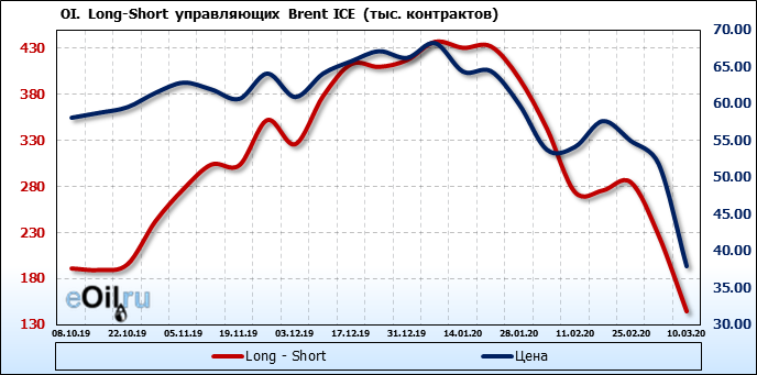 За прошлую неделю, 04.03.20 — 10.03.20, разница между длинными и короткими позициями управляющих упала на 82 тыс. контрактов. В тоже время, цена упала на 13.9 доллара. Наращивание коротких позиций спекулянтами приводит к падению цен. Если давление со стороны медведей продолжится, то мы можем увидеть новые минимумы.