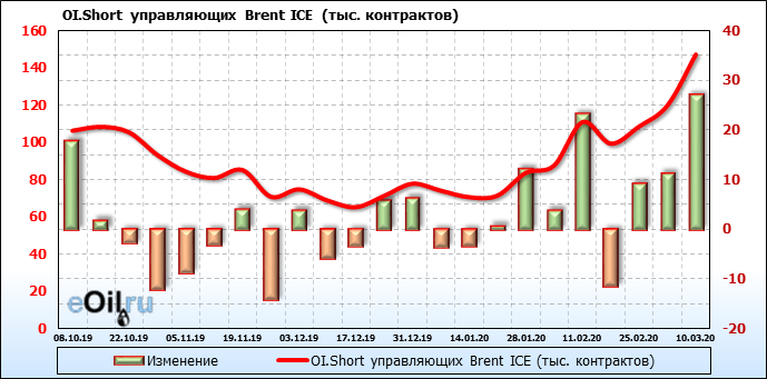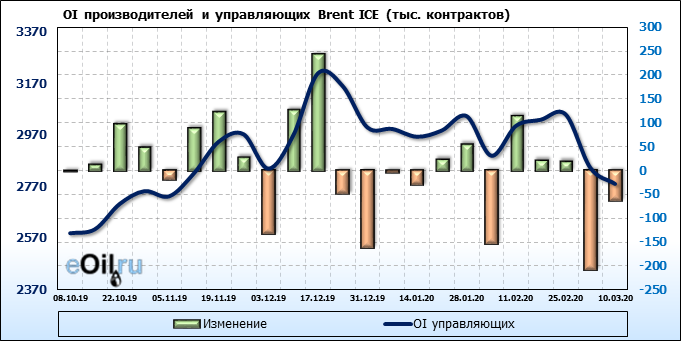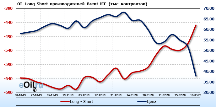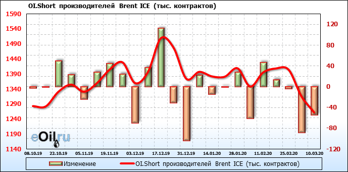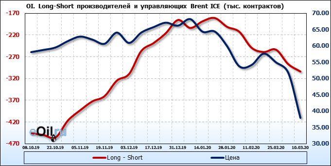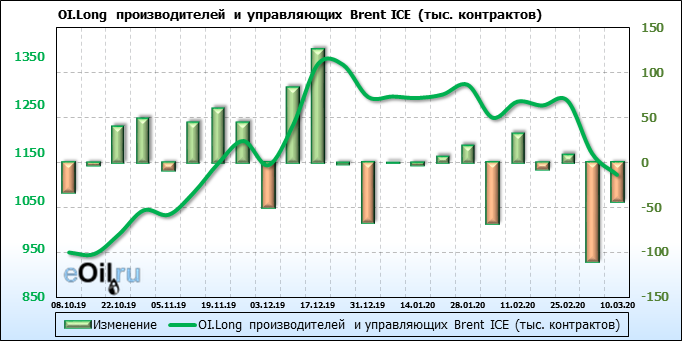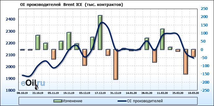 За прошлую неделю, 04.03.20 — 10.03.20, разница между длинными и короткими позициями производителей выросла на 65 тыс. контрактов. В тоже время, цена упала на 13.9 доллара. Производители перестали наращивать короткие позиции, что говорит или о непривлекательности текущих ценовых уровней для хеджирования, или о том, что часть участников рынка заняла выжидательную позицию.