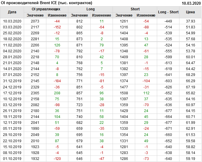 За прошлую неделю, 04.03.20 — 10.03.20, разница между длинными и короткими позициями производителей и управляющих упала на 17 тыс. контрактов. За отчетный период времени, цена упала на 13.9 доллара. Производители и управляющие на отчетной недели были склонны продавать. Суммарное число шортов было выше суммарного числа лонгов. Цены также снижаются, что создает привлекательные условия для продавцов в среднесрочной перспективе, одна — две недели.