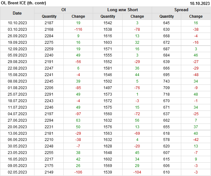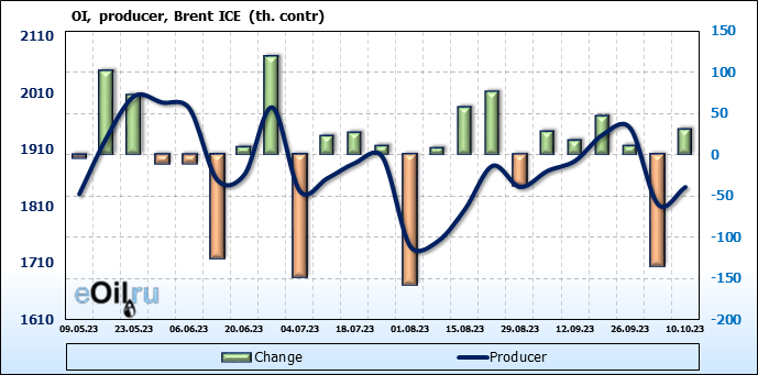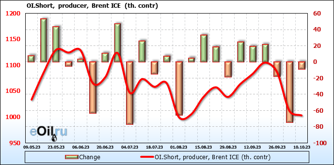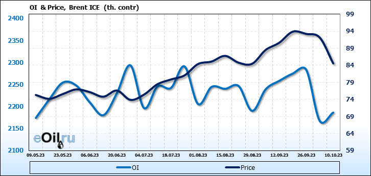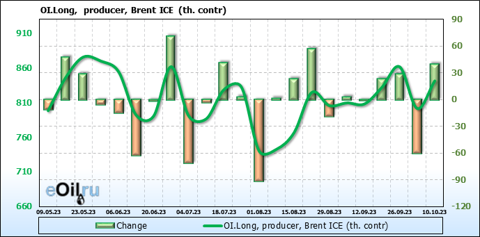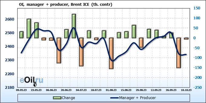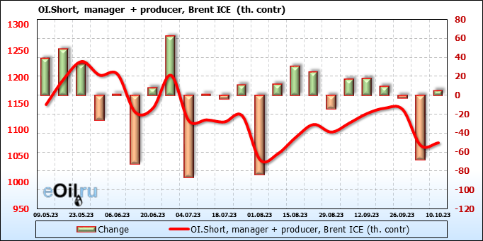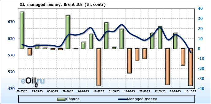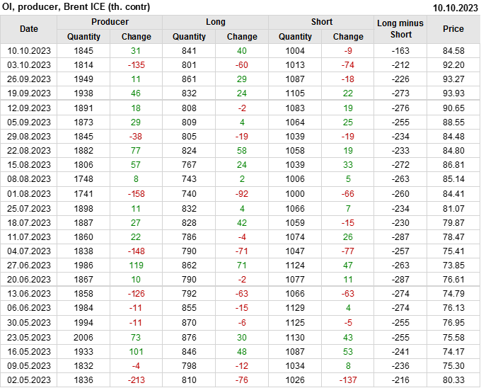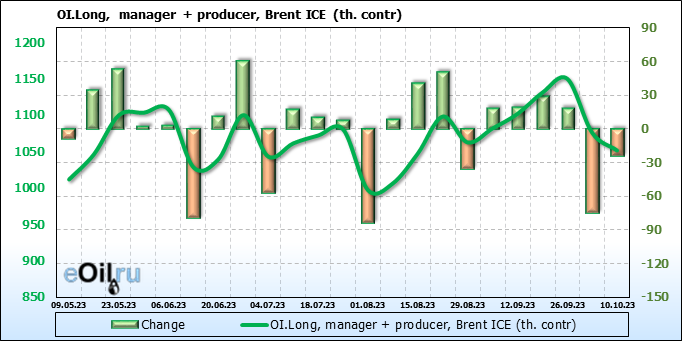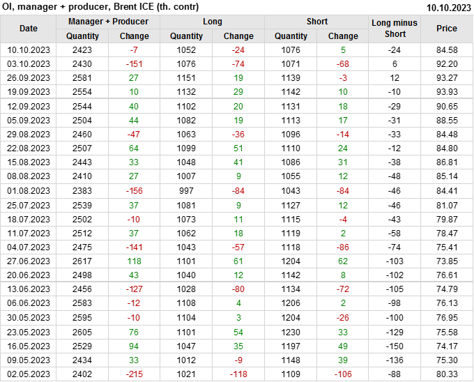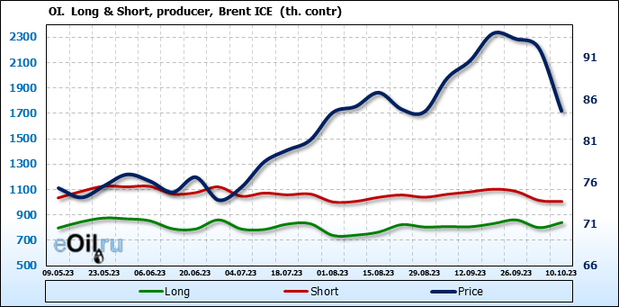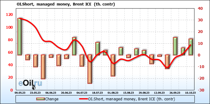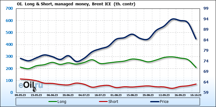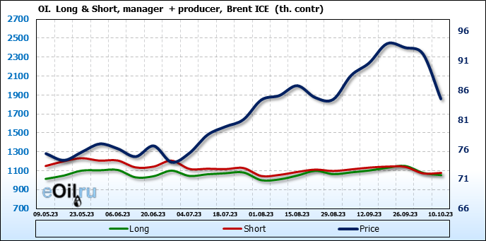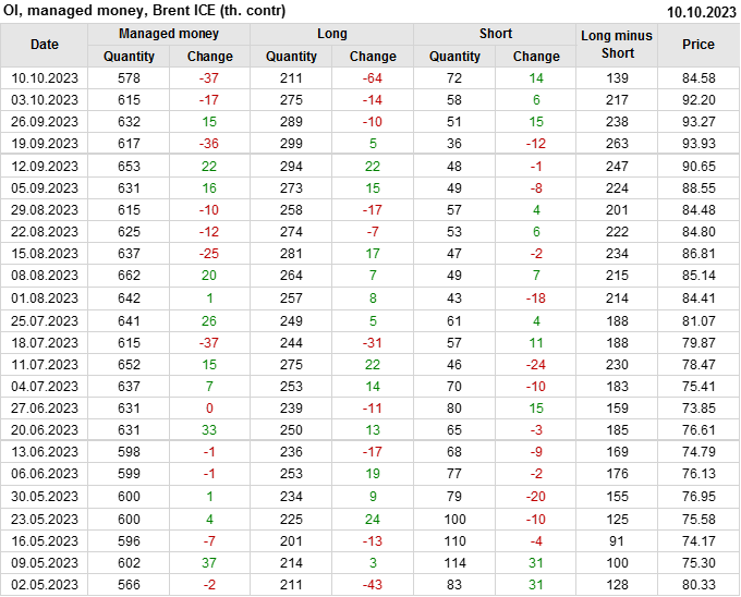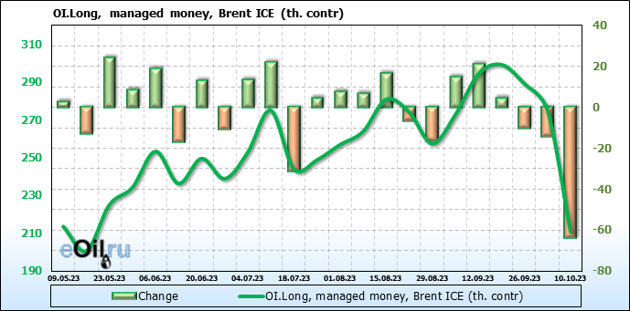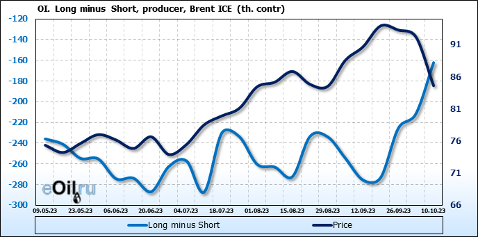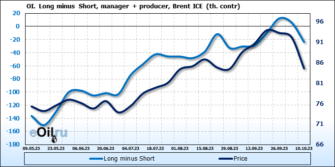 За прошедшую неделю, 04.10.23 — 10.10.23, разница между длинными и короткими позициями управляющих сократилась на 78.5 тыс. контрактов. В тоже время, цена упала на 7.62 долларов.