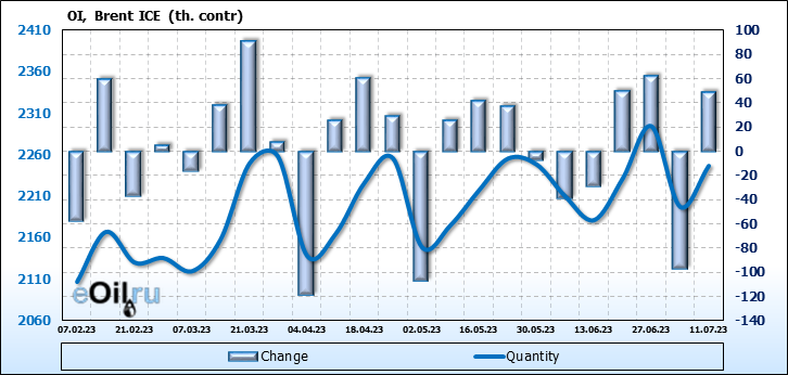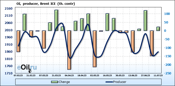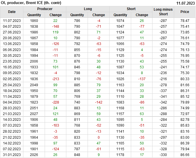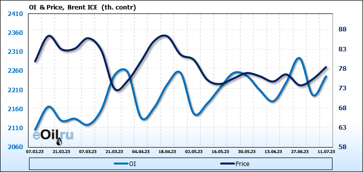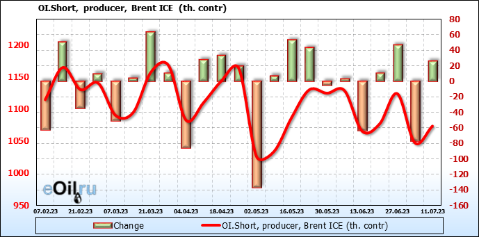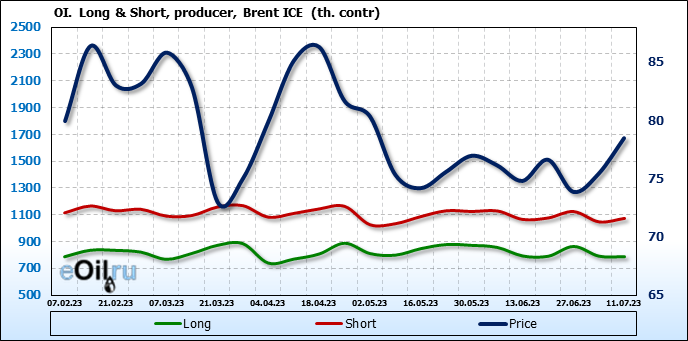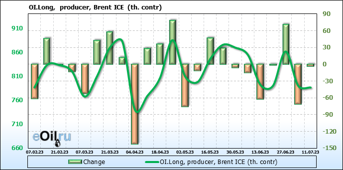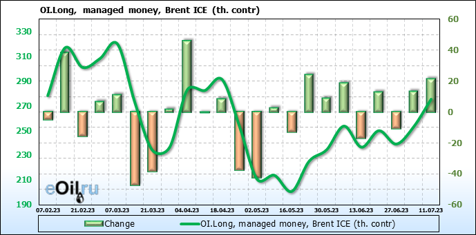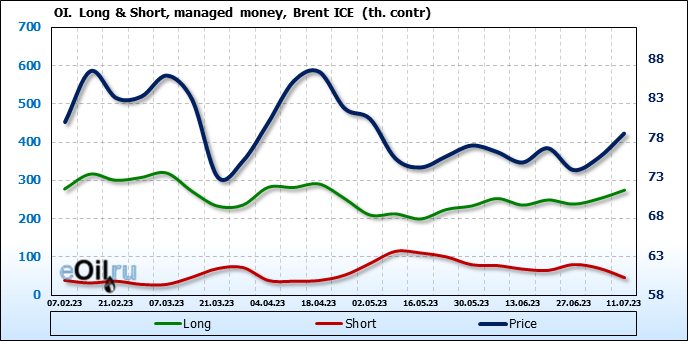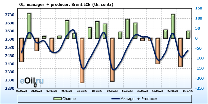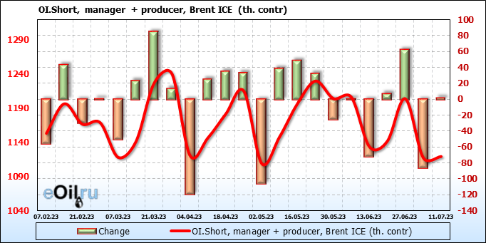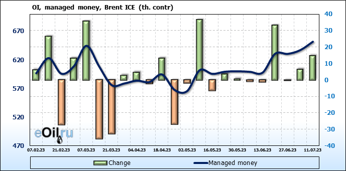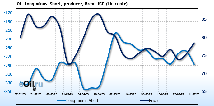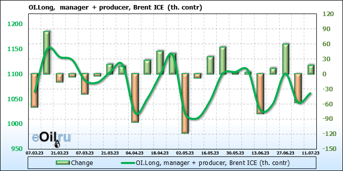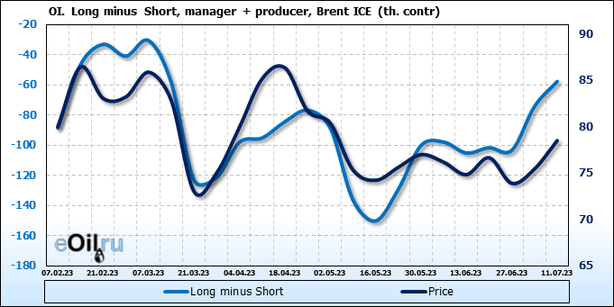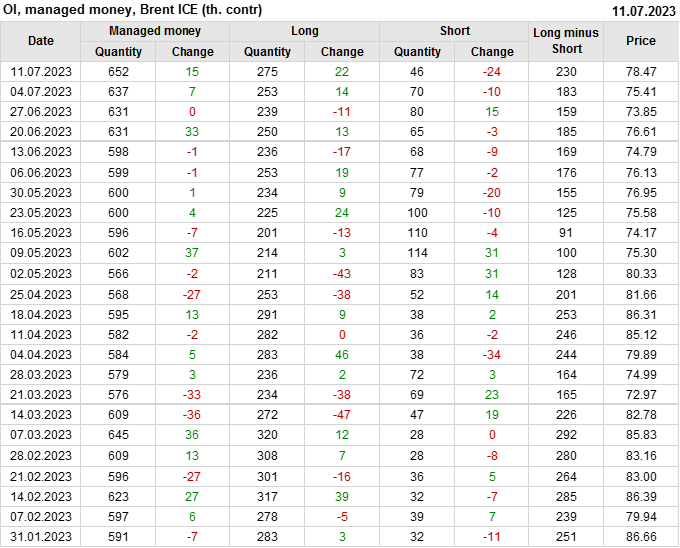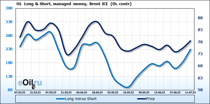 За прошедшую неделю, 05.07.23 — 11.07.23, разница между длинными и короткими позициями управляющих увеличилась на 46.7 тыс. контрактов. В тоже время, цена выросла на 3.06 доллара.