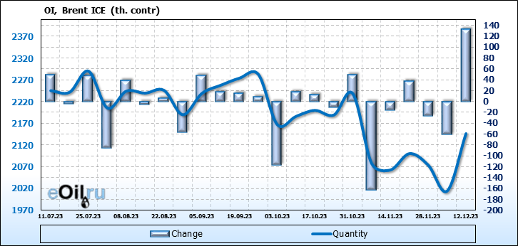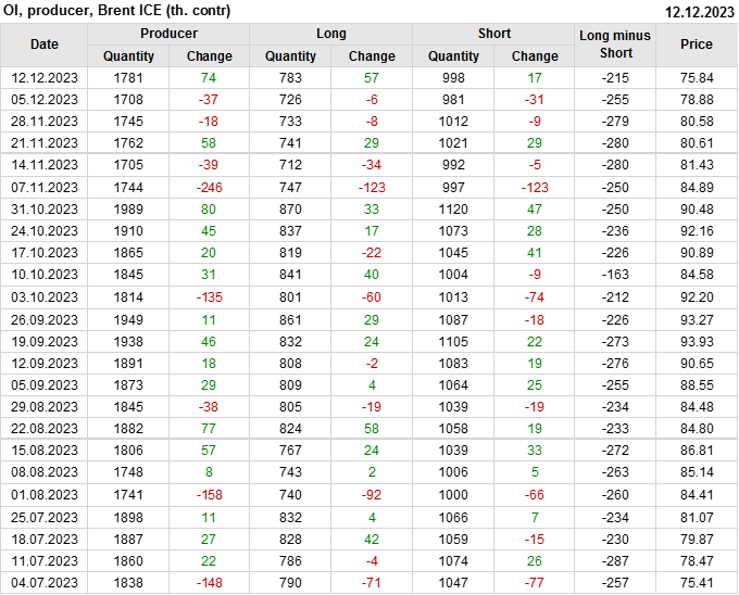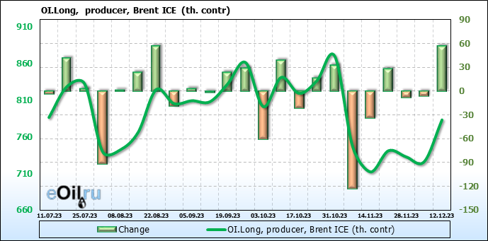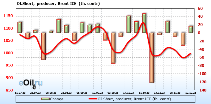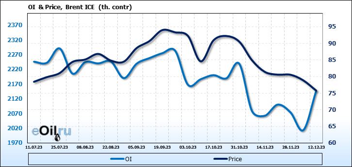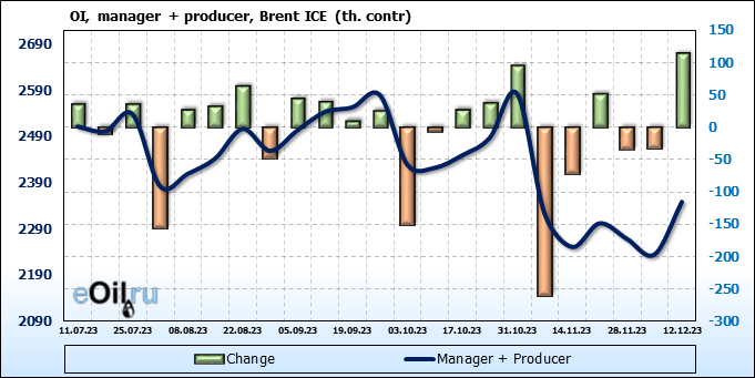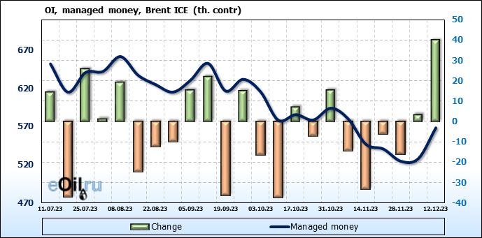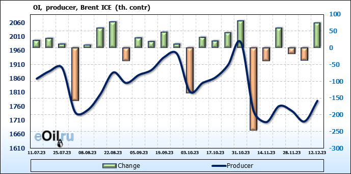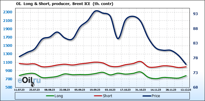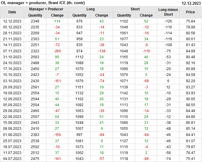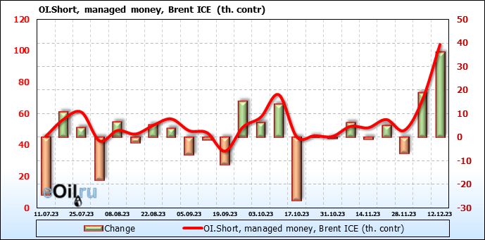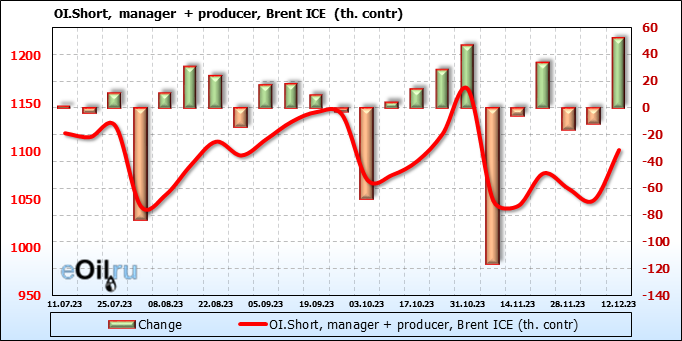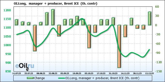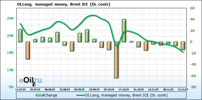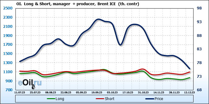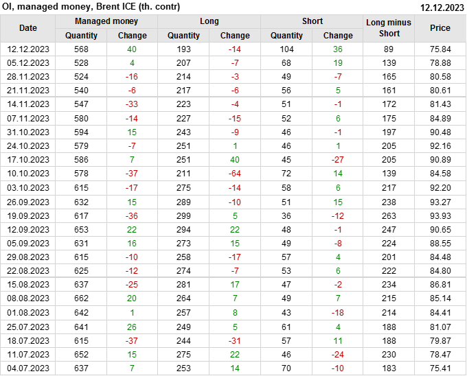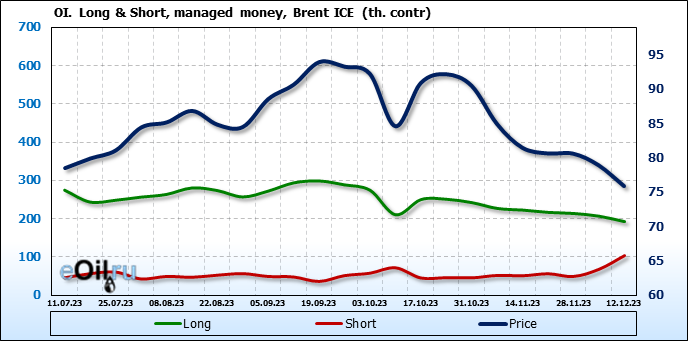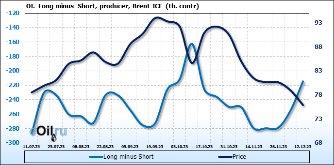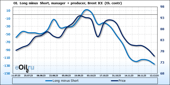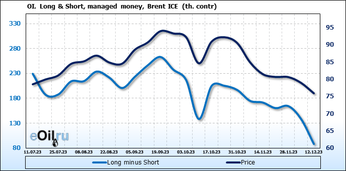 За прошедшую неделю, 06.12.23 — 12.12.23, разница между длинными и короткими позициями управляющих сократилась на 50.1 тыс. контрактов. В тоже время, цена упала на 3.04 доллара.
