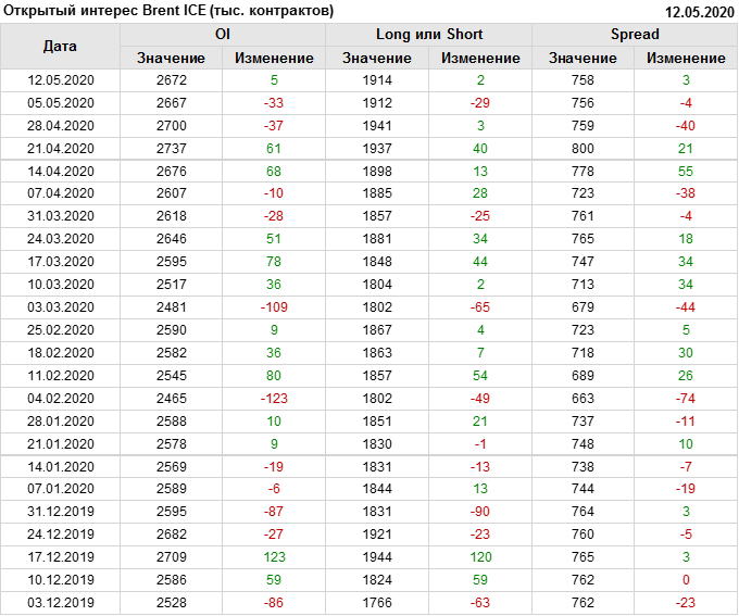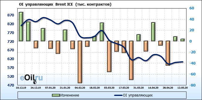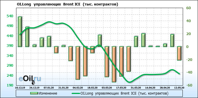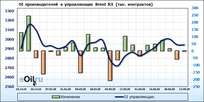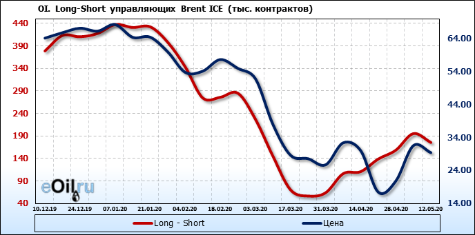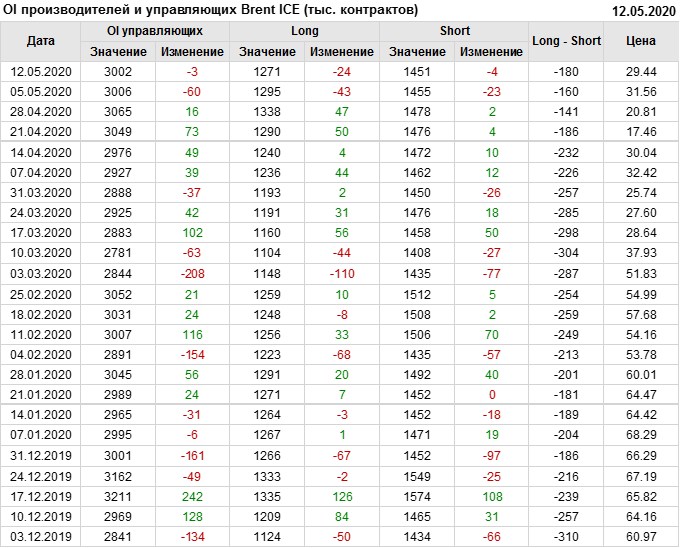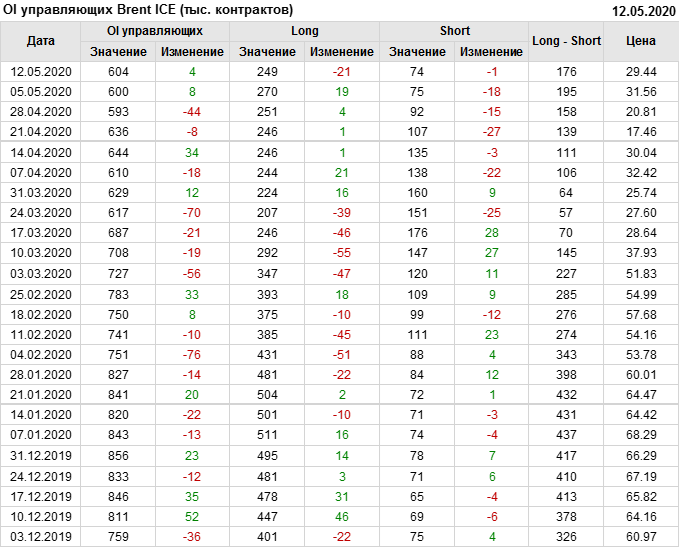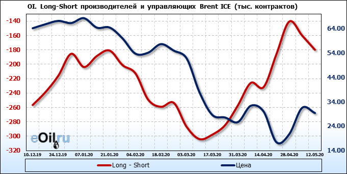 За прошлую неделю, 06.05.20 — 12.05.20, разница между длинными и короткими позициями управляющих упала на 20 тыс. контрактов. В тоже время, цена упала на 2.12 доллара. Наращивание коротких позиций спекулянтами приводит к падению цен. Если давление со стороны медведей продолжится, то мы можем увидеть новые минимумы.