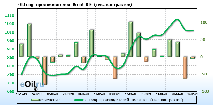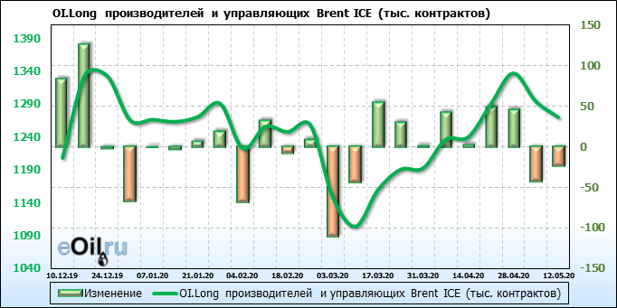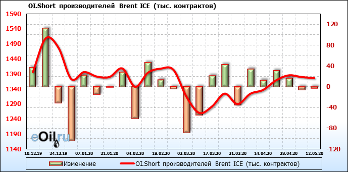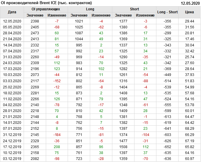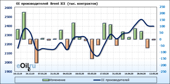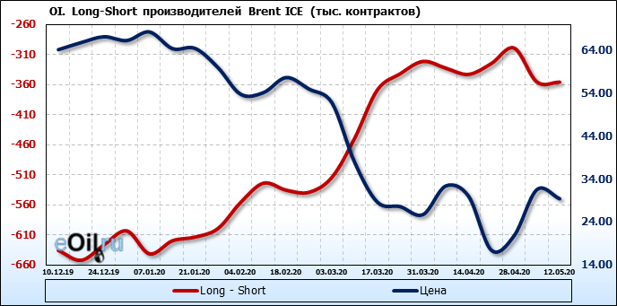 За прошлую неделю, 06.05.20 — 12.05.20, разница между длинными и короткими позициями производителей упала на 0.2 тыс. контрактов. В тоже время, цена упала на 2.12 доллара. Производители наращивают короткие позиции, что не дает цене расти. В такой ситуации на рынке возможно ускорение падения цен.