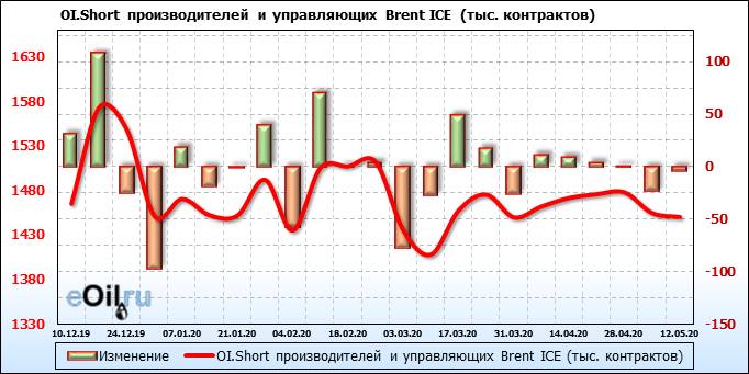 За прошлую неделю, 06.05.20 — 12.05.20, разница между длинными и короткими позициями производителей и управляющих упала на 20 тыс. контрактов. За отчетный период времени, цена упала на 2.12 доллара. Производители и управляющие на отчетной недели были склонны продавать. Суммарное число шортов было выше суммарного числа лонгов. Цены также снижаются, что создает привлекательные условия для продавцов в среднесрочной перспективе, одна — две недели.