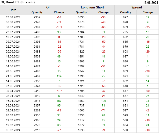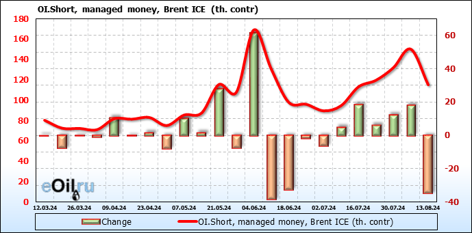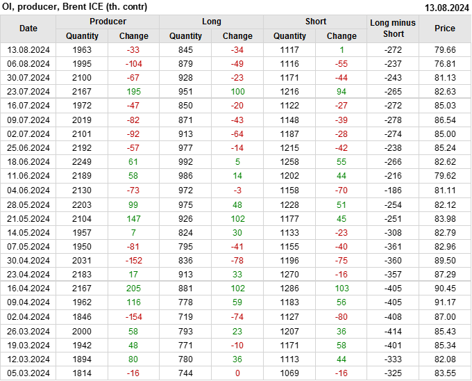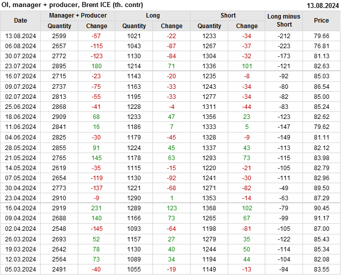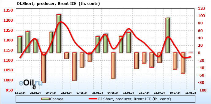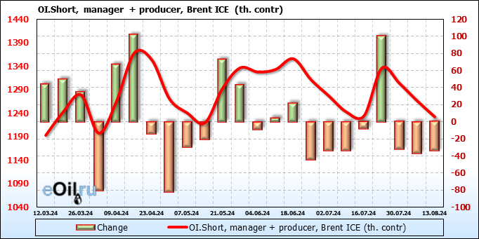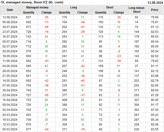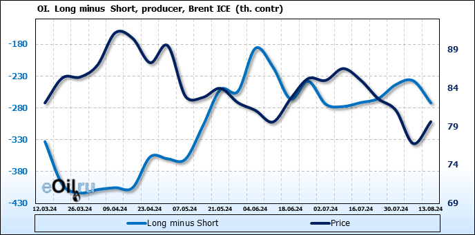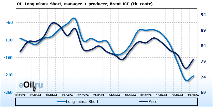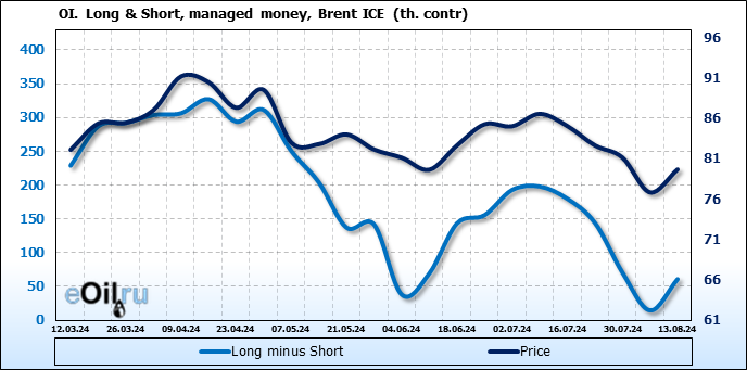 За прошедшую неделю, 07.08.24 — 13.08.24, разница между длинными и короткими позициями управляющих увеличилась на 46.4 тыс. контрактов. В тоже время, цена выросла на 2.85 доллара.