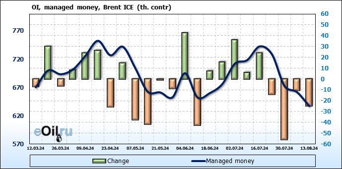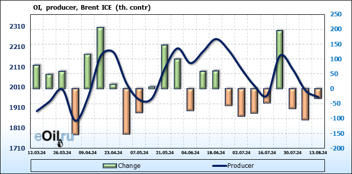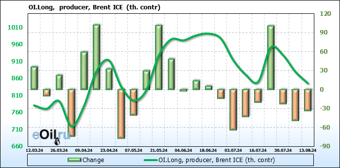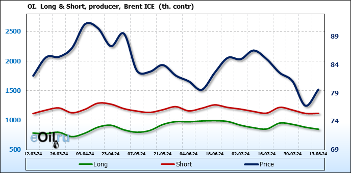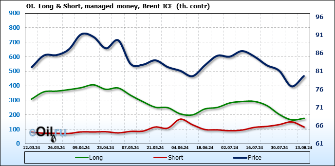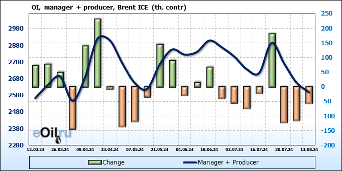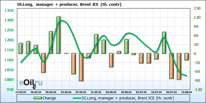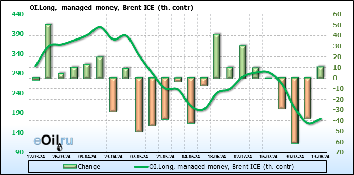 За прошедшую неделю, 07.08.24 — 13.08.24, разница между длинными и короткими позициями управляющих увеличилась на 46.4 тыс. контрактов. В тоже время, цена выросла на 2.85 доллара.