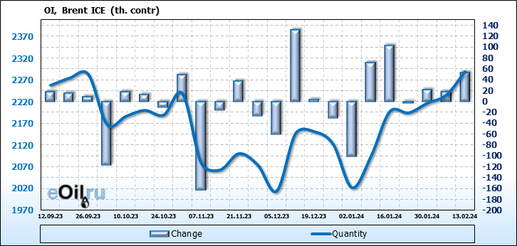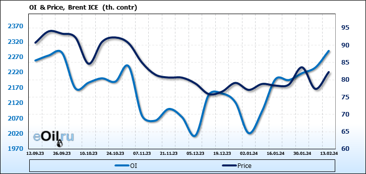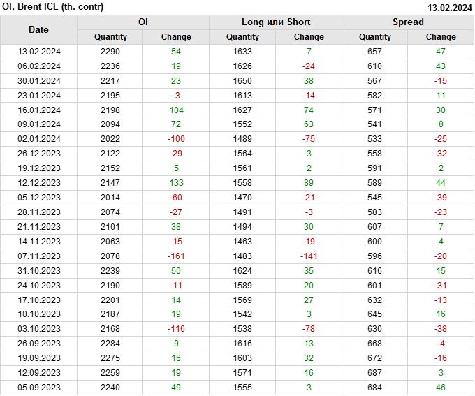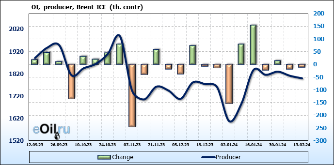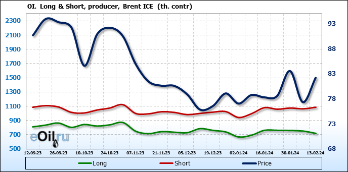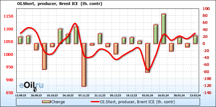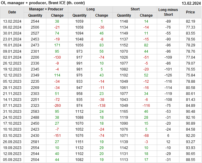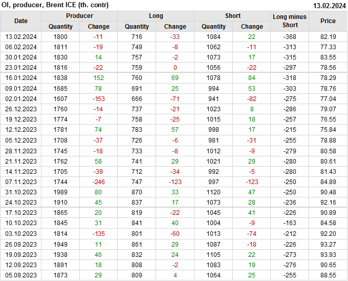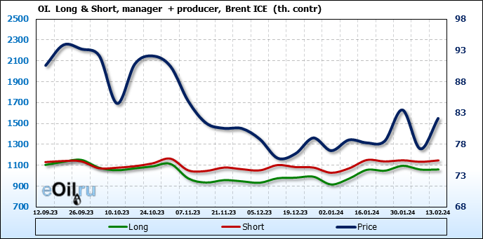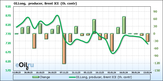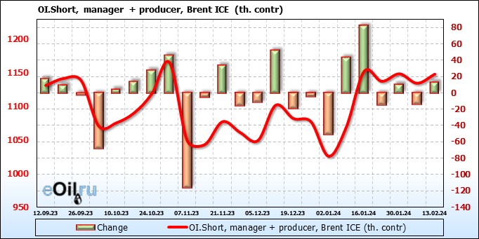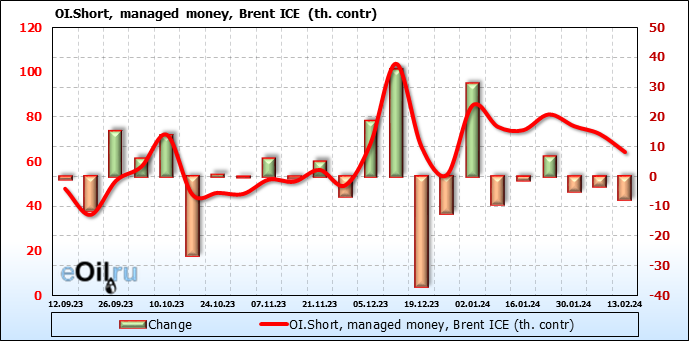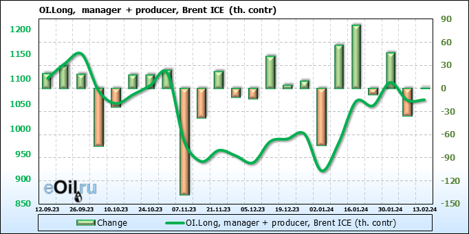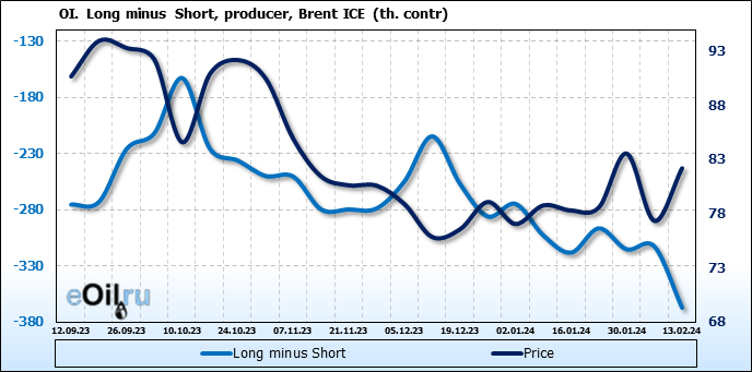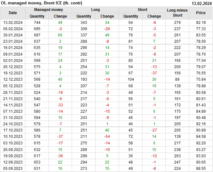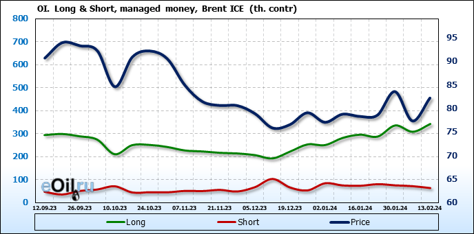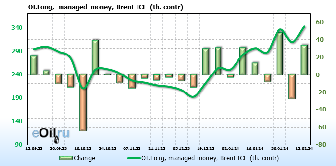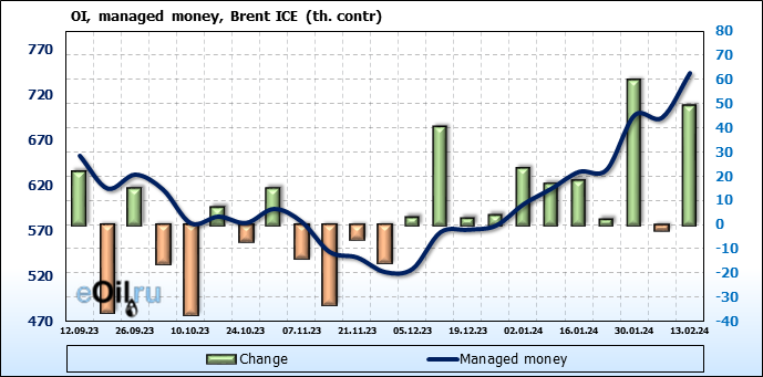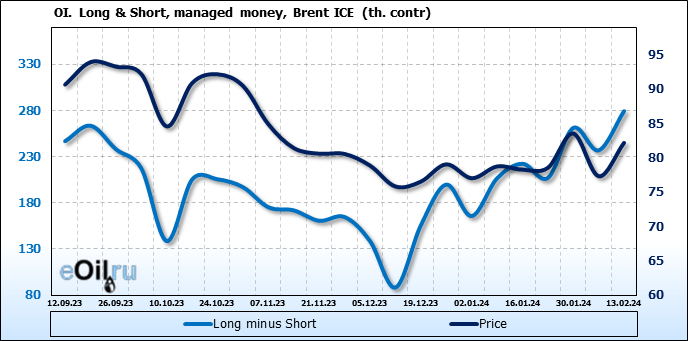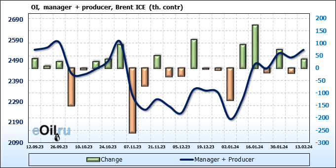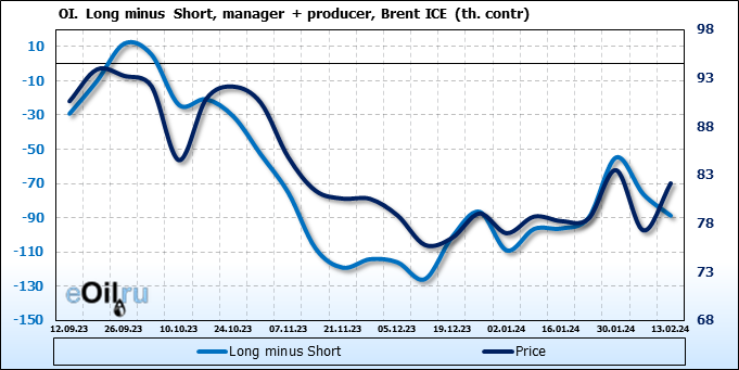 За прошедшую неделю, 07.02.24 — 13.02.24, разница между длинными и короткими позициями управляющих увеличилась на 42.2 тыс. контрактов. В тоже время, цена выросла на 4.86 доллара.