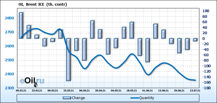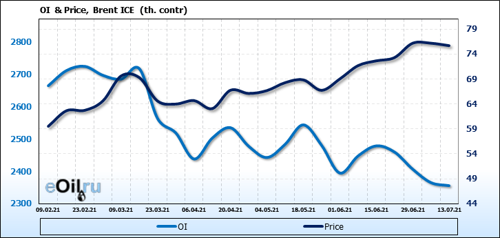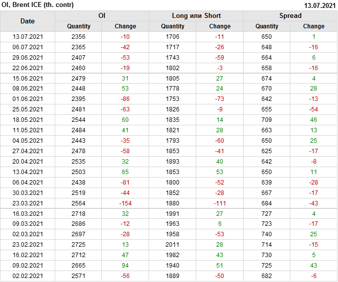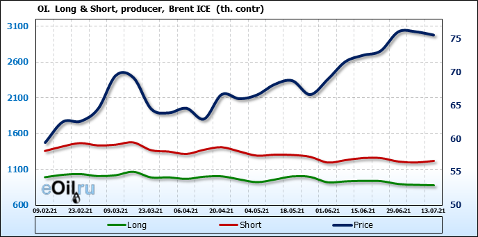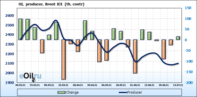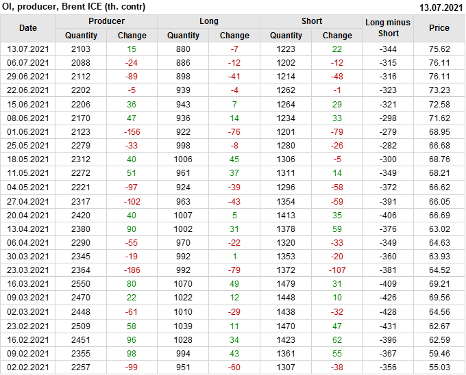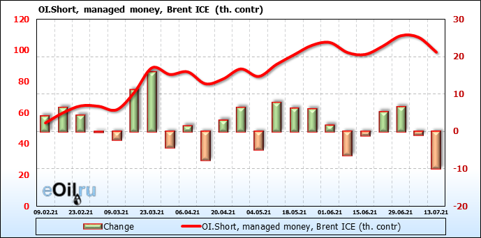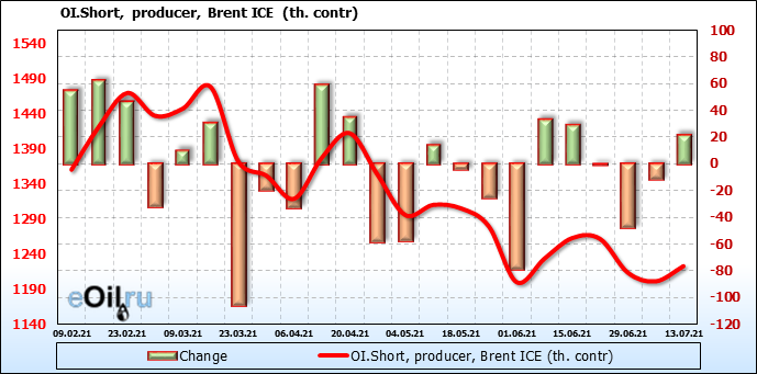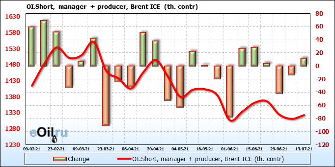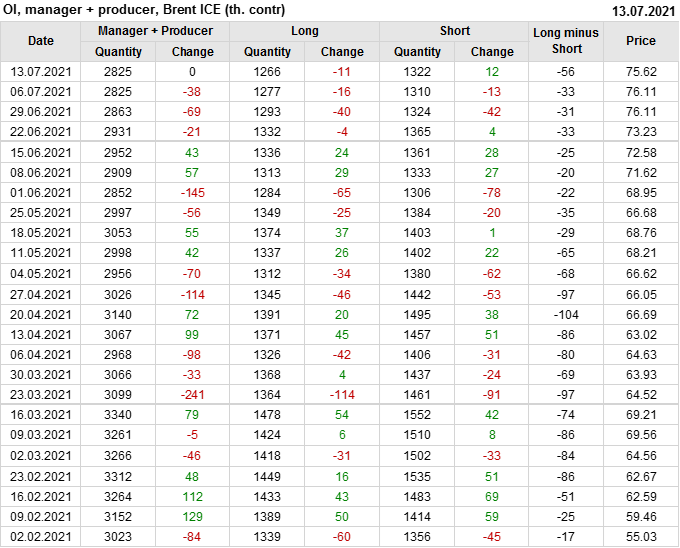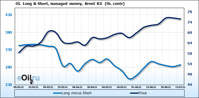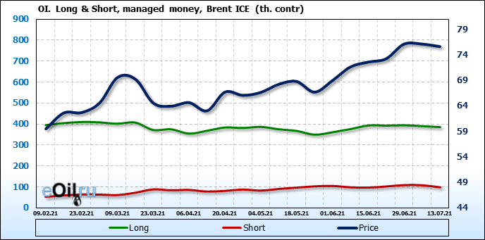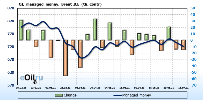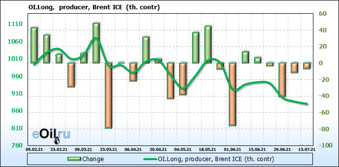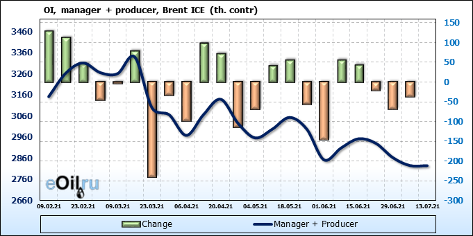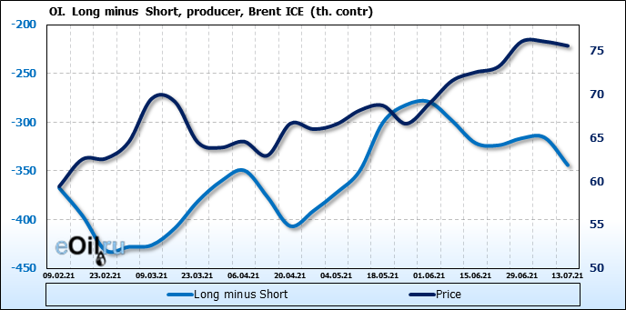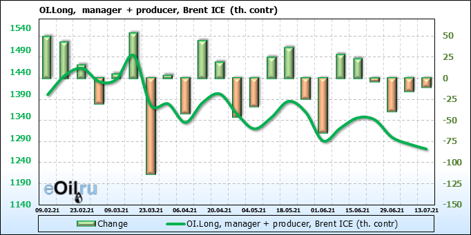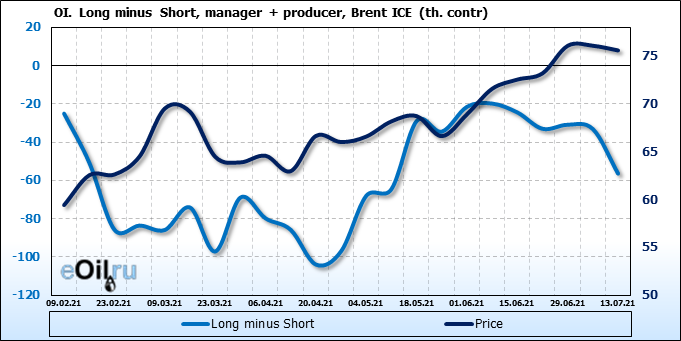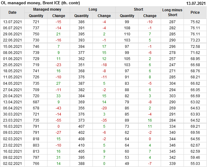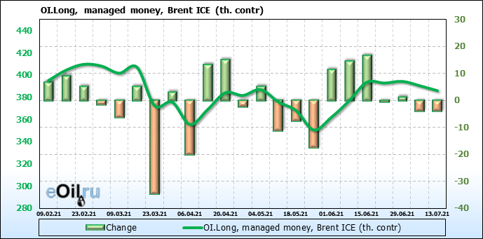 За прошедшую неделю, 07.07.21 — 13.07.21, разница между длинными и короткими позициями управляющих увеличилась на 5.1 тыс. контрактов. В тоже время, цена упала на 0.49 доллара.