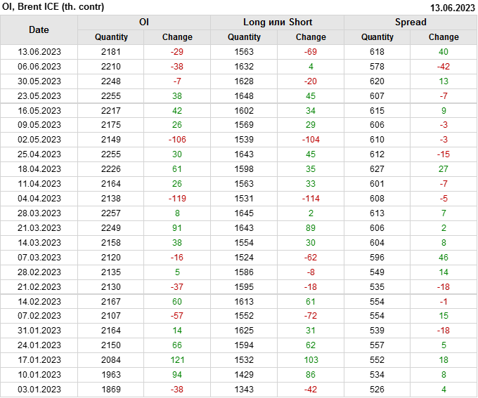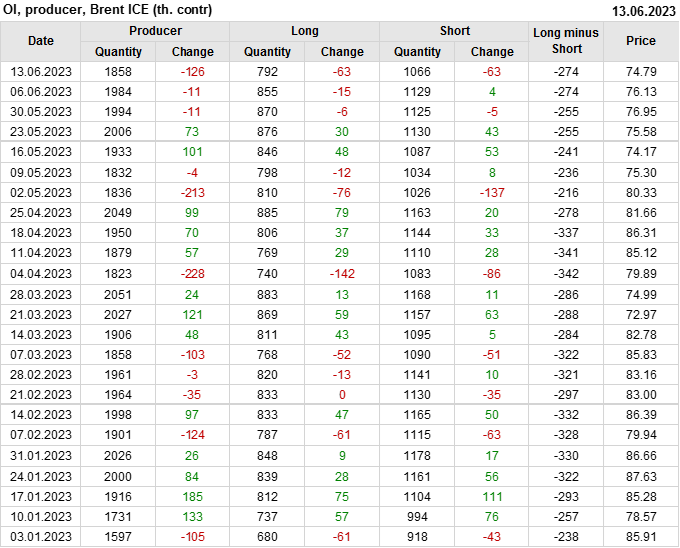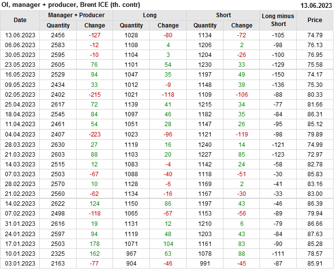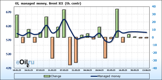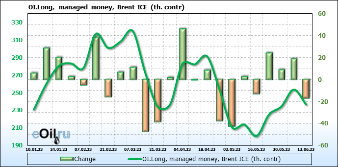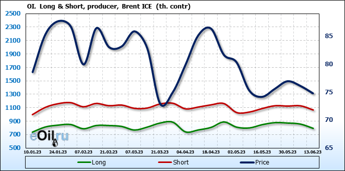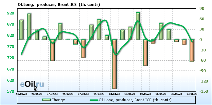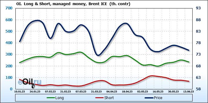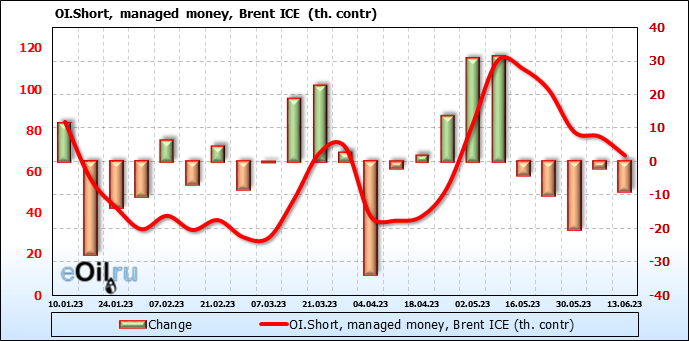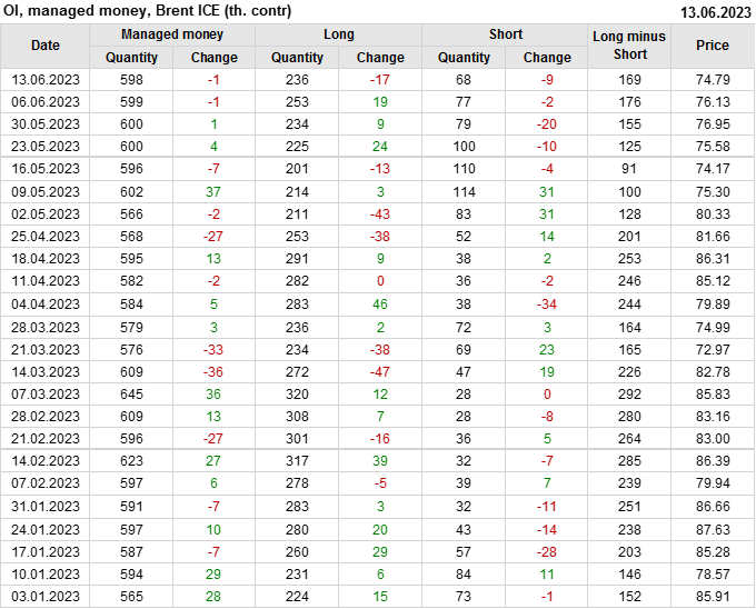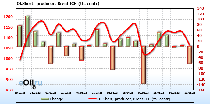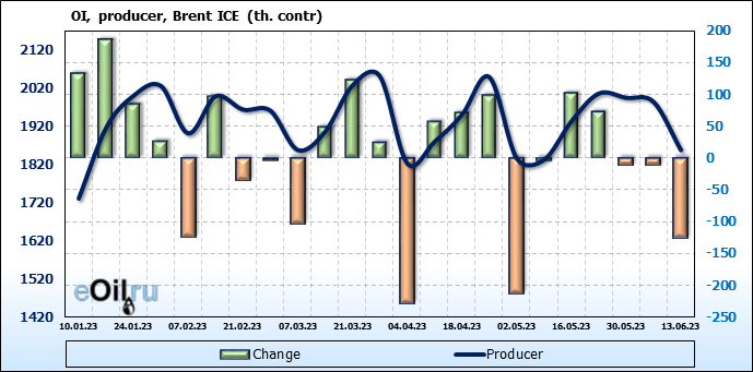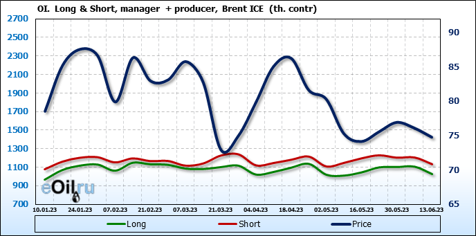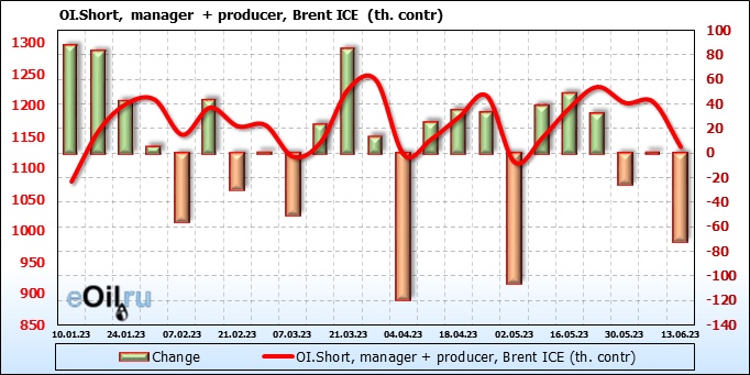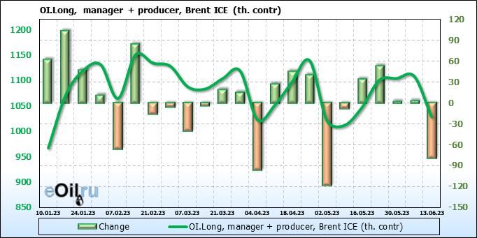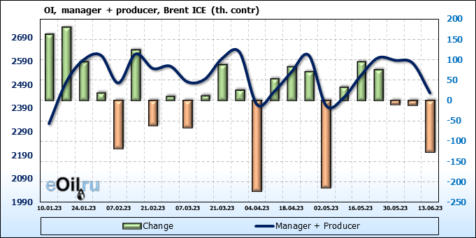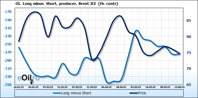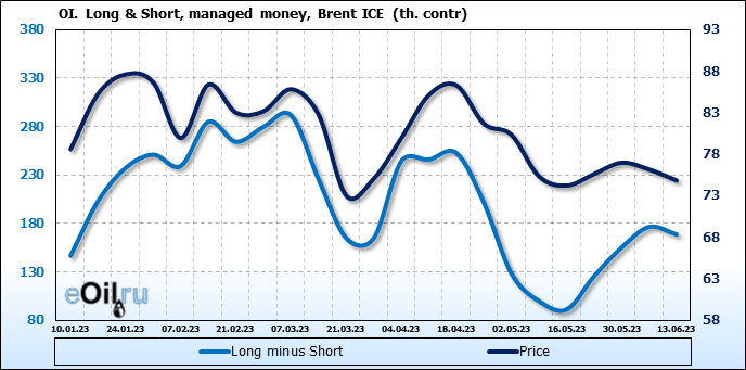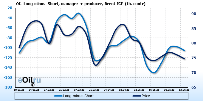 За прошедшую неделю, 07.06.23 — 13.06.23, разница между длинными и короткими позициями управляющих сократилась на 7.8 тыс. контрактов. В тоже время, цена упала на 1.34 доллара.