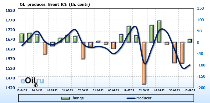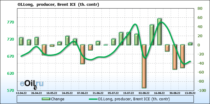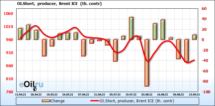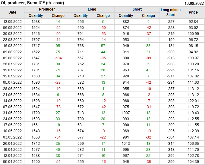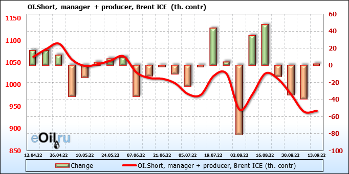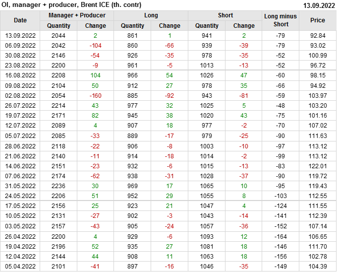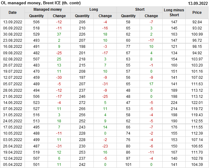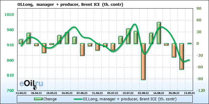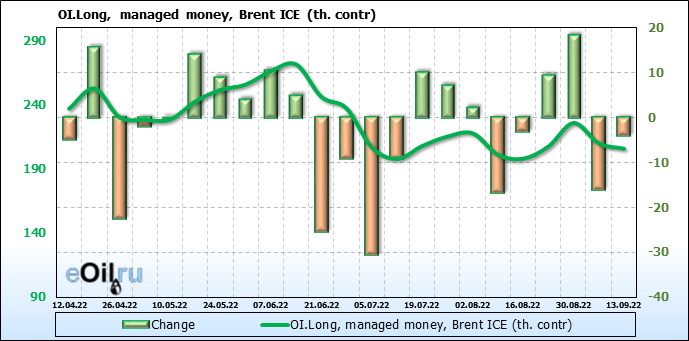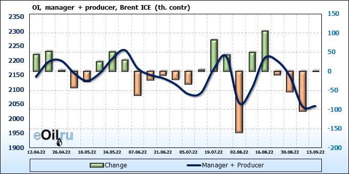 За прошедшую неделю, 07.09.22 — 13.09.22, разница между длинными и короткими позициями управляющих увеличилась на 2.8 тыс. контрактов. В тоже время, цена упала на 0.18 доллара.