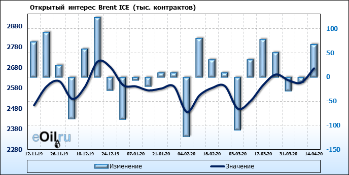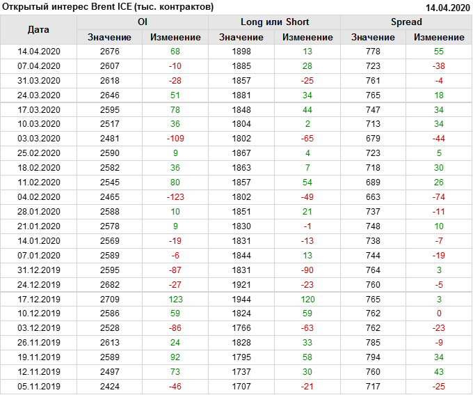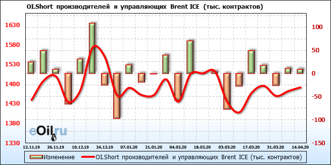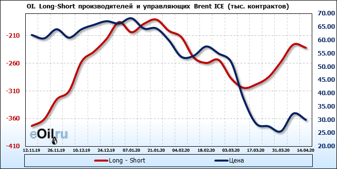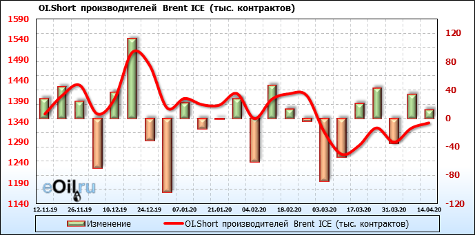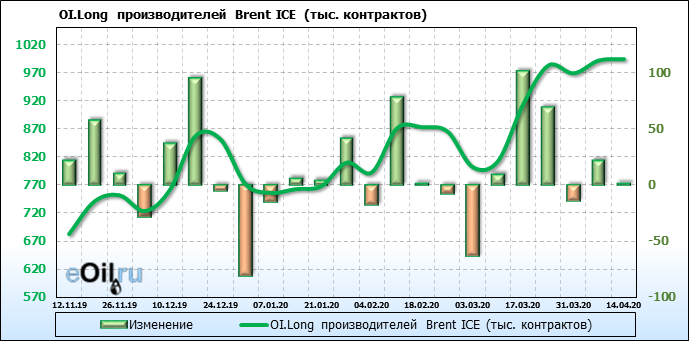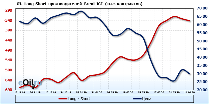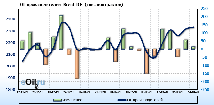 За прошлую неделю, 08.04.20 — 14.04.20, разница между длинными и короткими позициями производителей упала на 10 тыс. контрактов. В тоже время, цена упала на 2.38 доллара. Производители наращивают короткие позиции, что не дает цене расти. В такой ситуации на рынке возможно ускорение падения цен.