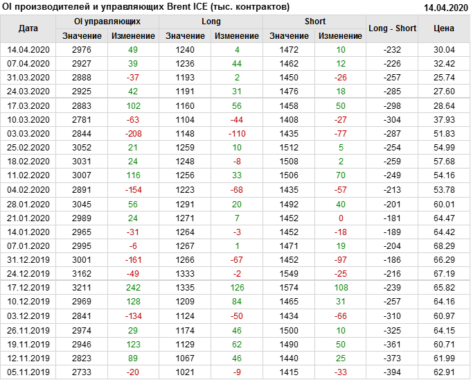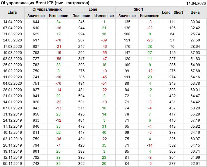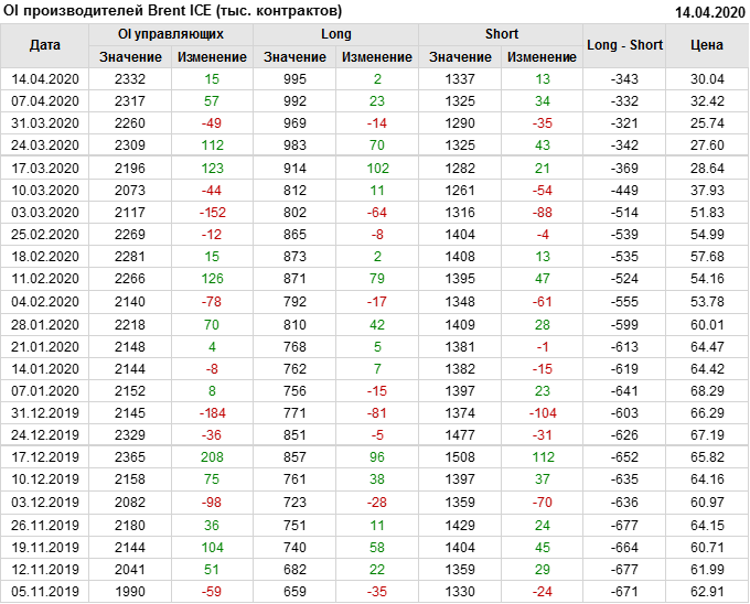 За прошлую неделю, 08.04.20 — 14.04.20, разница между длинными и короткими позициями производителей и управляющих упала на 6 тыс. контрактов. За отчетный период времени, цена упала на 2.38 доллара. Производители и управляющие на отчетной недели были склонны продавать. Суммарное число шортов было выше суммарного числа лонгов. Цены также снижаются, что создает привлекательные условия для продавцов в среднесрочной перспективе, одна — две недели.