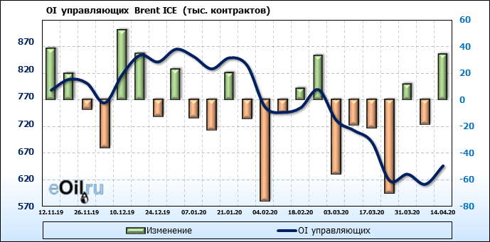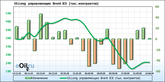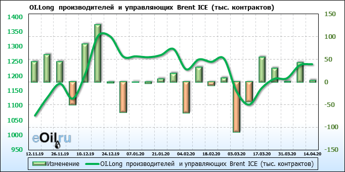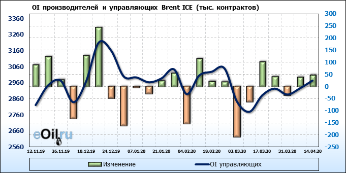 За прошлую неделю, 08.04.20 — 14.04.20, разница между длинными и короткими позициями управляющих выросла на 5 тыс. контрактов. В тоже время, цена упала на 2.38 доллара. Управляющие наращивают длинные позиции, что отражает их видение возможностей роста цены в ближайшее время, и это несмотря на то, что цены на отчетной неделе падали. Если давление со стороны покупателей будет продолжено, рынок развернется вверх.