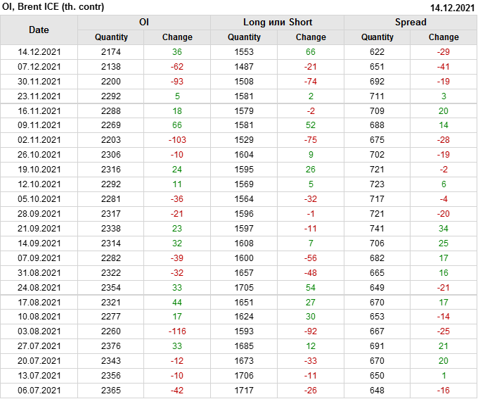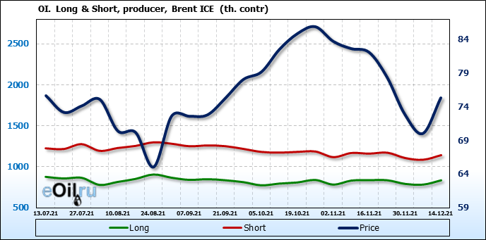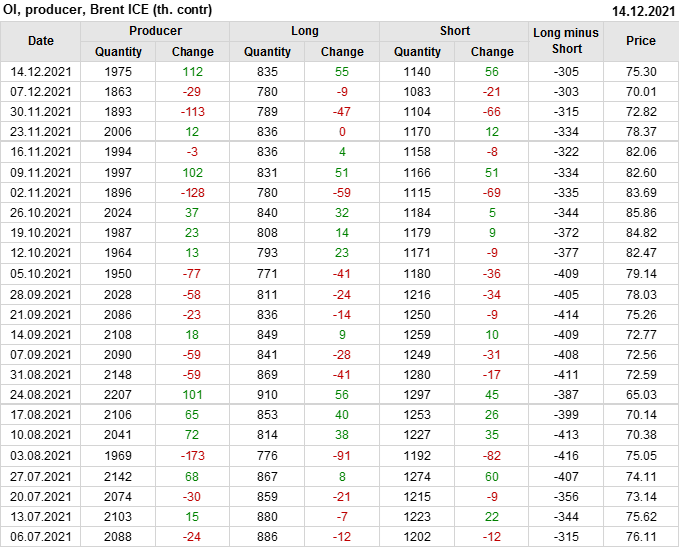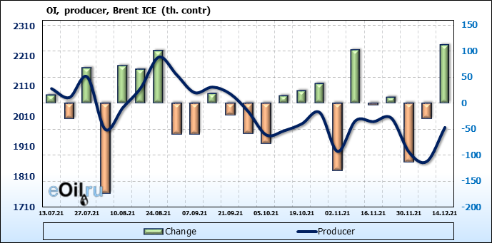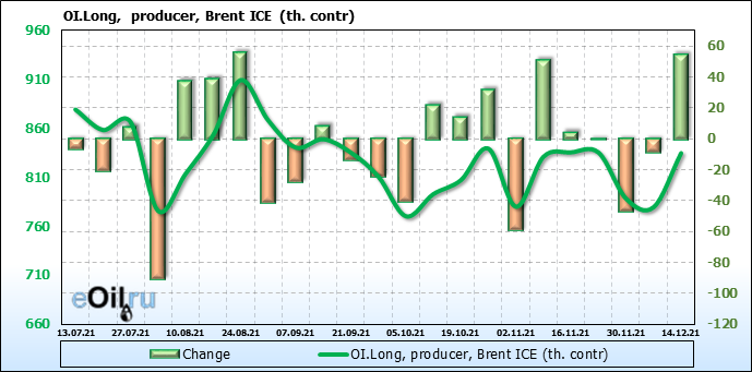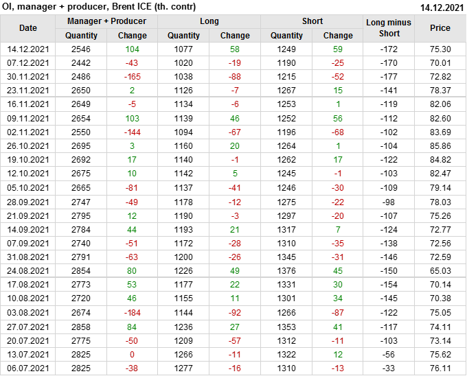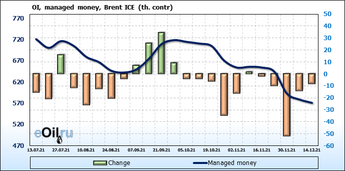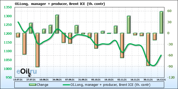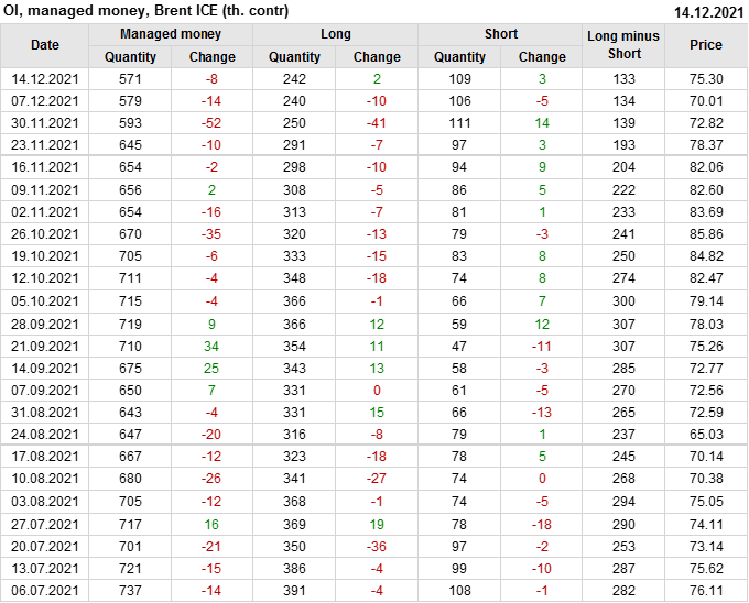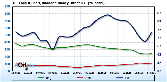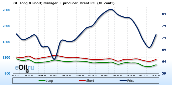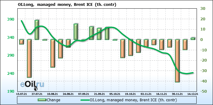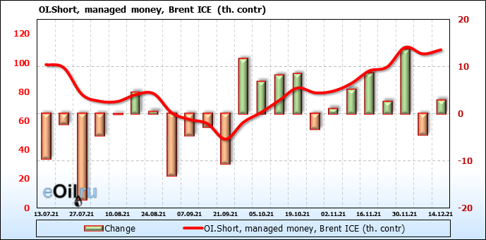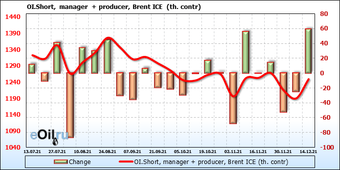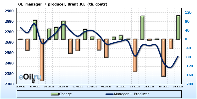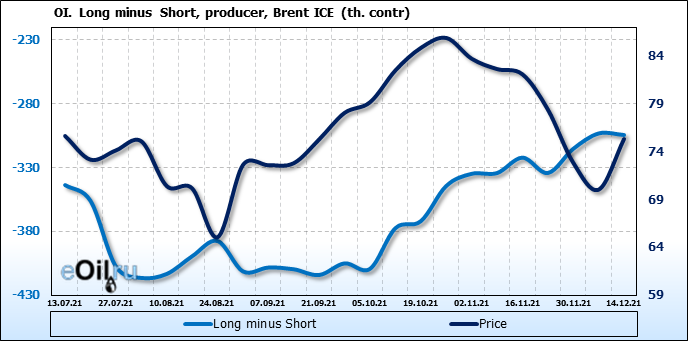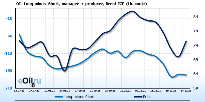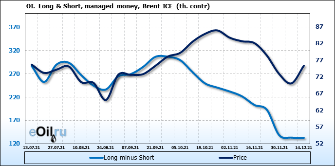 За прошедшую неделю, 08.12.21 — 14.12.21, разница между длинными и короткими позициями управляющих сократилась на 0.5 тыс. контрактов. В тоже время, цена выросла на 5.29 доллара.