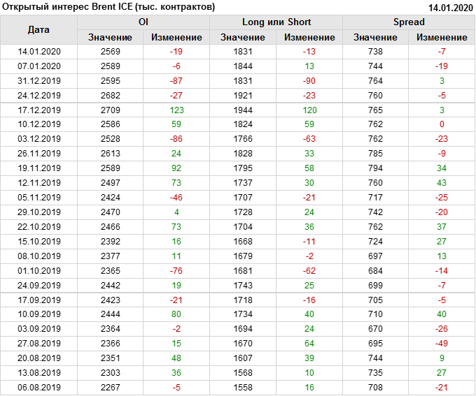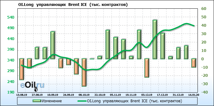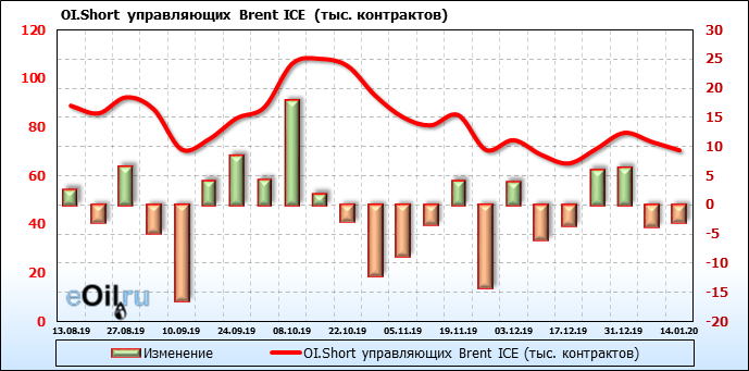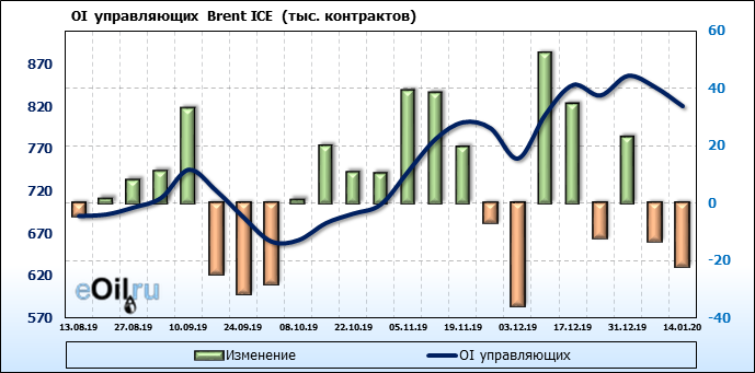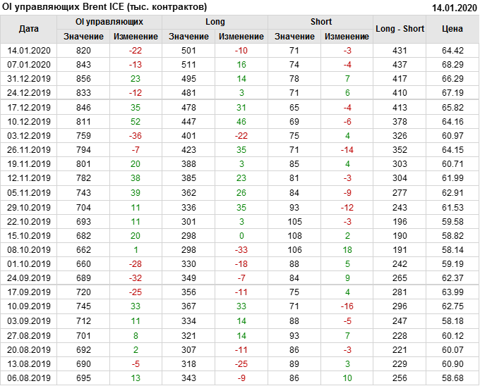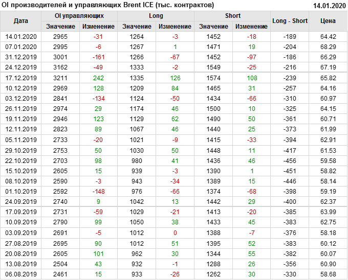 За прошлую неделю, 08.01.20 — 14.01.20, разница между длинными и короткими позициями управляющих упала на 6 тыс. контрактов. В тоже время, цена упала на 3.87 доллара. Наращивание коротких позиций спекулянтами приводит к падению цен. Если давление со стороны медведей продолжится, то мы можем увидеть новые минимумы.