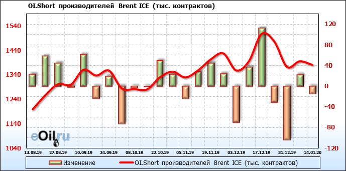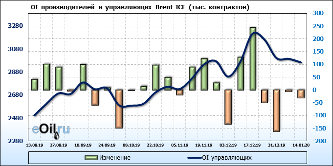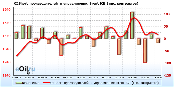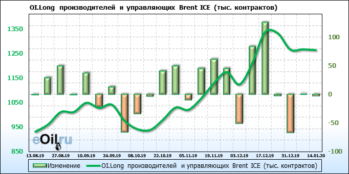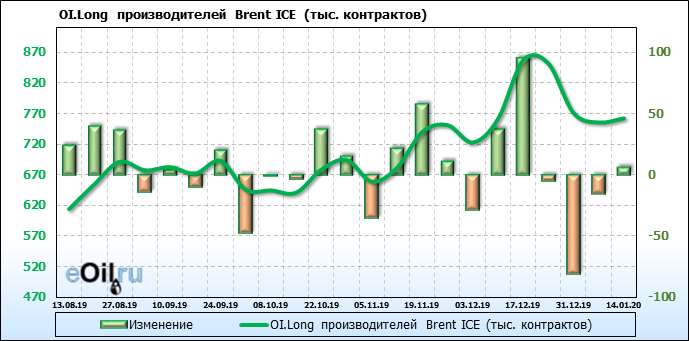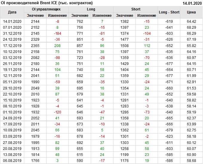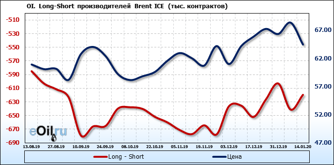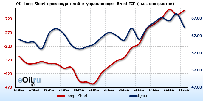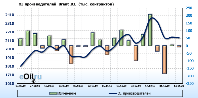 За прошлую неделю, 08.01.20 — 14.01.20, разница между длинными и короткими позициями производителей выросла на 22 тыс. контрактов. В тоже время, цена упала на 3.87 доллара. Производители перестали наращивать короткие позиции, что говорит или о непривлекательности текущих ценовых уровней для хеджирования, или о том, что часть участников рынка заняла выжидательную позицию.