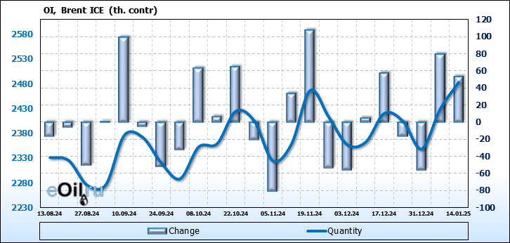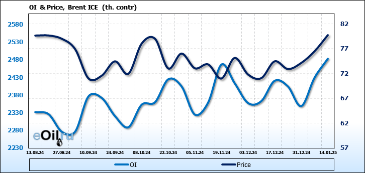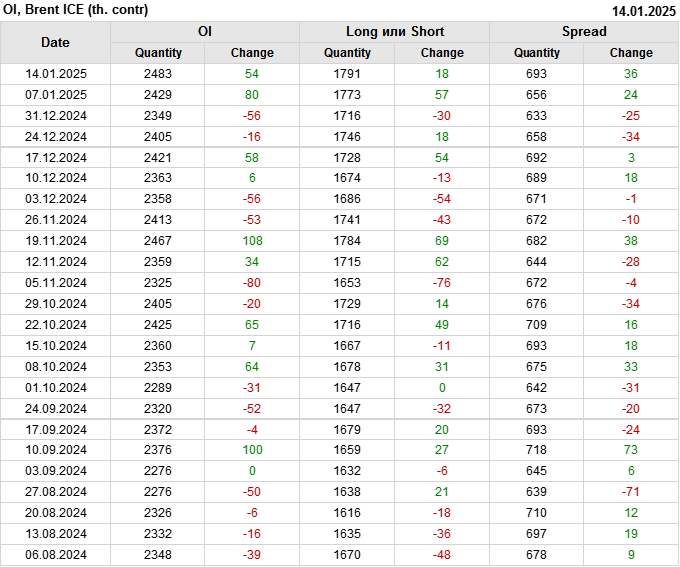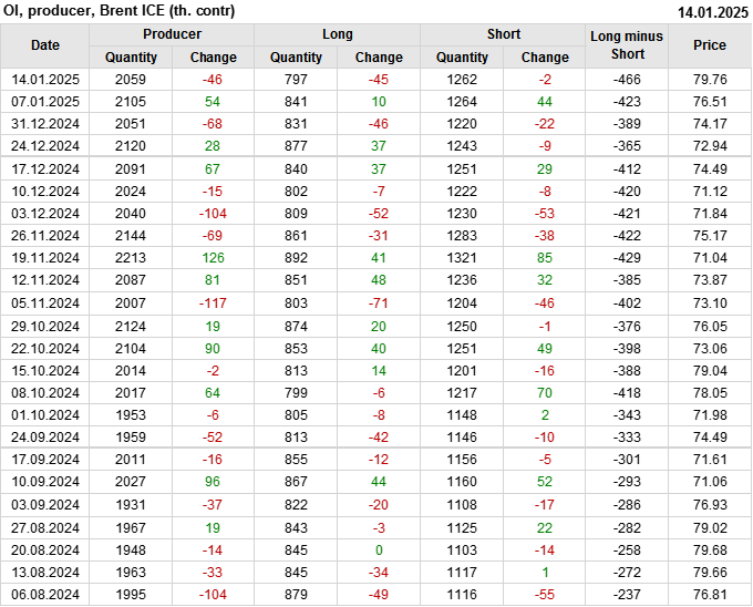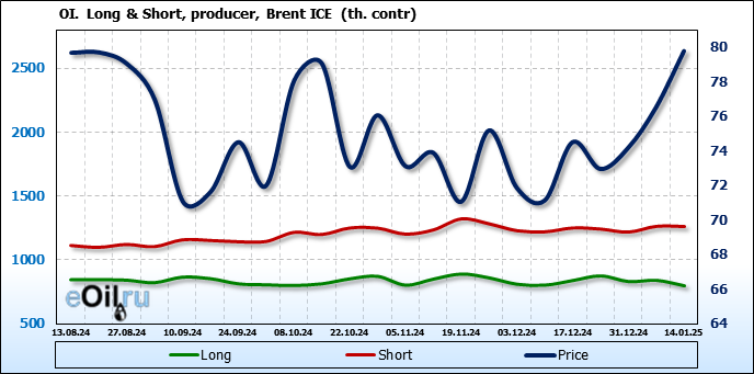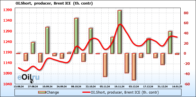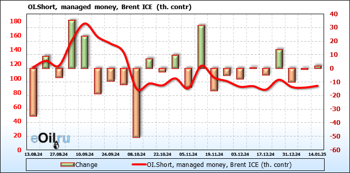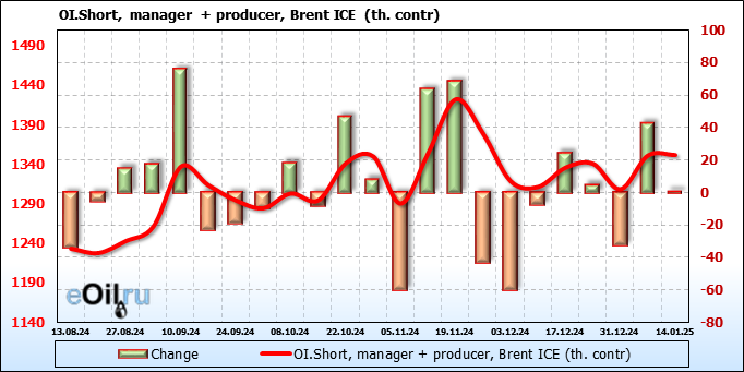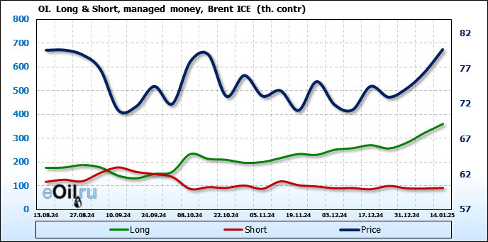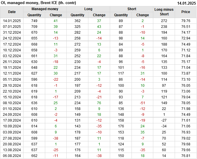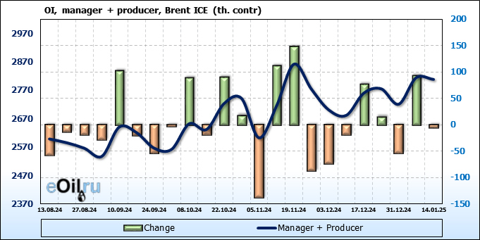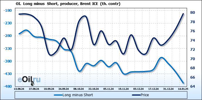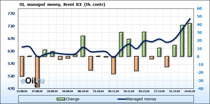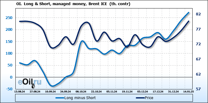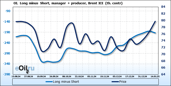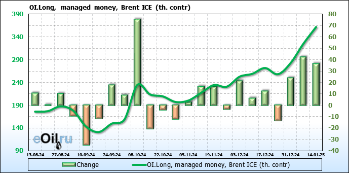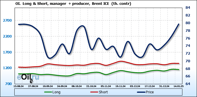 За прошедшую неделю, 08.01.25 — 14.01.25, разница между длинными и короткими позициями управляющих увеличилась на 34.4 тыс. контрактов. В тоже время, цена выросла на 3.25 доллара.