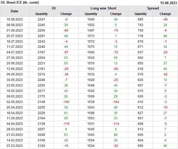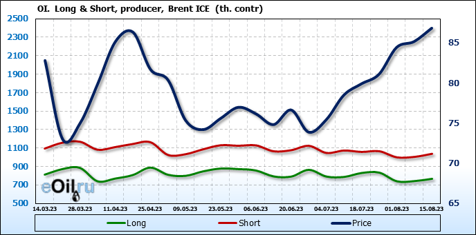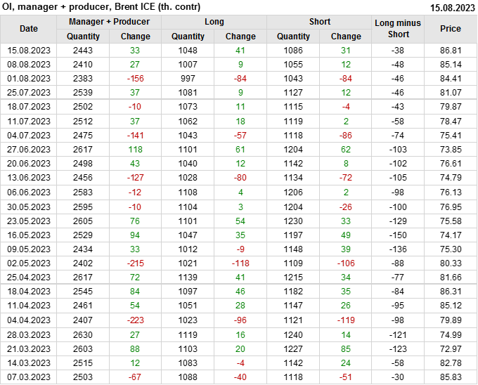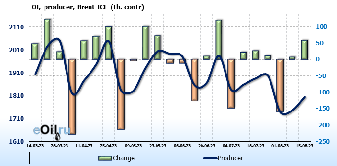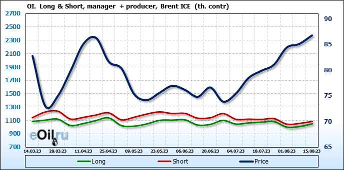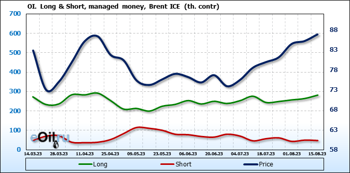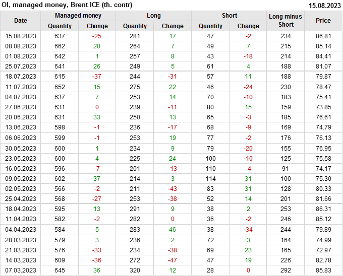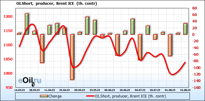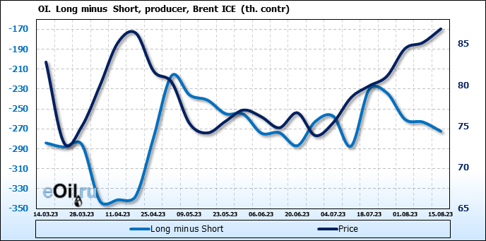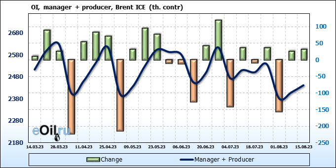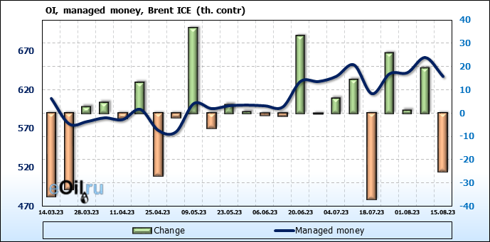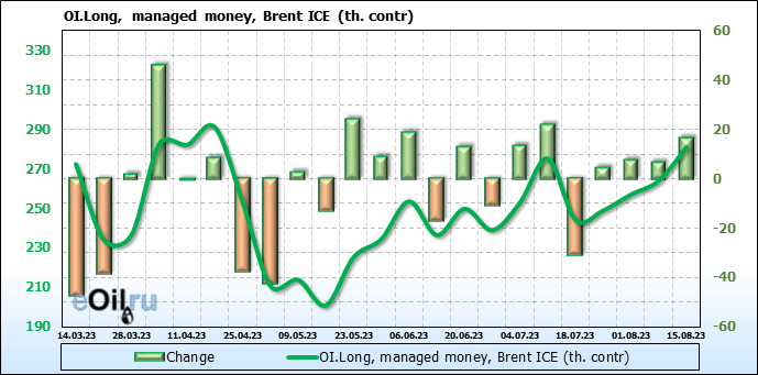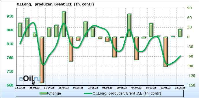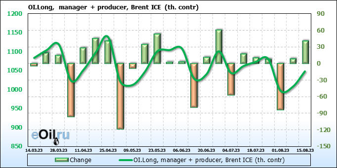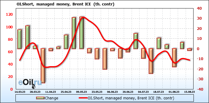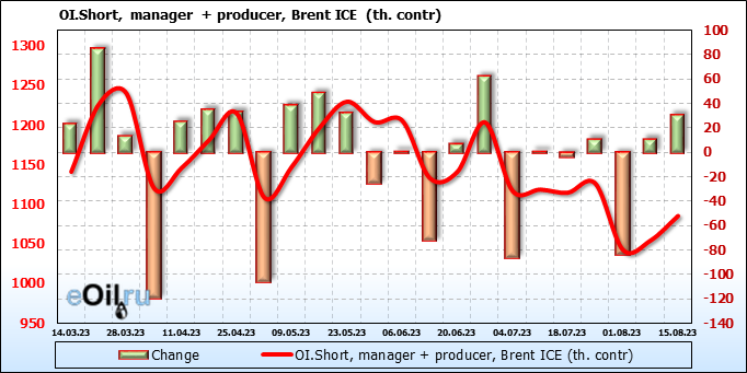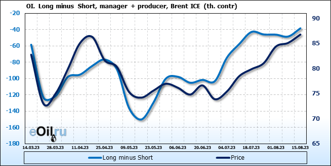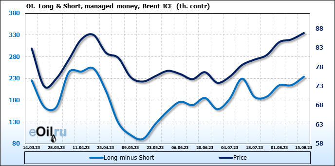 За прошедшую неделю, 09.08.23 — 15.08.23, разница между длинными и короткими позициями управляющих увеличилась на 19.3 тыс. контрактов. В тоже время, цена выросла на 1.67 доллара.