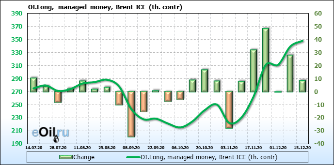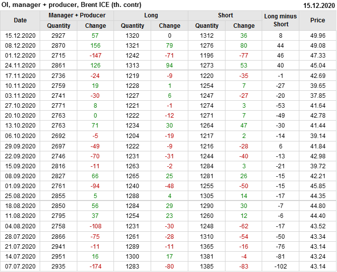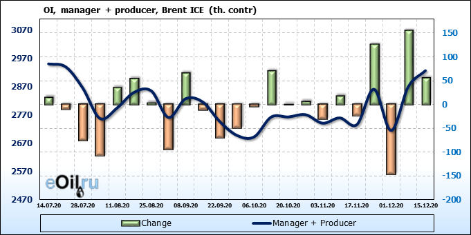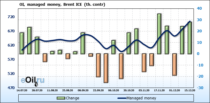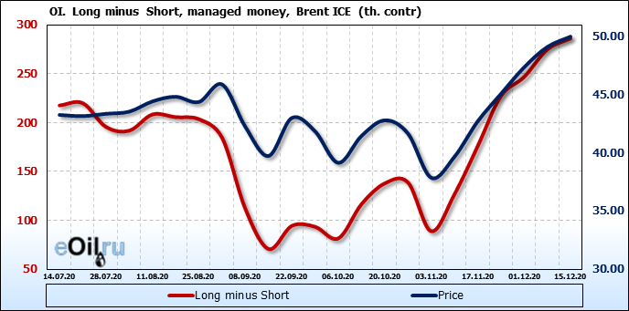 За прошлую неделю, 09.12.20 — 15.12.20, разница между длинными и короткими позициями управляющих выросла на 11 тыс. контрактов. В тоже время, цена выросла на 0.88 доллара. Управляющие наращивают позиции, разгоняя тем самым рост цен, что говорит нам о текущей силе рынка.