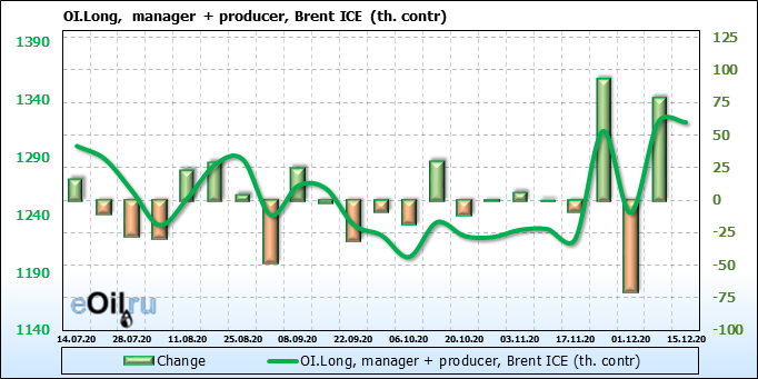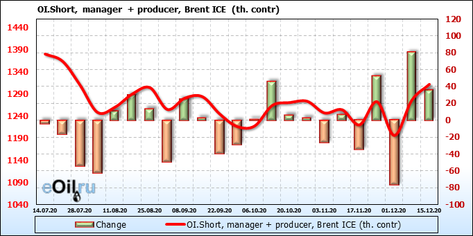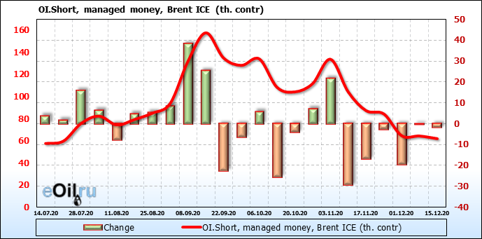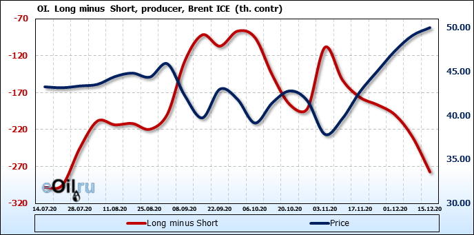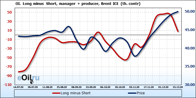 За прошлую неделю, 09.12.20 — 15.12.20, разница между длинными и короткими позициями производителей и управляющих упала на 36 тыс. контрактов. За отчетный период времени, цена выросла на 0.88 доллара. Разница совокупного объема длинных и коротких позиций производителей и управляющих на прошедшей неделе снизилась, в то время как цены выросли. Рынок теряет доверие покупателей, что, при продолжении данной динамики, приведет к стабилизации или падению цен в ближайшее время.