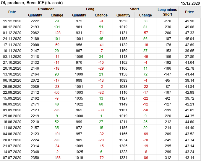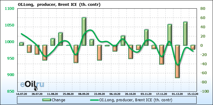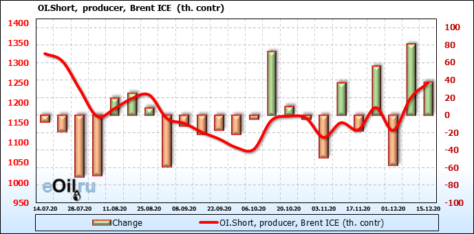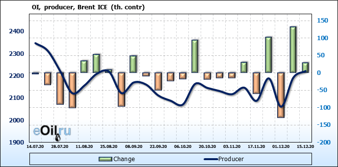 За прошлую неделю, 09.12.20 — 15.12.20, разница между длинными и короткими позициями производителей упала на 48 тыс. контрактов. В тоже время, цена выросла на 0.88 доллара. Производители увеличивают продажи, предполагая, что текущие уровни являются привлекательными для них. И не смотря на это, рынок продолжает расти, что показывает силу текущего тренда.