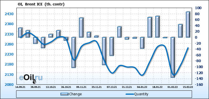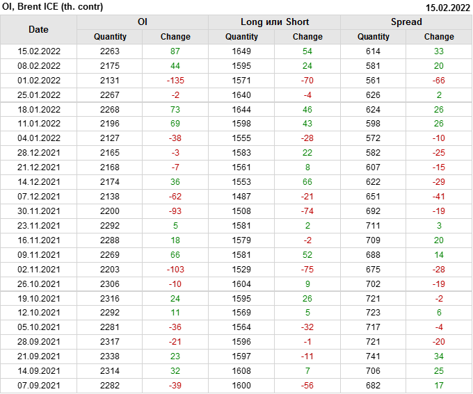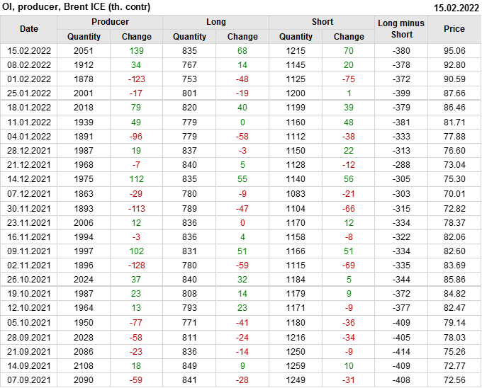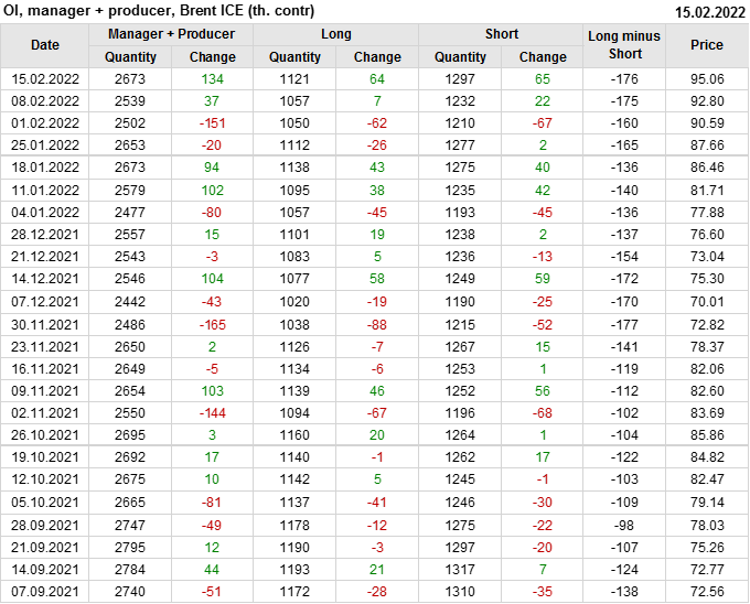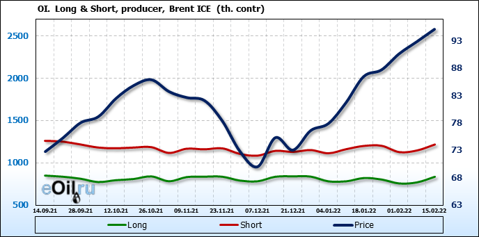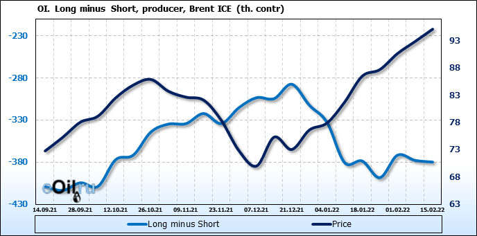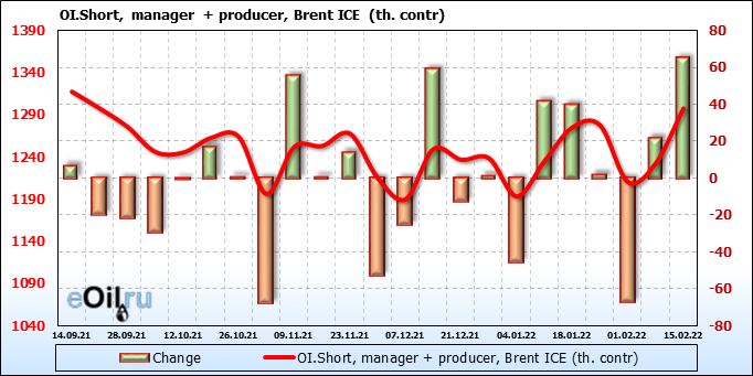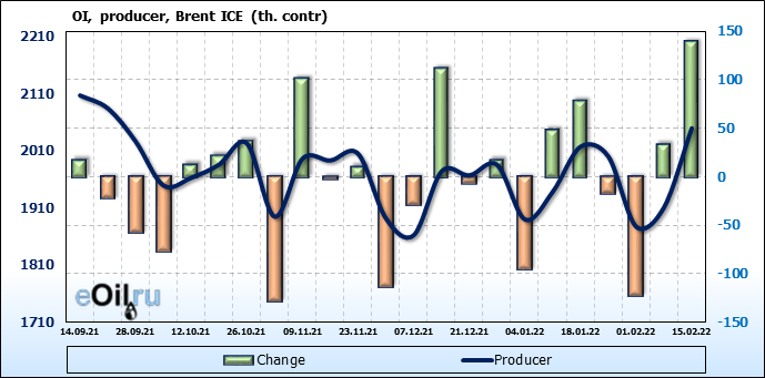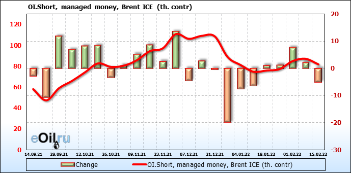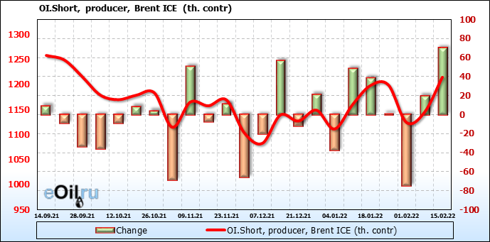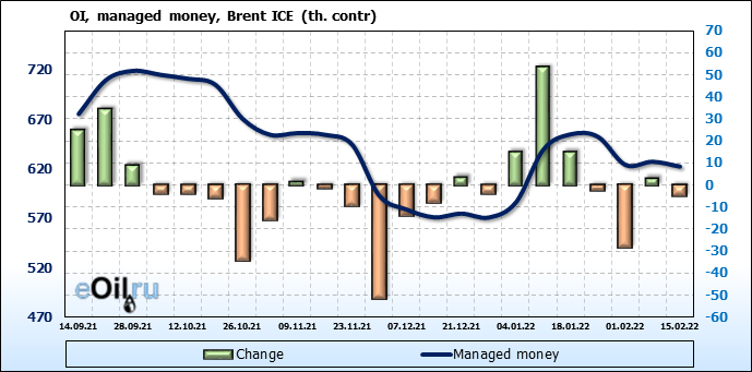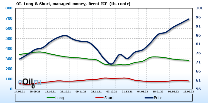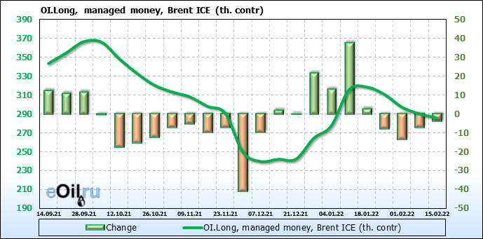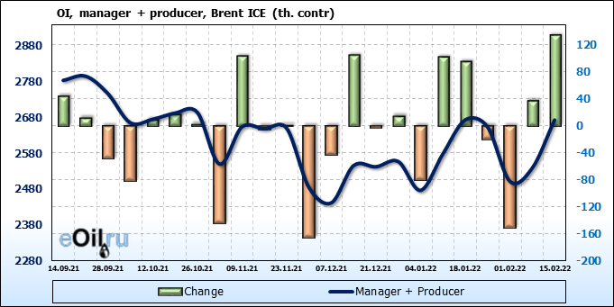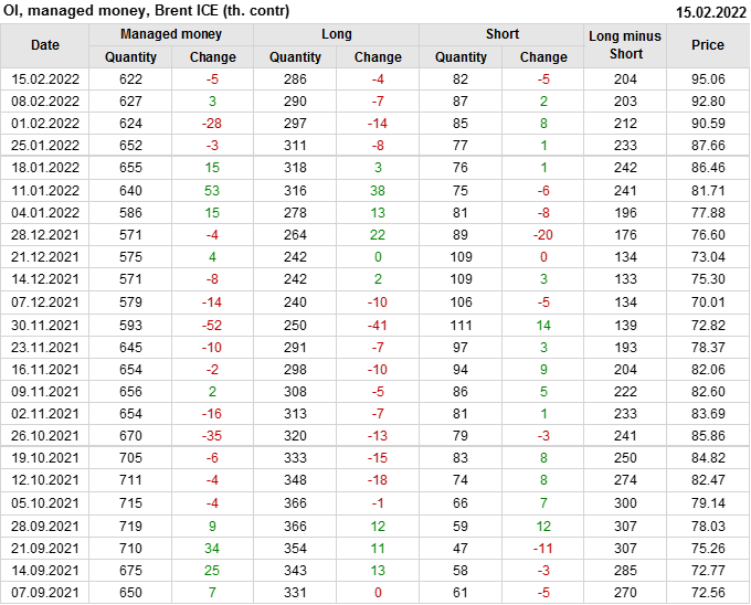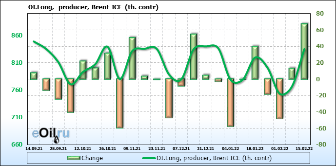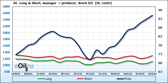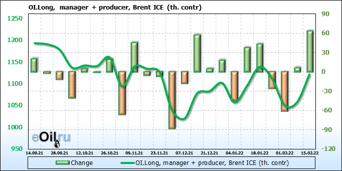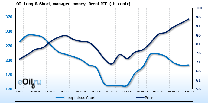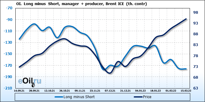 За прошедшую неделю, 09.02.22 — 15.02.22, разница между длинными и короткими позициями управляющих увеличилась на 1 тыс. контрактов. В тоже время, цена выросла на 2.26 доллара.