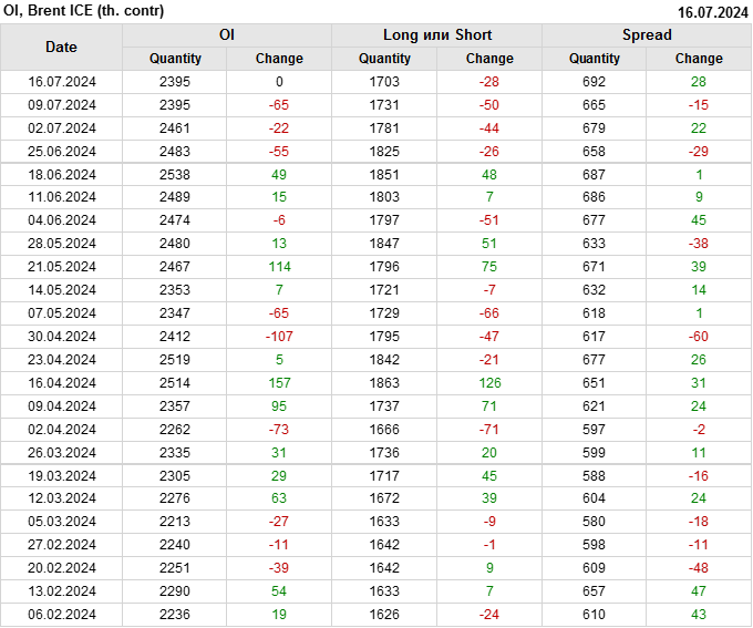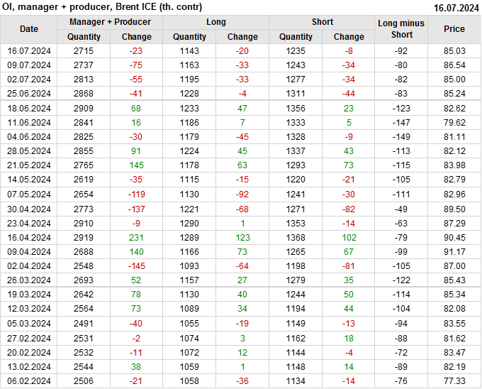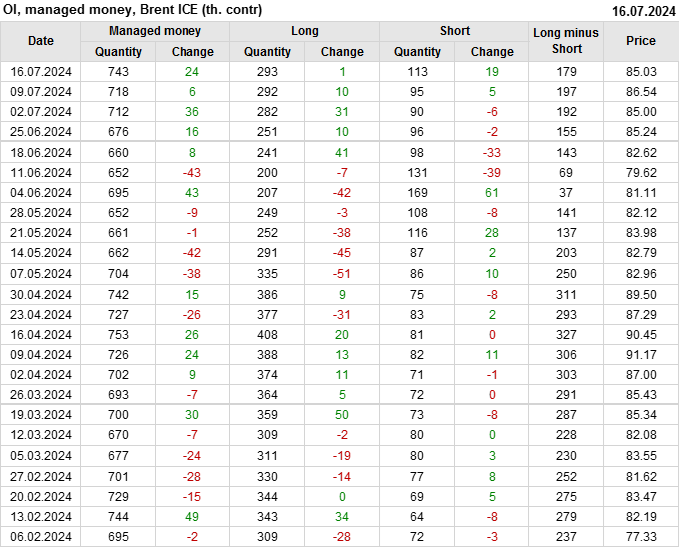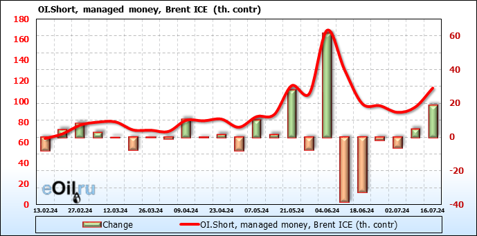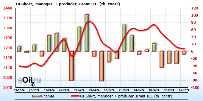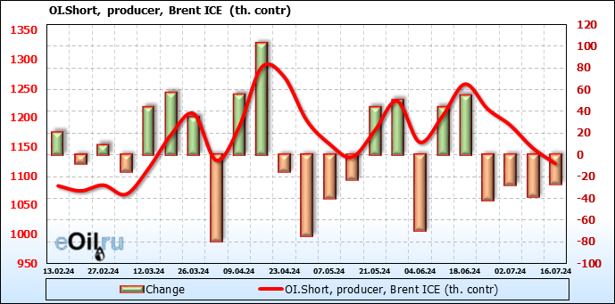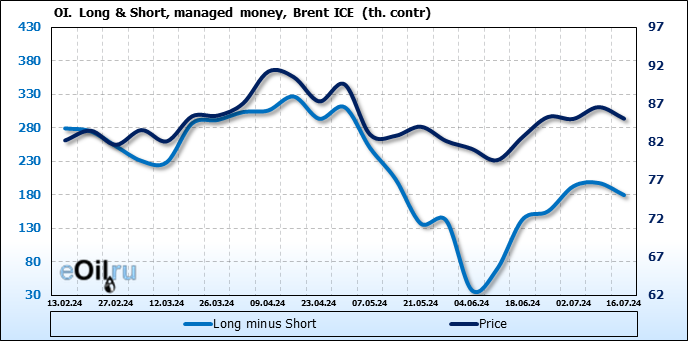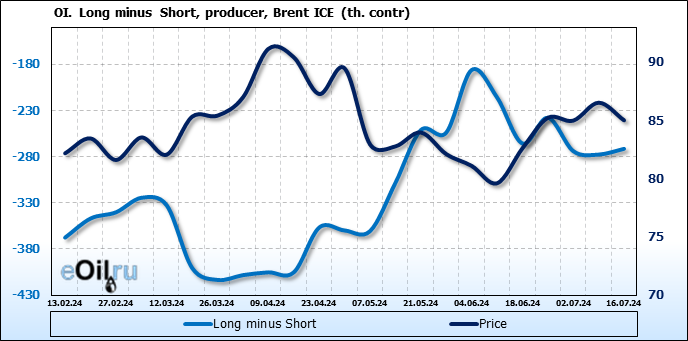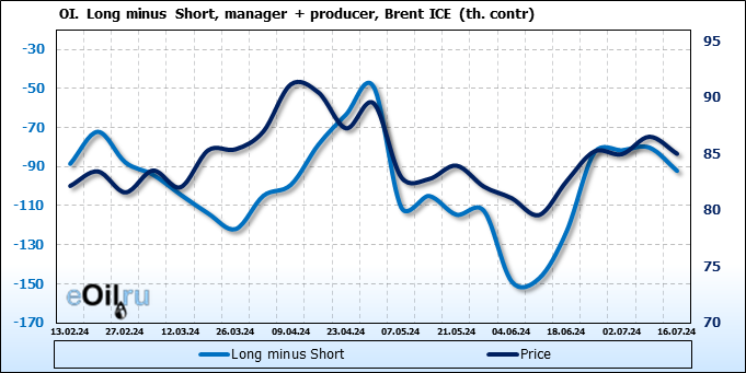За прошедшую неделю, 10.07.24 — 16.07.24, разница между длинными и короткими позициями управляющих сократилась на 18.1 тыс. контрактов. В тоже время, цена упала на 1.51 доллара.