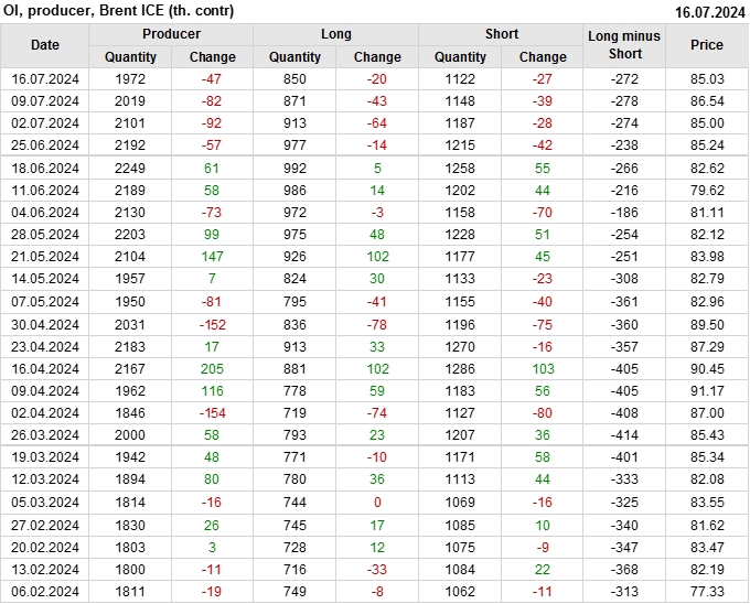 За неделю разница между длинными и короткими позициями производителей сократилась на 6.2 тыс. контрактов.