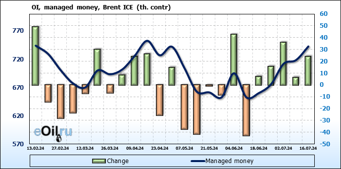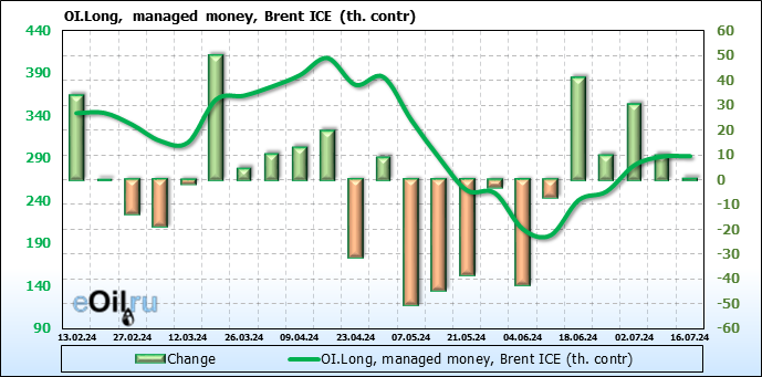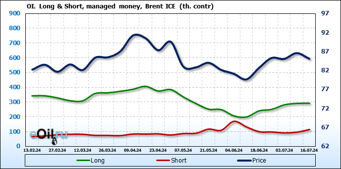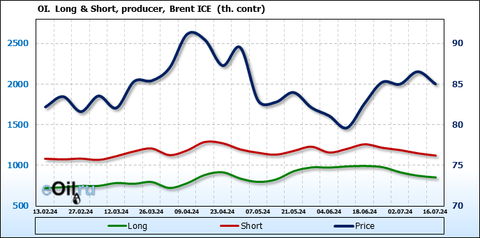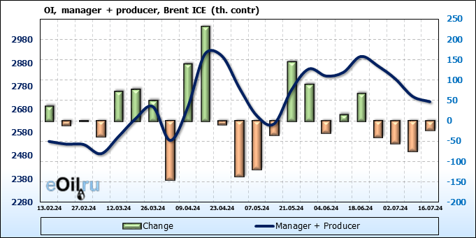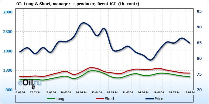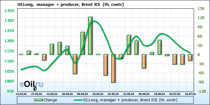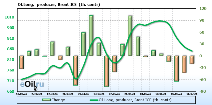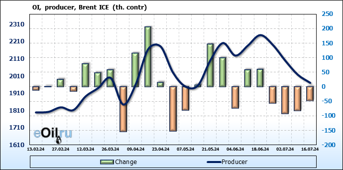 За прошедшую неделю, 10.07.24 — 16.07.24, разница между длинными и короткими позициями управляющих сократилась на 18.1 тыс. контрактов. В тоже время, цена упала на 1.51 доллара.