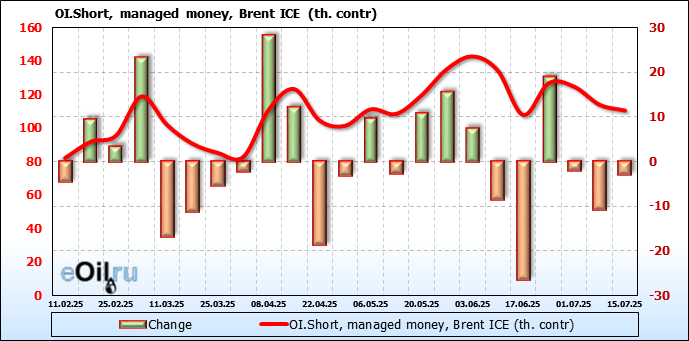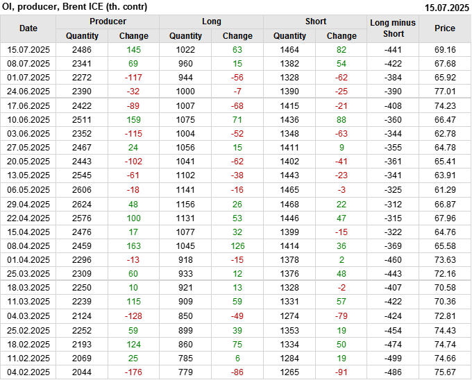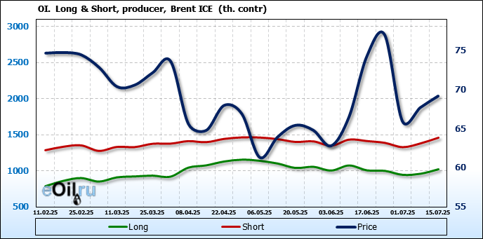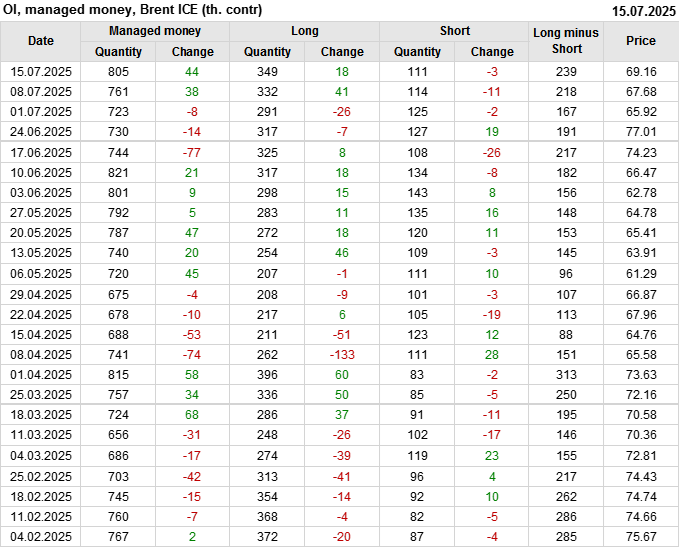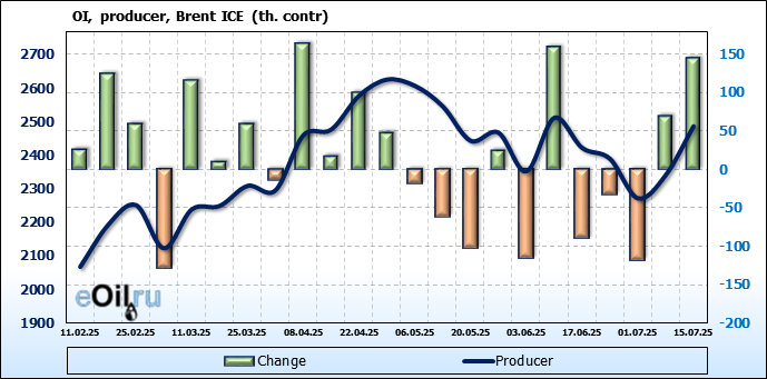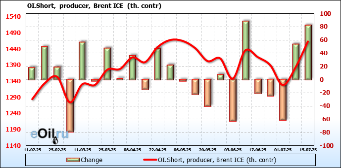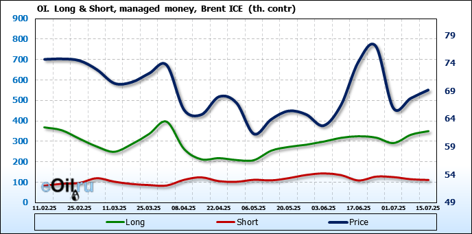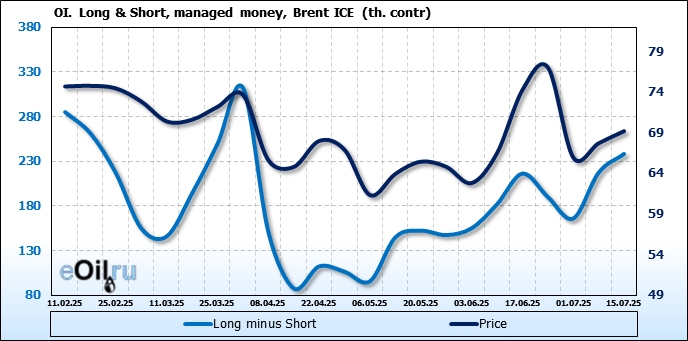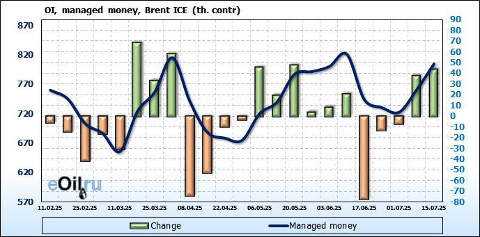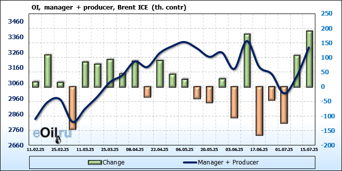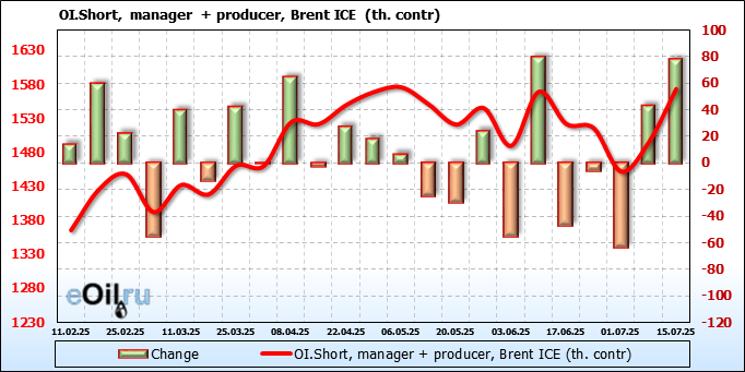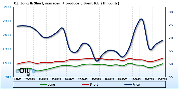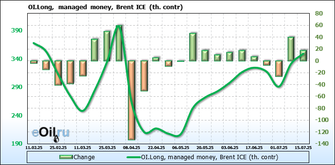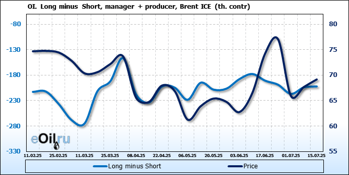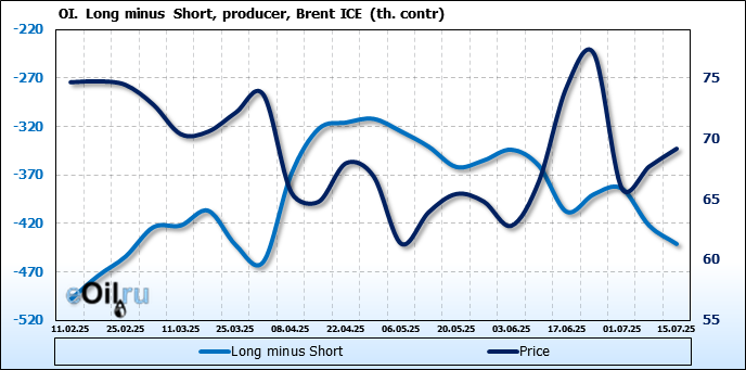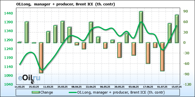 За прошедшую неделю, 09.07.25 — 15.07.25, разница между длинными и короткими позициями управляющих увеличилась на 21 тыс. контрактов. В тоже время, цена выросла на 1.48 доллара.