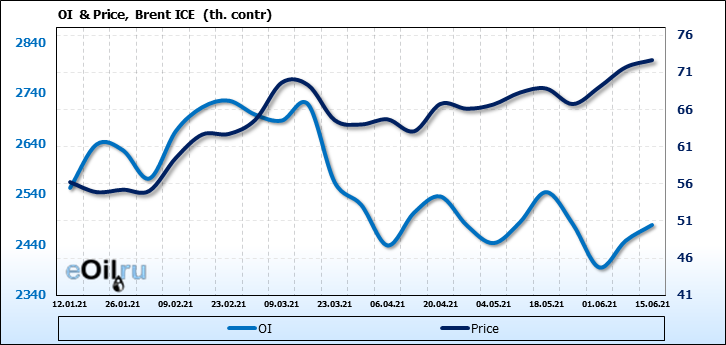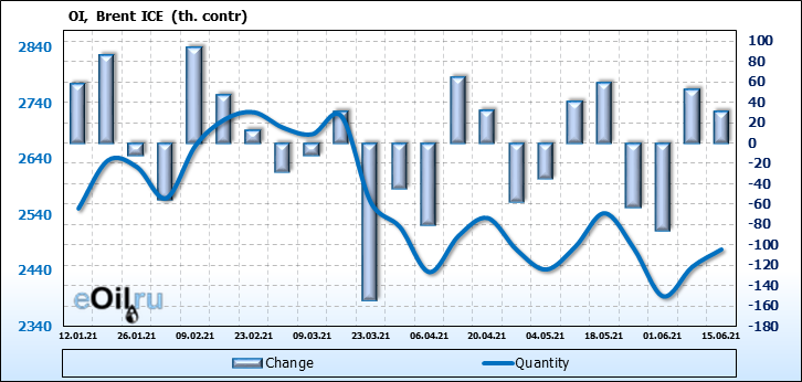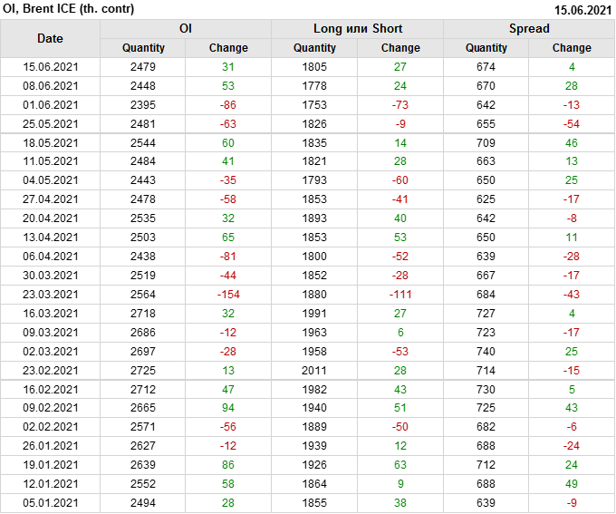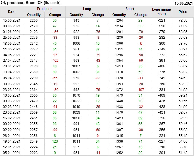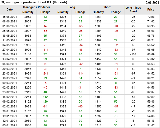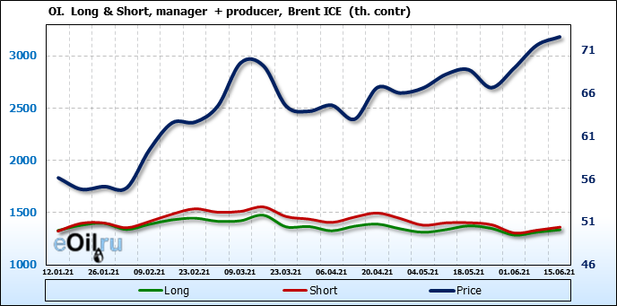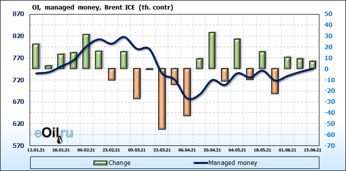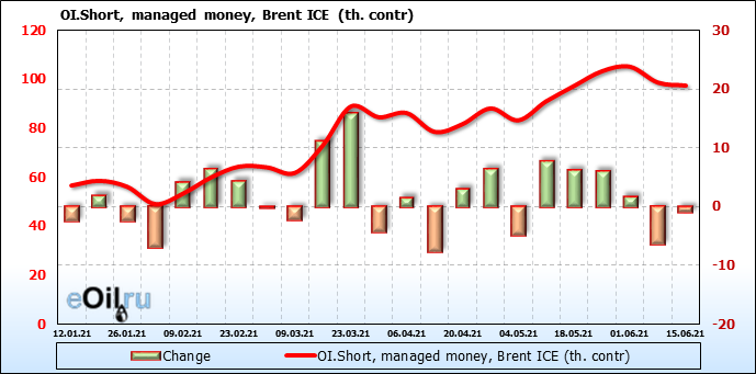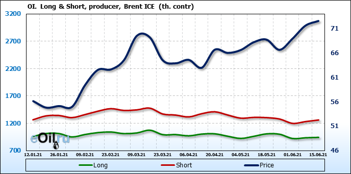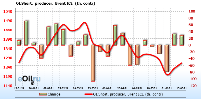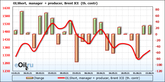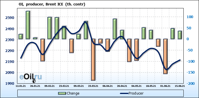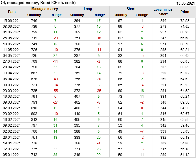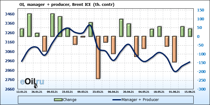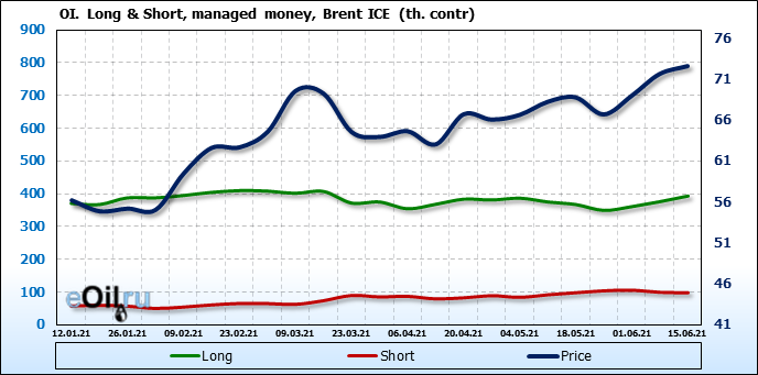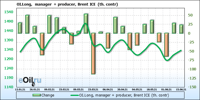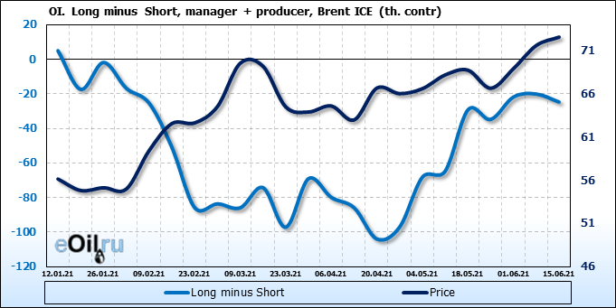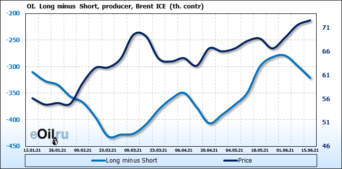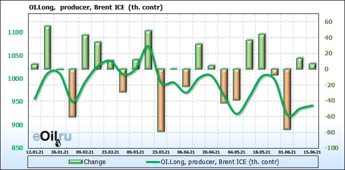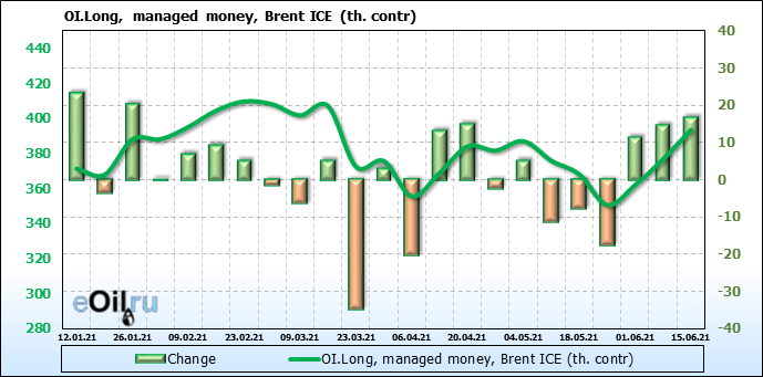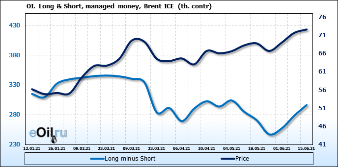 За прошедшую неделю, 09.06.21 — 15.06.21, разница между длинными и короткими позициями управляющих увеличилась на 18.1 тыс. контрактов. В тоже время, цена выросла на 0.96 доллара.