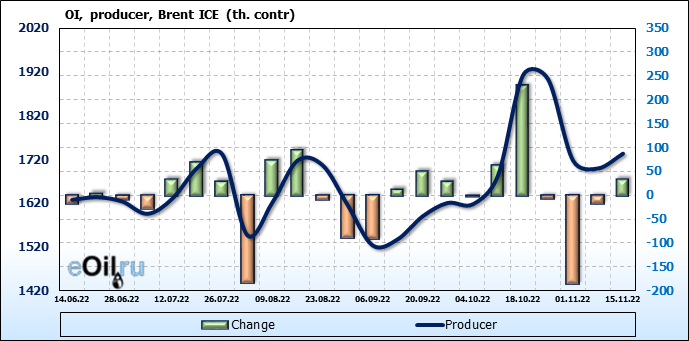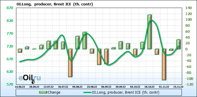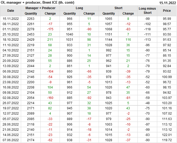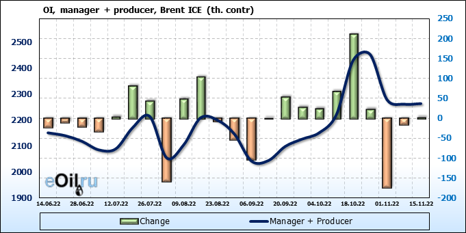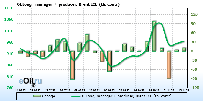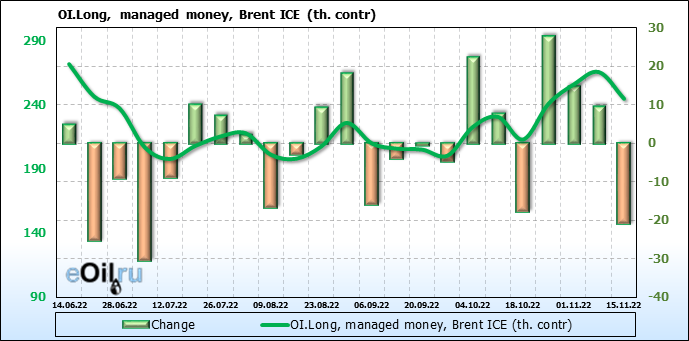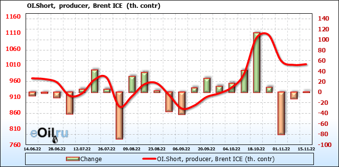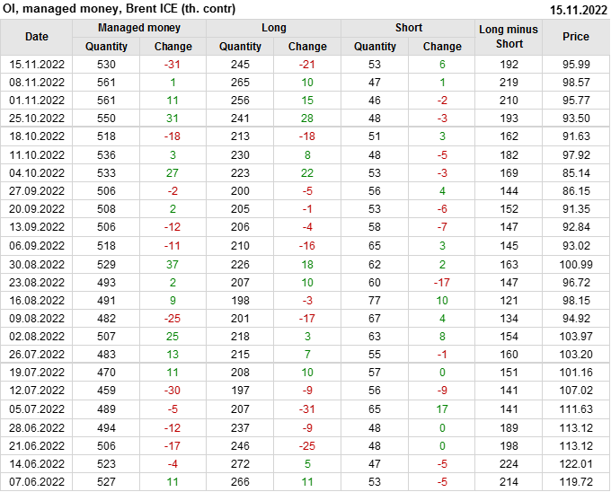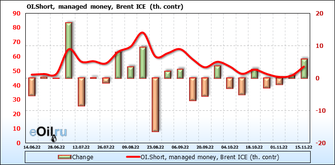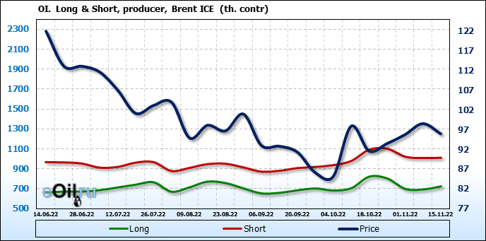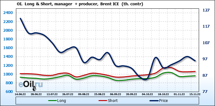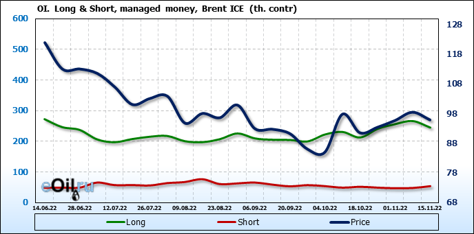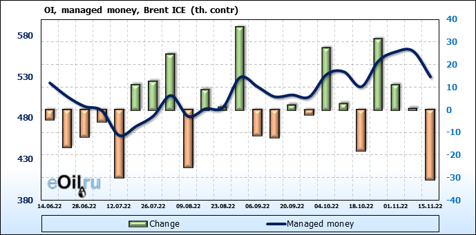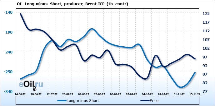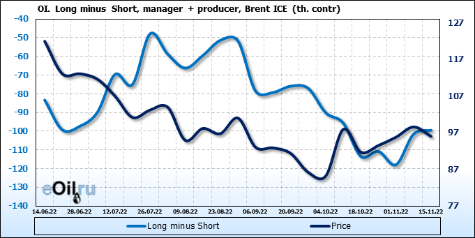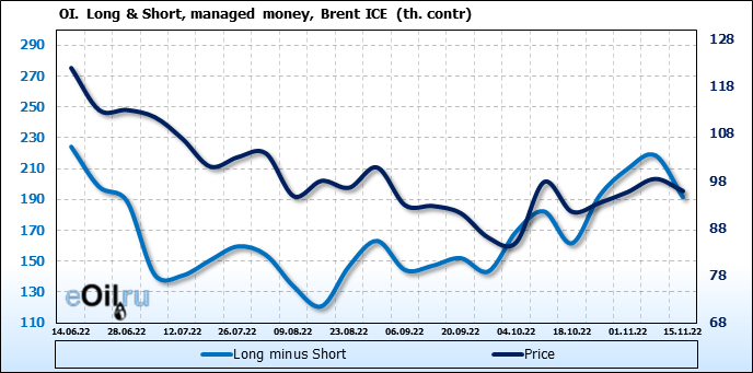 За прошедшую неделю, 09.11.22 — 15.11.22, разница между длинными и короткими позициями управляющих сократилась на 27.2 тыс. контрактов. В тоже время, цена упала на 2.58 доллара.