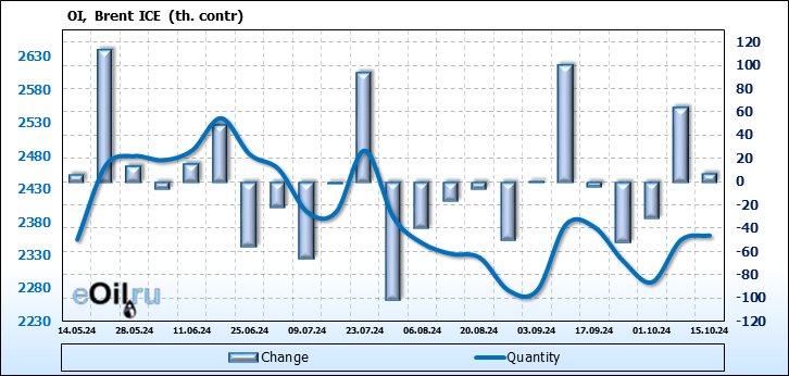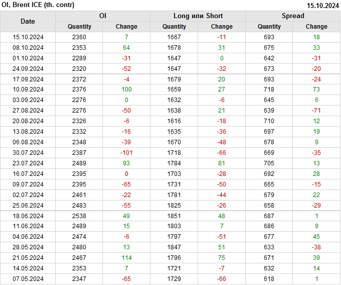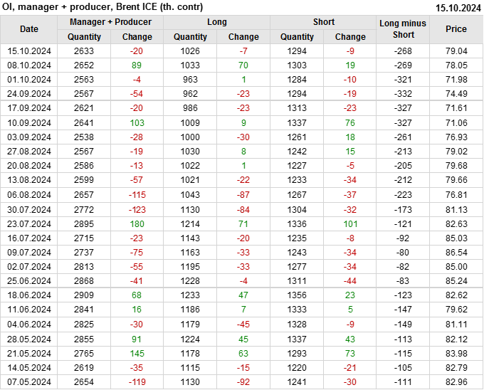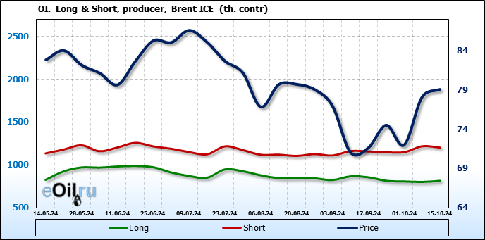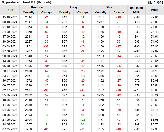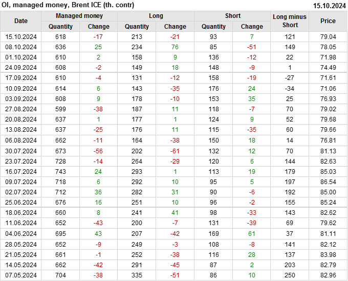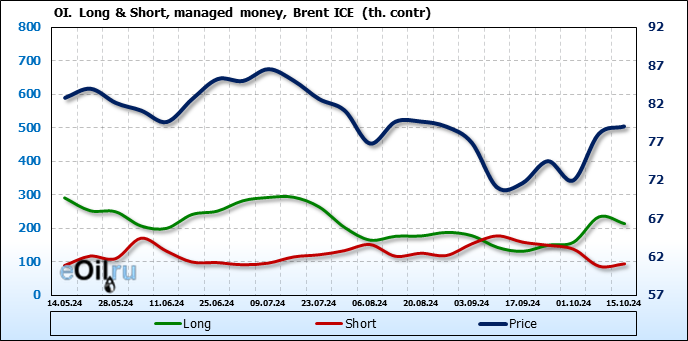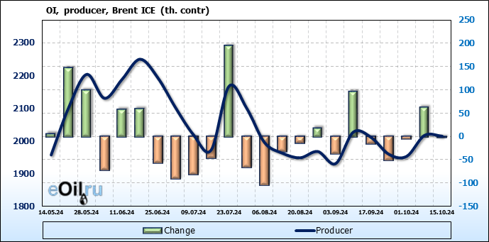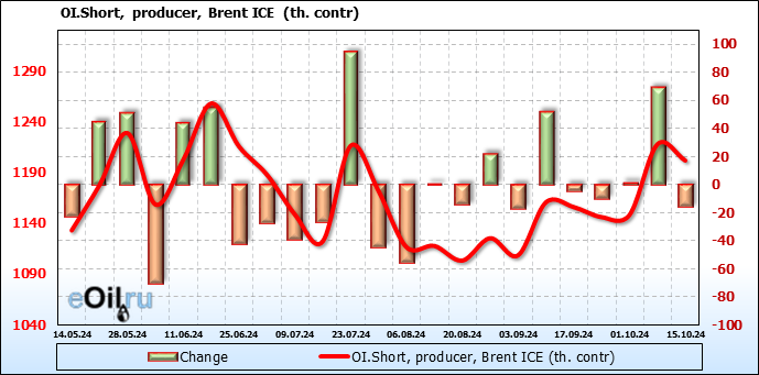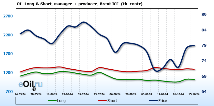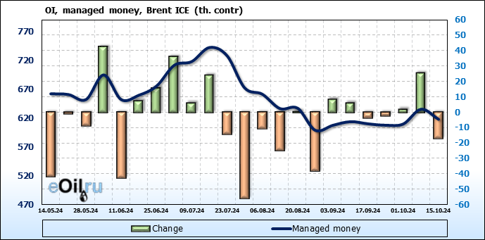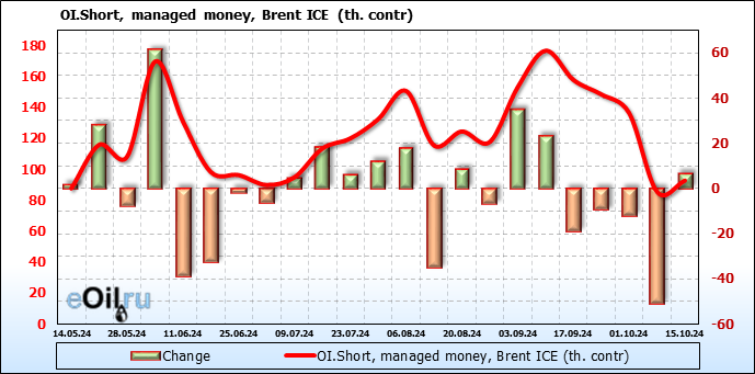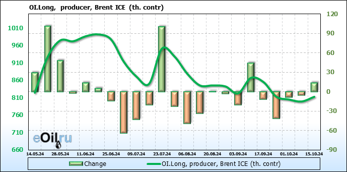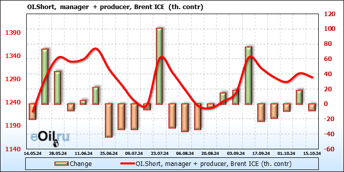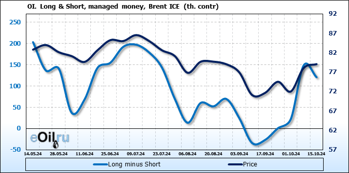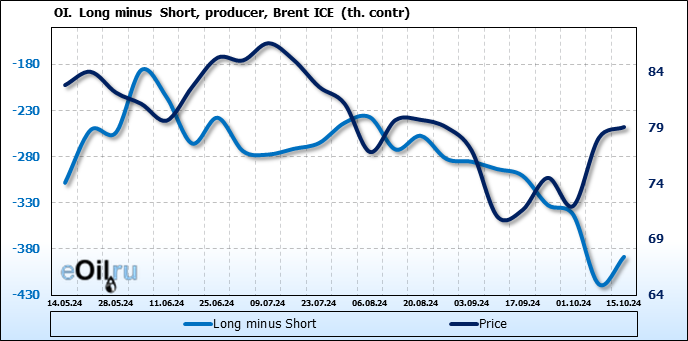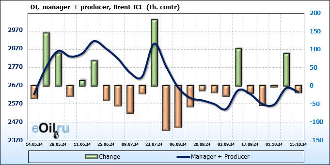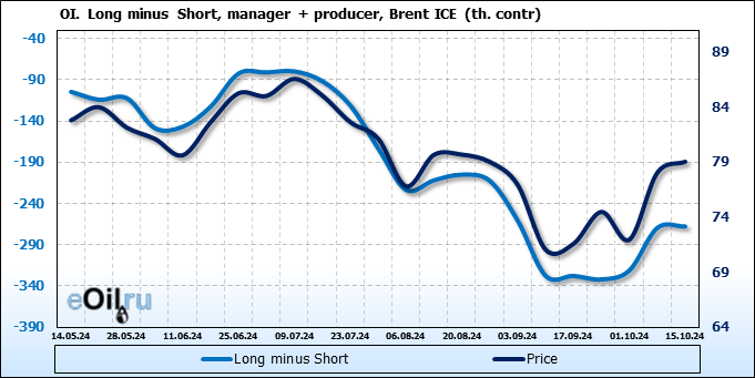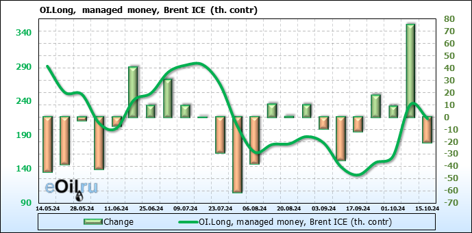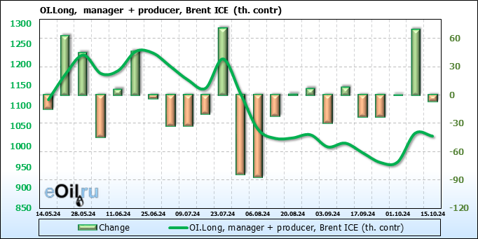 За прошедшую неделю, 09.10.24 — 15.10.24, разница между длинными и короткими позициями управляющих сократилась на 27.9 тыс. контрактов. В тоже время, цена выросла на 0.99 доллара.