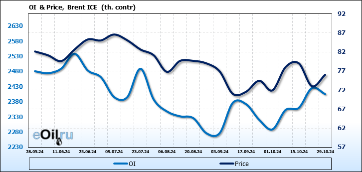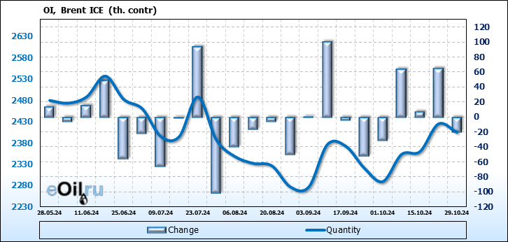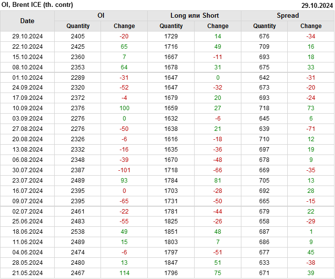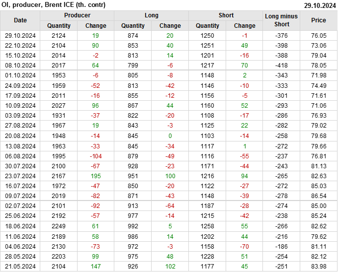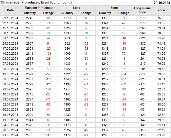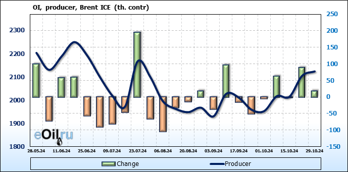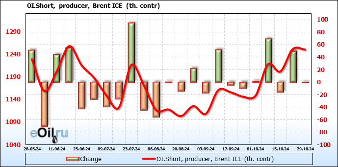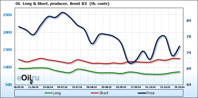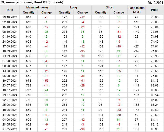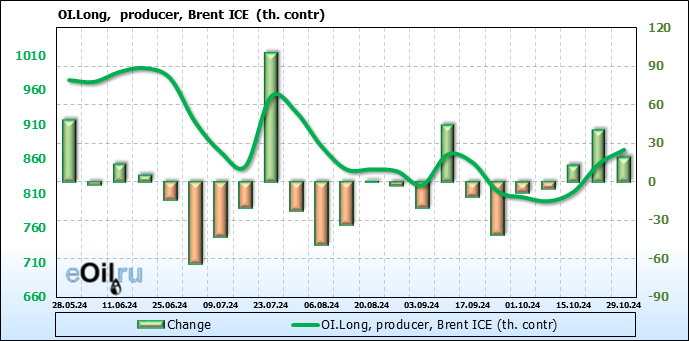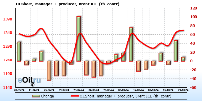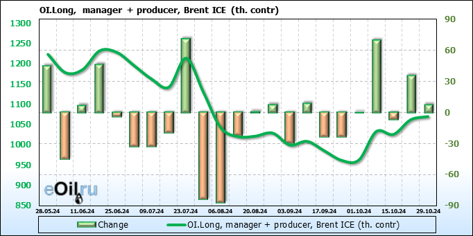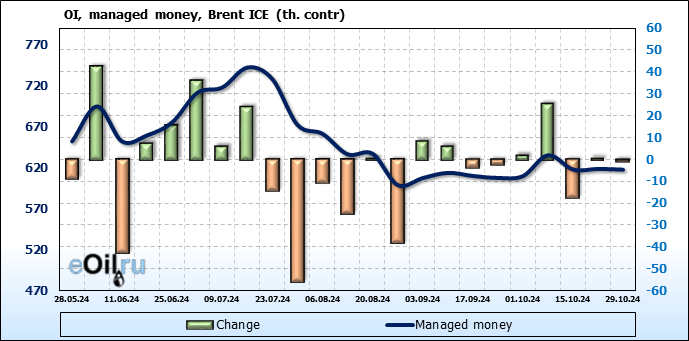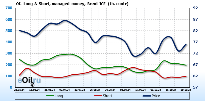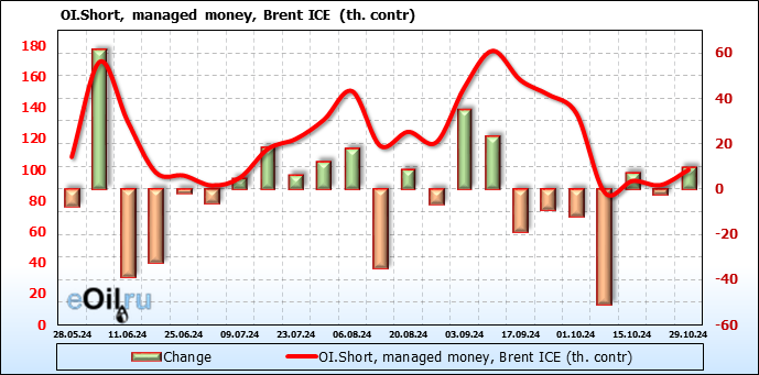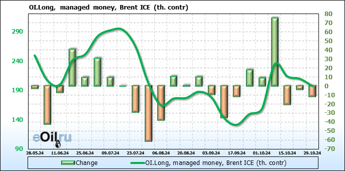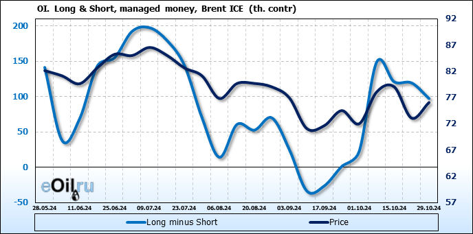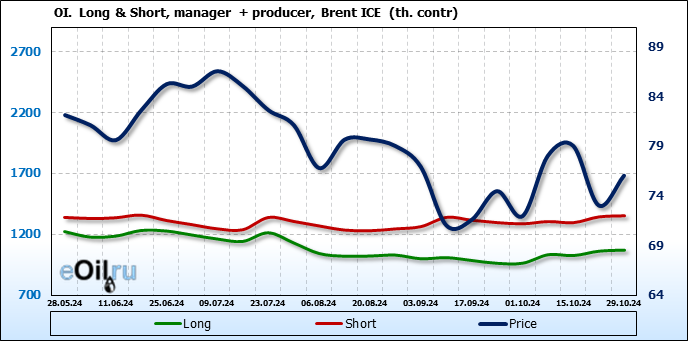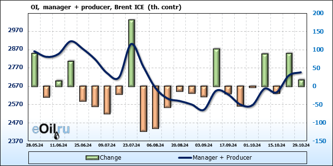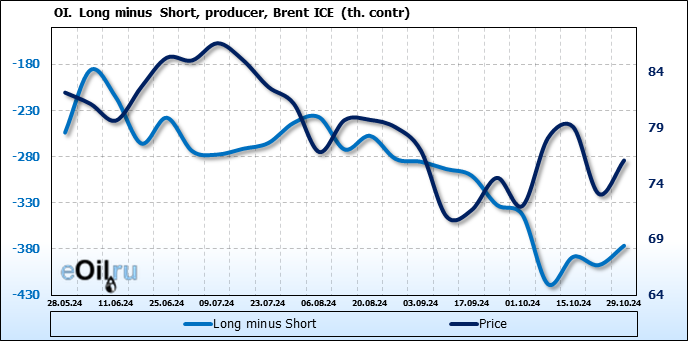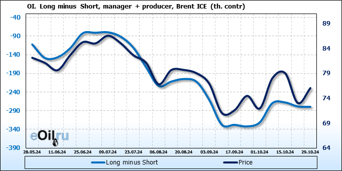 За прошедшую неделю, 23.10.24 — 29.10.24, разница между длинными и короткими позициями управляющих сократилась на 22.2 тыс. контрактов. В тоже время, цена выросла на 2.99 доллара.