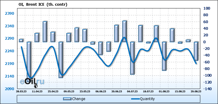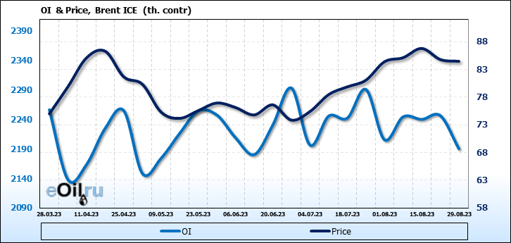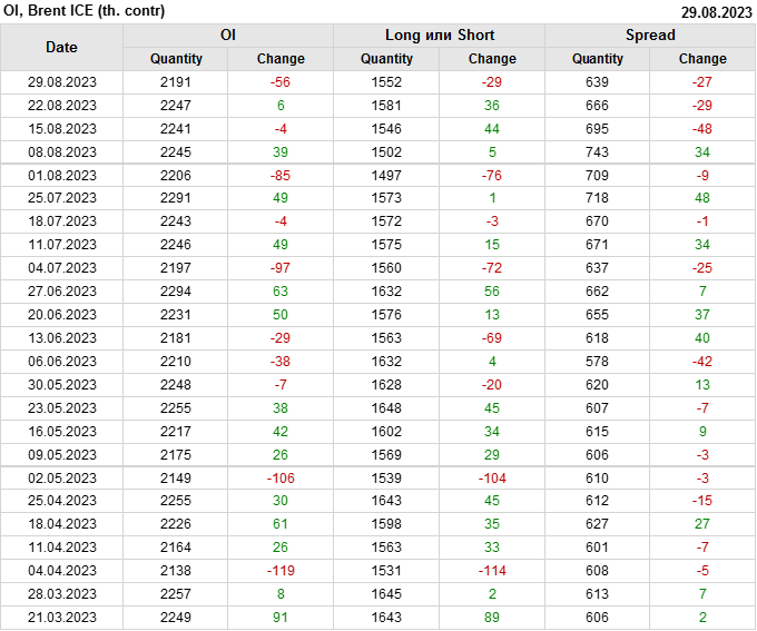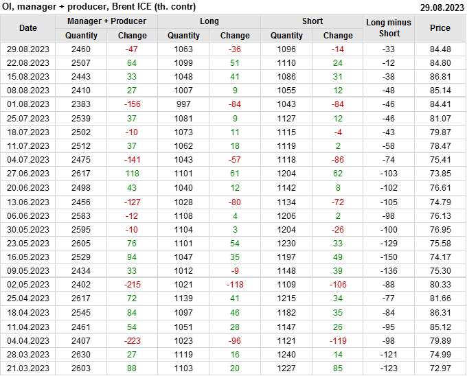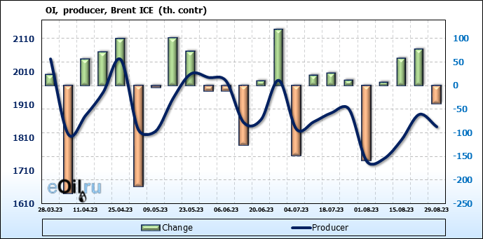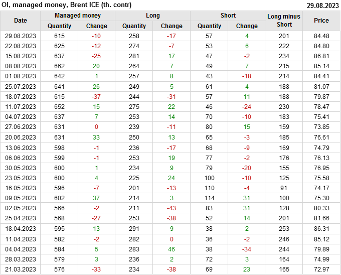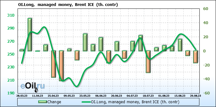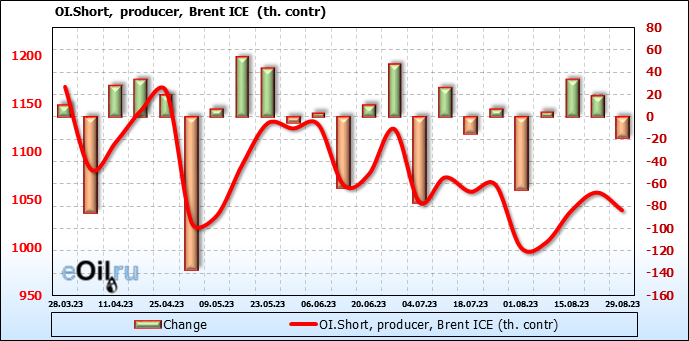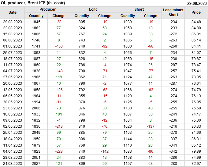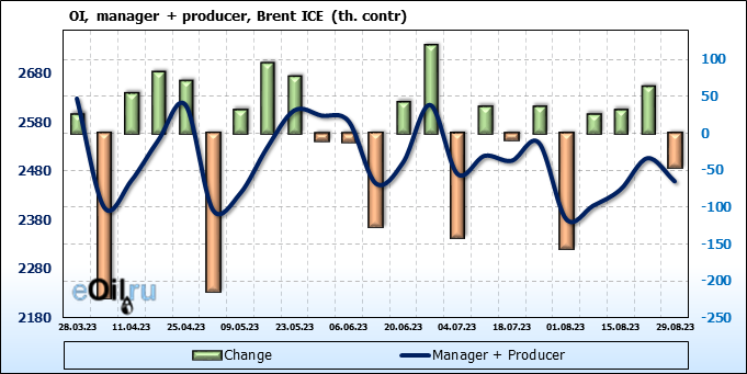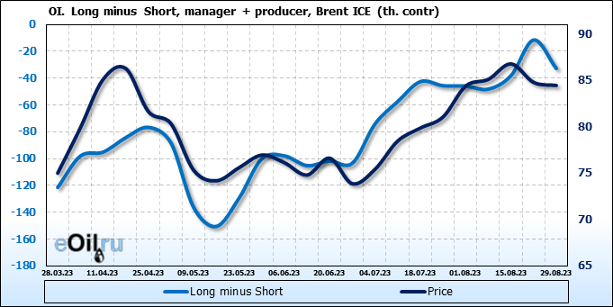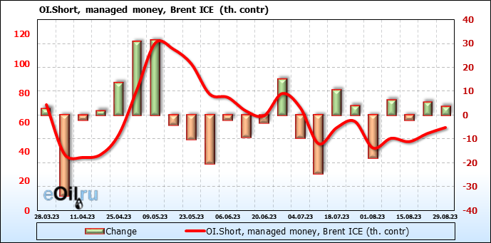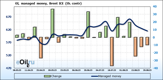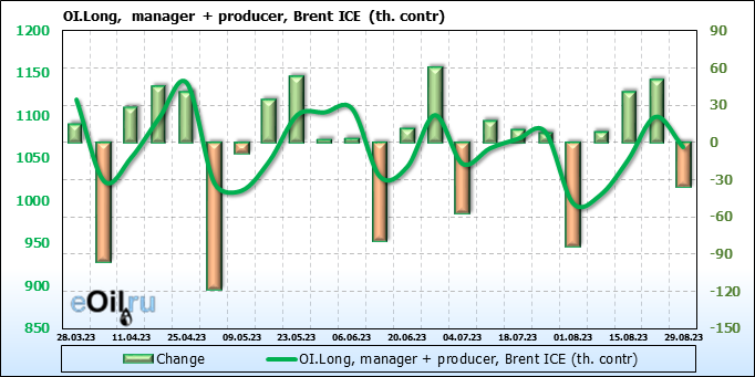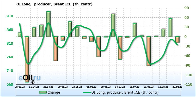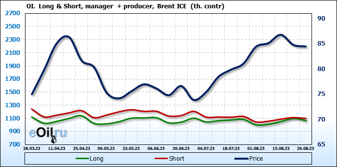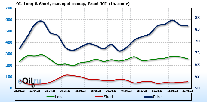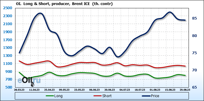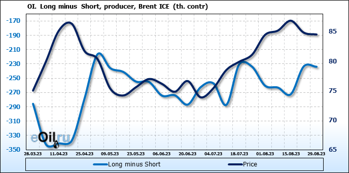 За прошедшую неделю, 23.08.23 — 29.08.23, разница между длинными и короткими позициями управляющих сократилась на 20.8 тыс. контрактов. В тоже время, цена упала на 0.32 доллара.