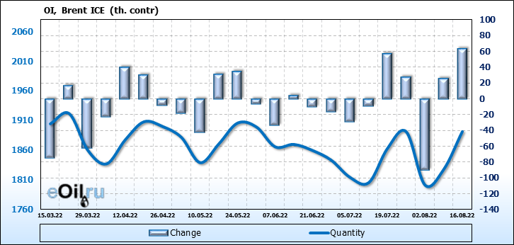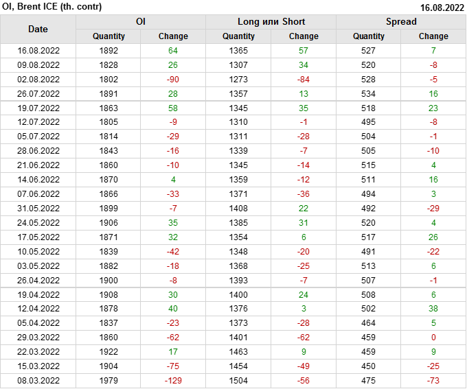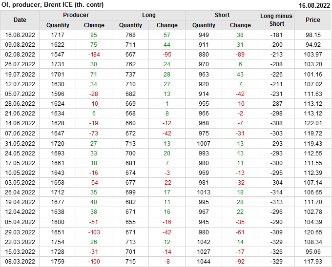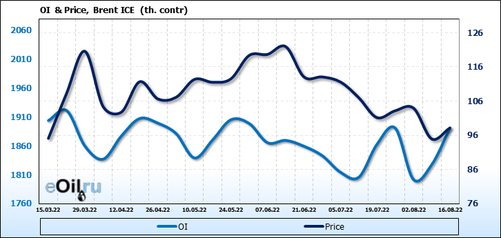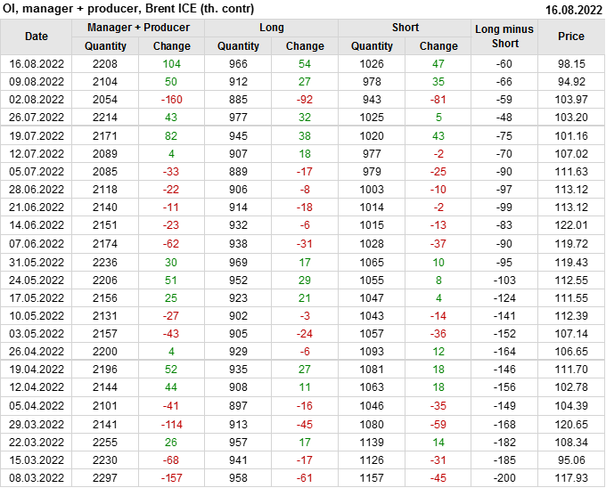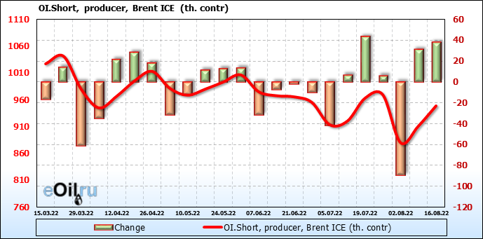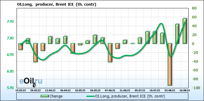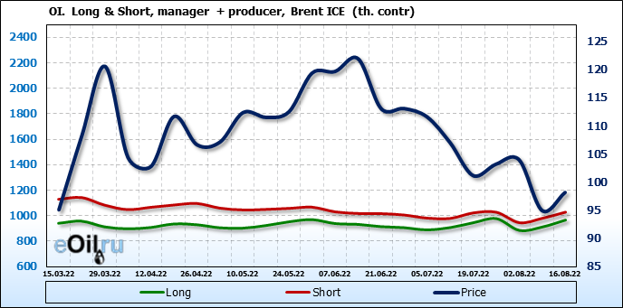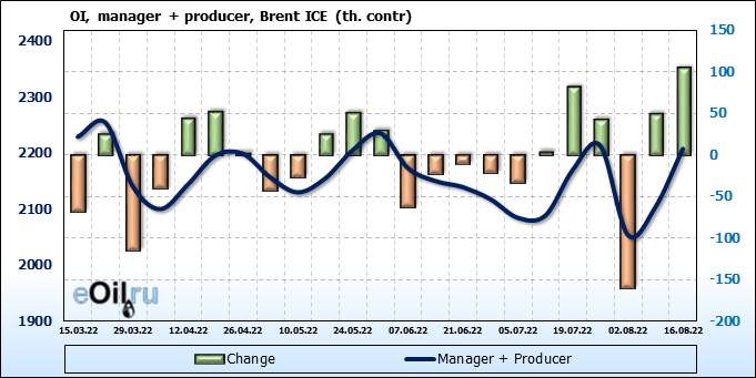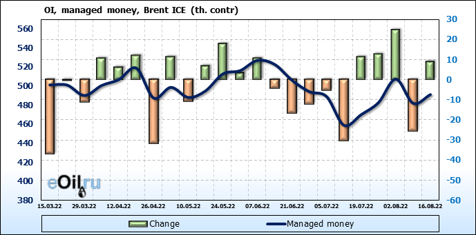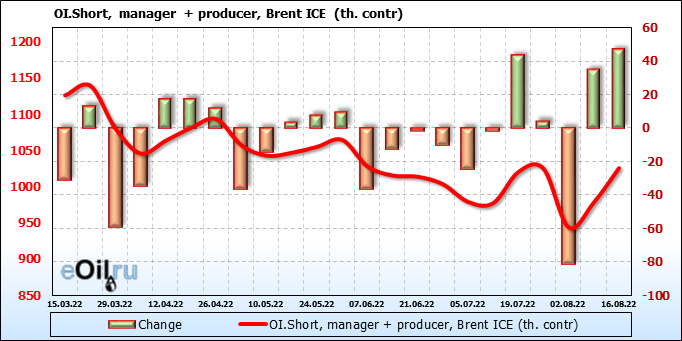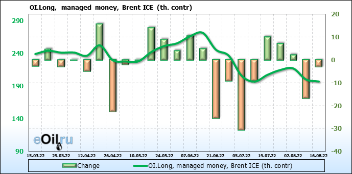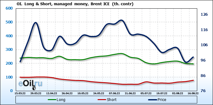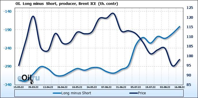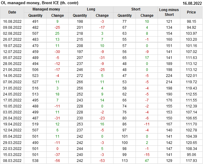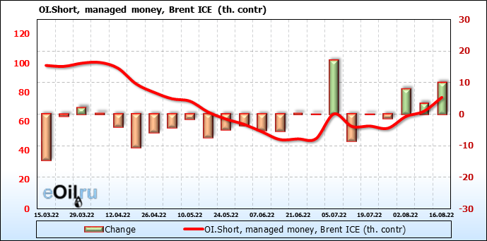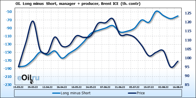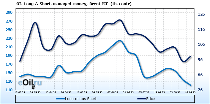 За прошедшую неделю, 10.08.22 — 16.08.22, разница между длинными и короткими позициями управляющих сократилась на 12.7 тыс. контрактов. В тоже время, цена выросла на 3.23 доллара.