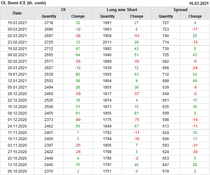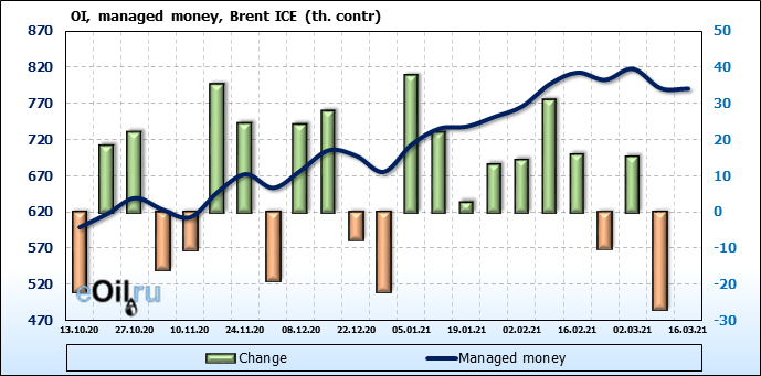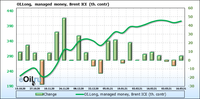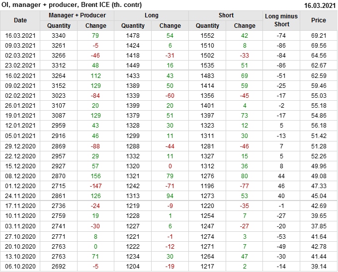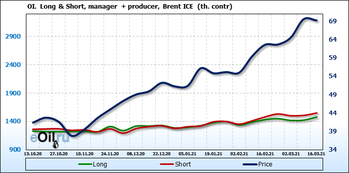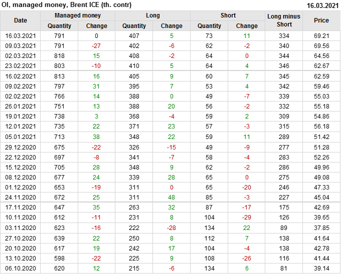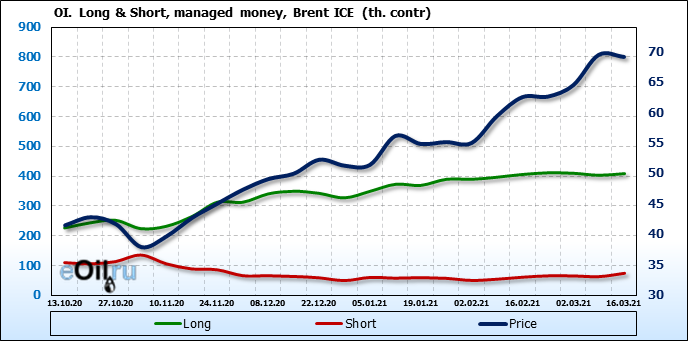 За прошлую неделю, 10.03.21 — 16.03.21, разница между длинными и короткими позициями управляющих упала на 6 тыс. контрактов. В тоже время, цена упала на 0.34 доллара. Наращивание коротких позиций спекулянтами приводит к падению цен. Если давление со стороны медведей продолжится, то мы можем увидеть новые минимумы.