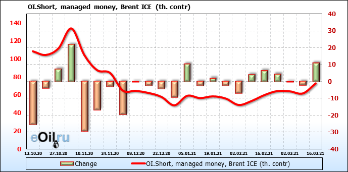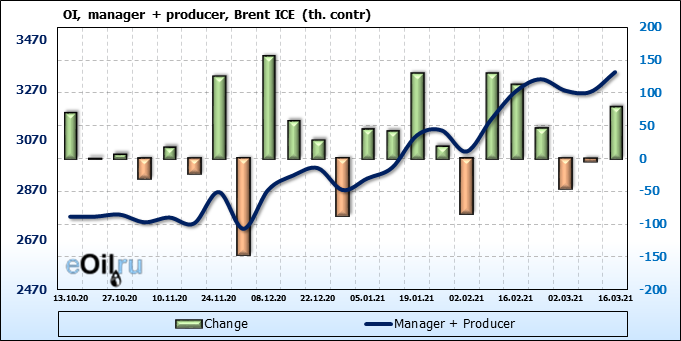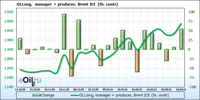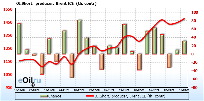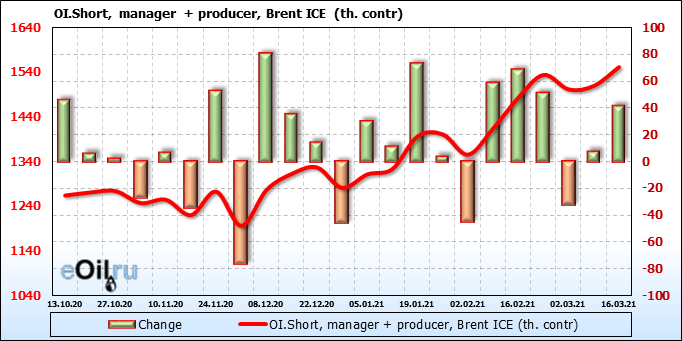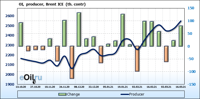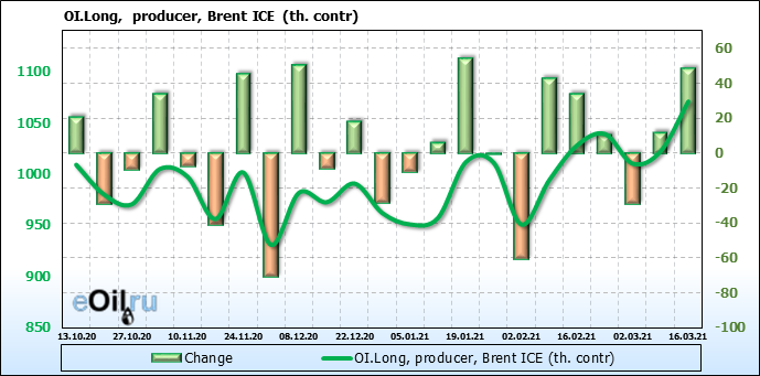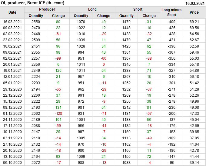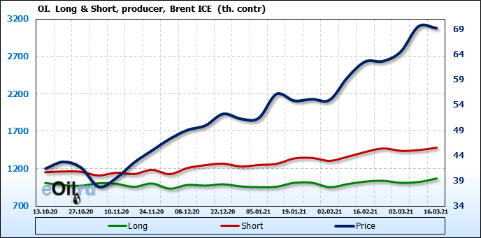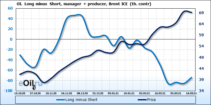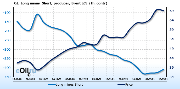 За прошлую неделю, 10.03.21 — 16.03.21, разница между длинными и короткими позициями производителей выросла на 18 тыс. контрактов. В тоже время, цена упала на 0.34 доллара. Производители перестали наращивать короткие позиции, что говорит или о непривлекательности текущих ценовых уровней для хеджирования, или о том, что часть участников рынка заняла выжидательную позицию.