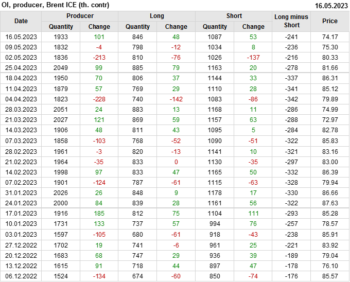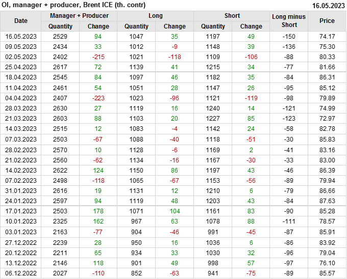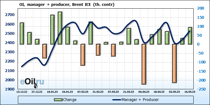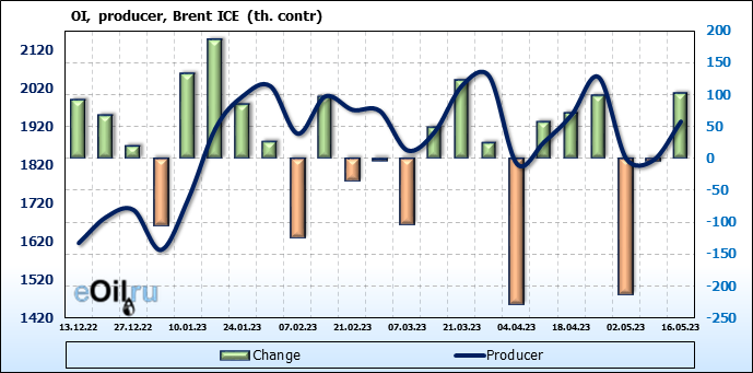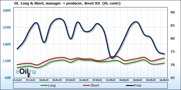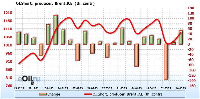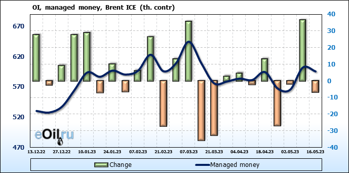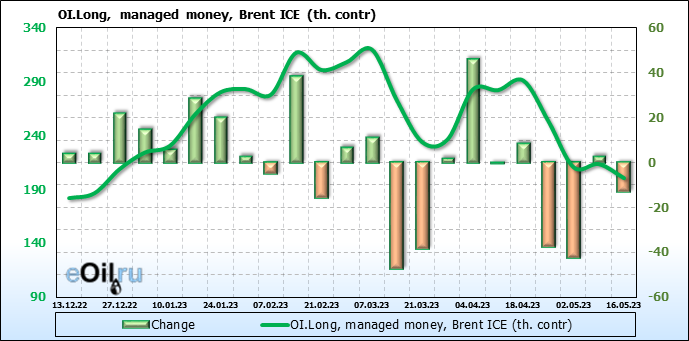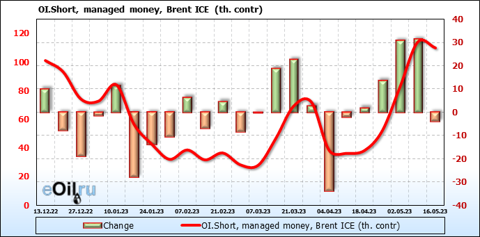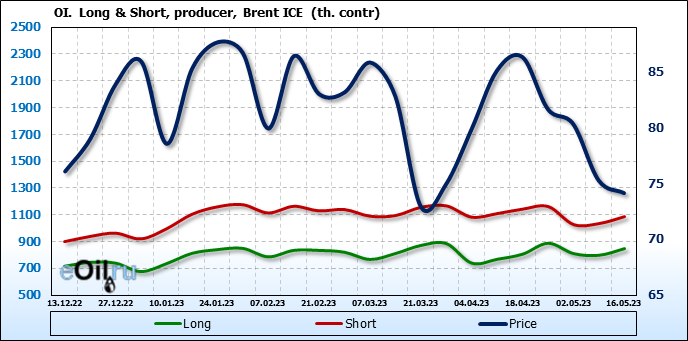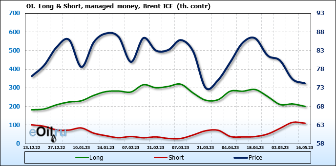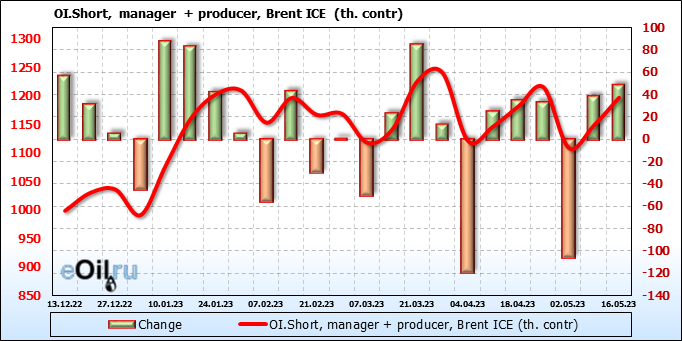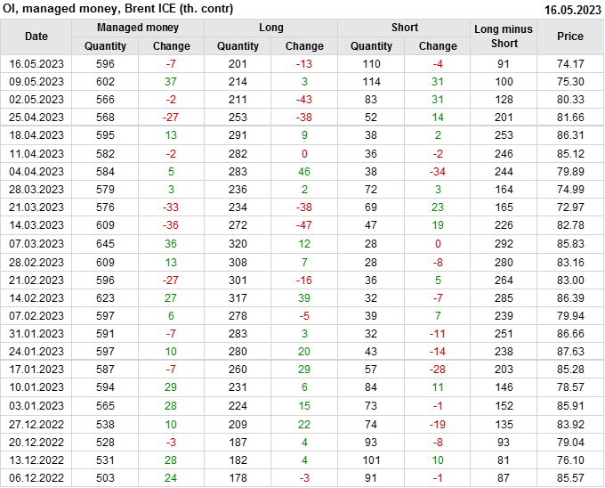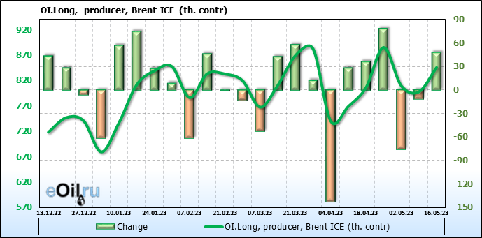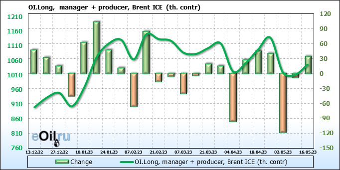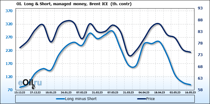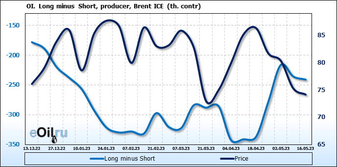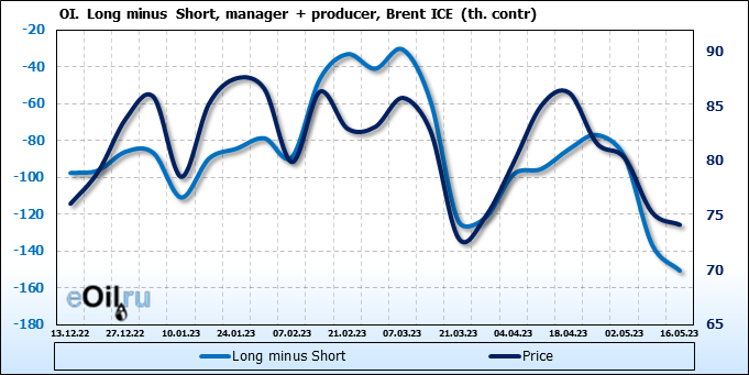 За прошедшую неделю, 10.05.23 — 16.05.23, разница между длинными и короткими позициями управляющих сократилась на 8.9 тыс. контрактов. В тоже время, цена упала на 1.13 доллара.