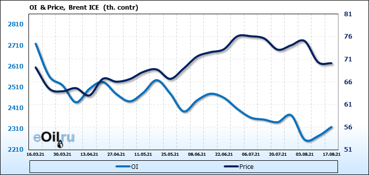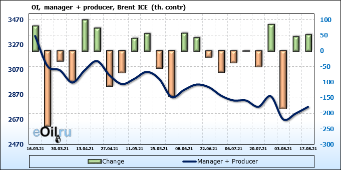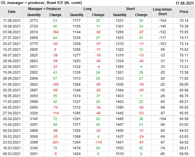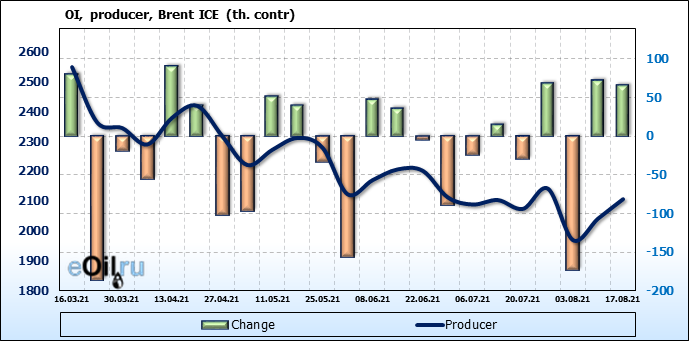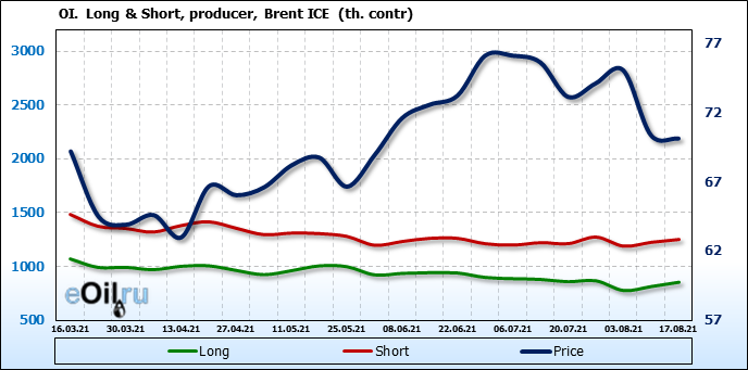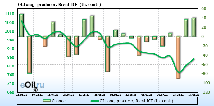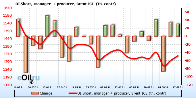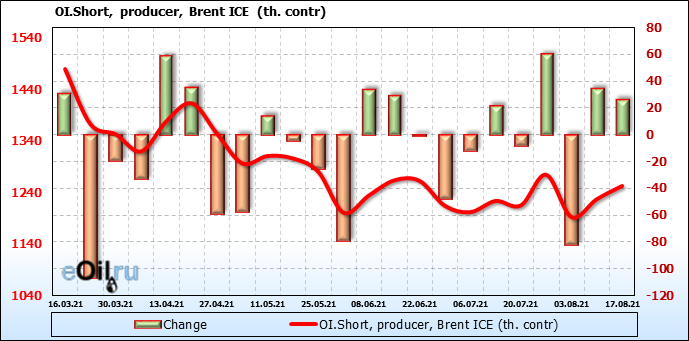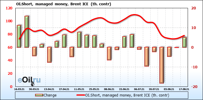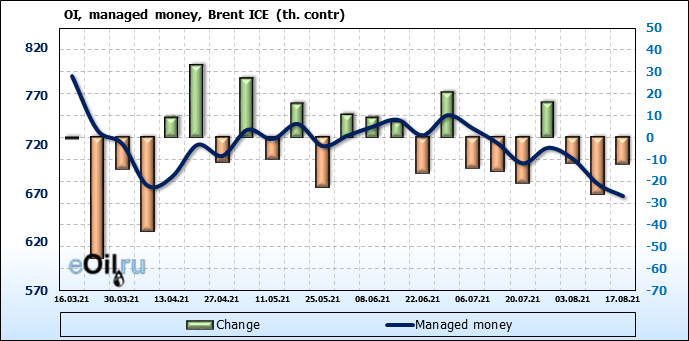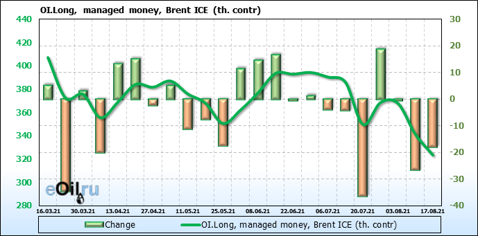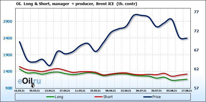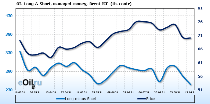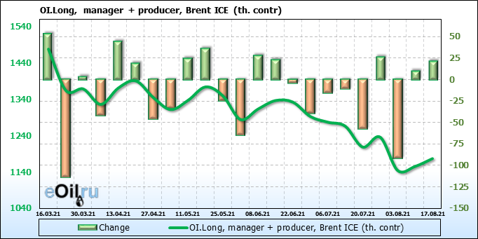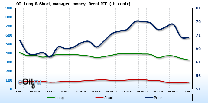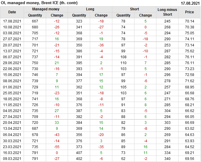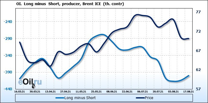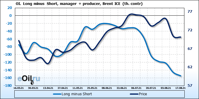 За прошедшую неделю, 11.08.21 — 17.08.21, разница между длинными и короткими позициями управляющих сократилась на 22.5 тыс. контрактов. В тоже время, цена упала на 0.24 доллара.