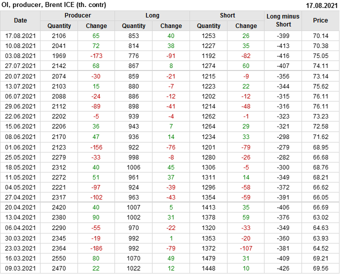 За неделю разница между длинными и короткими позициями производителей сократилась на 13.8 тыс. контрактов.