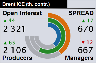 За прошлую неделю разница между OI производителей и OI управляющих выросла на 21 679 контрактов. Разница между длинными позициями производителей и управляющих сократилась на 4 414 контрактов. Разница между короткими позициями производителей и управляющих выросла на 14 743 контракта.