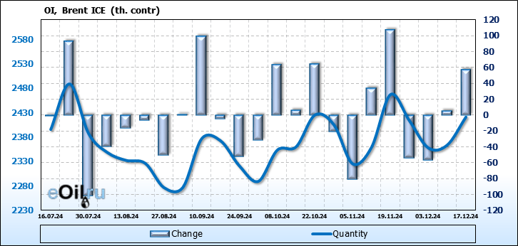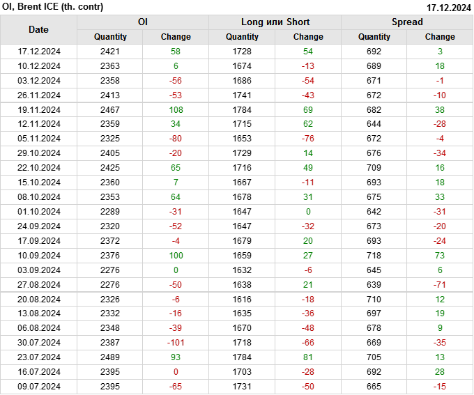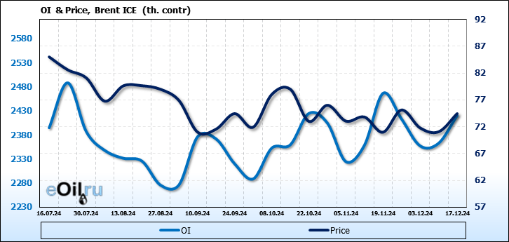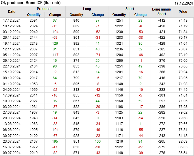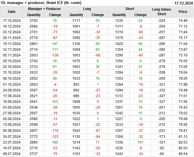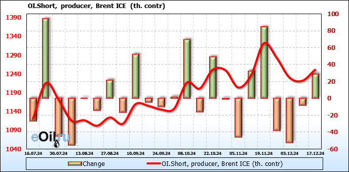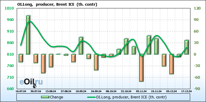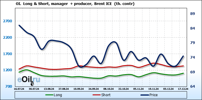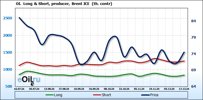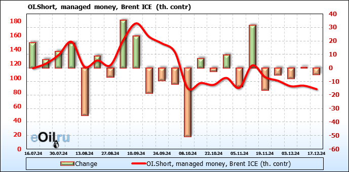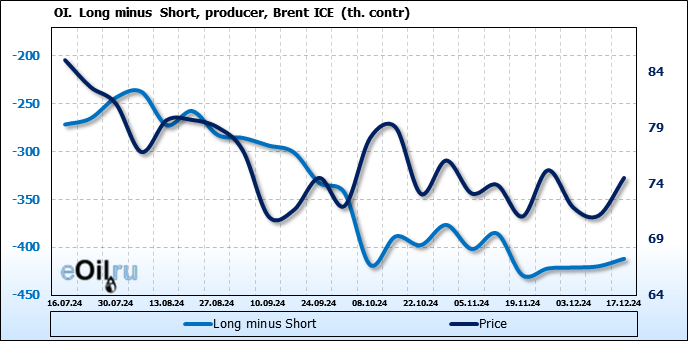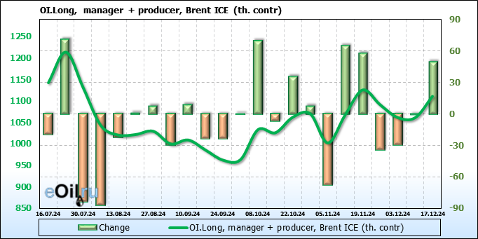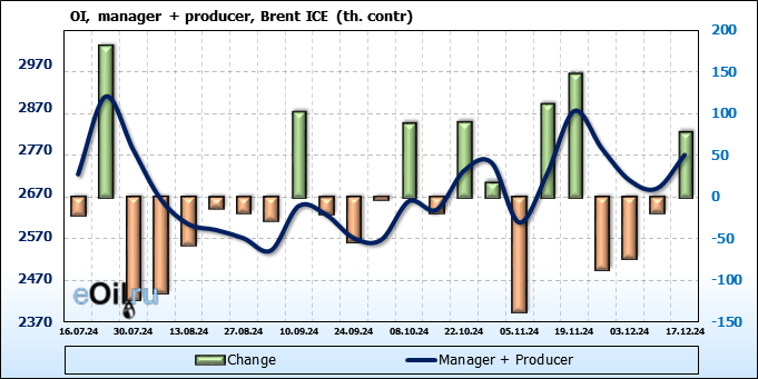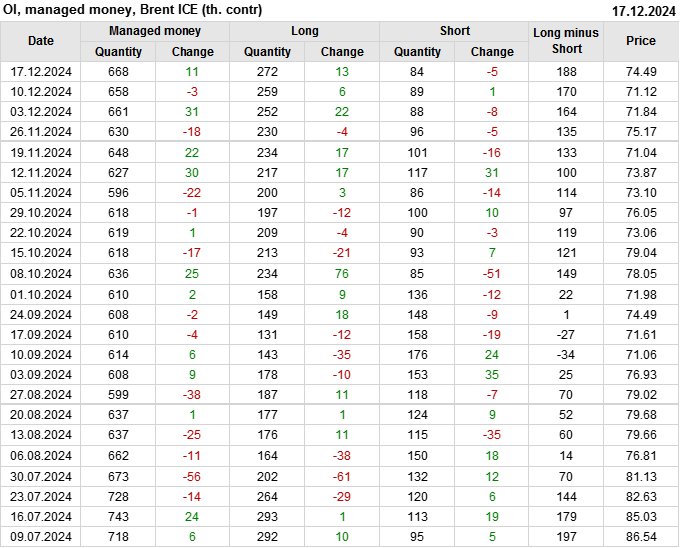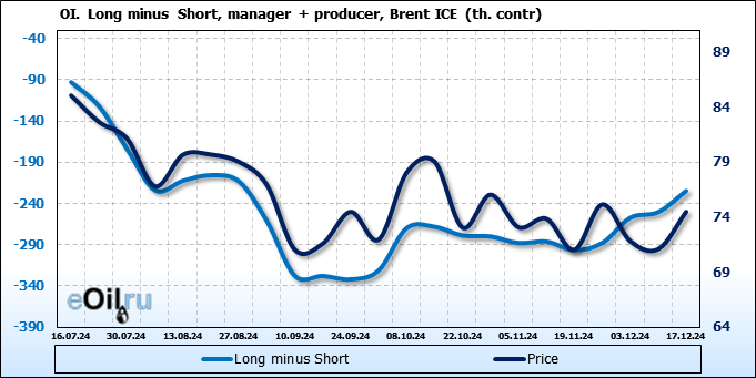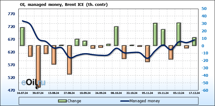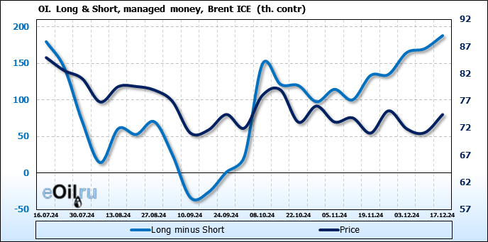 За прошедшую неделю, 11.12.24 — 17.12.24, разница между длинными и короткими позициями управляющих увеличилась на 17.8 тыс. контрактов. В тоже время, цена выросла на 3.37 доллара.