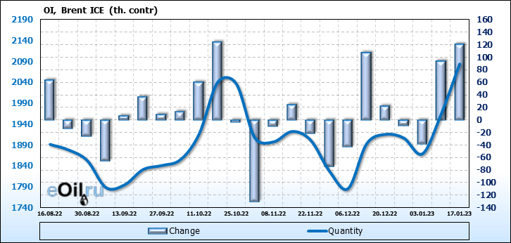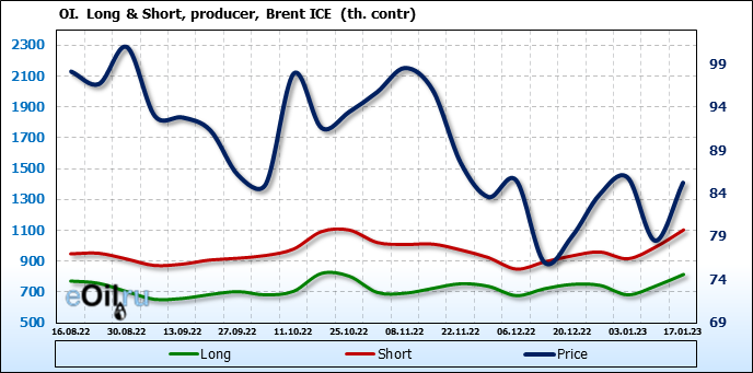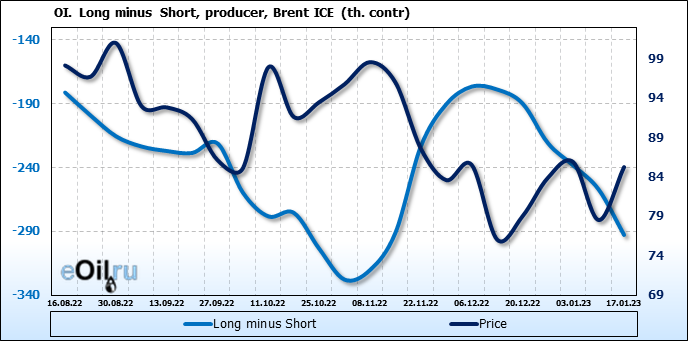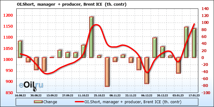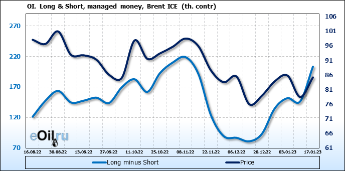 За прошедшую неделю, 11.01.23 — 17.01.23, разница между длинными и короткими позициями управляющих увеличилась на 56.9 тыс. контрактов. В тоже время, цена выросла на 6.71 доллара.