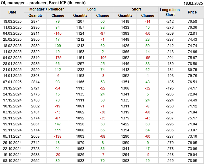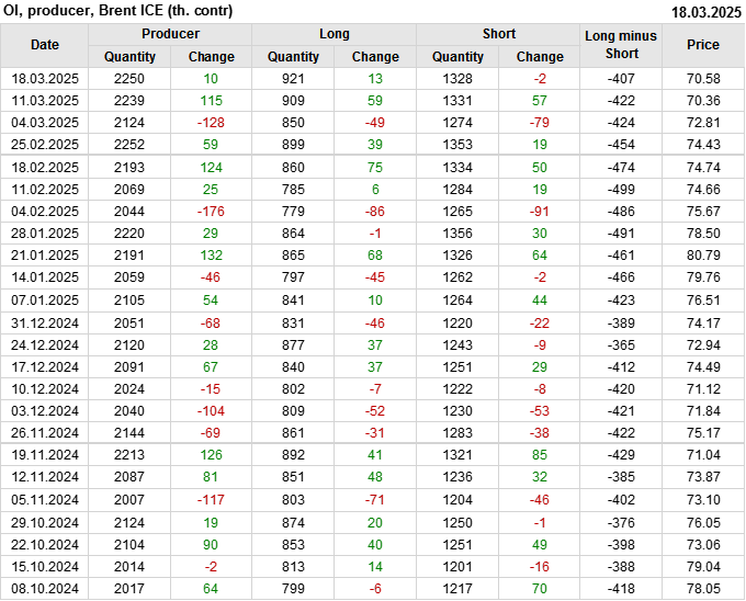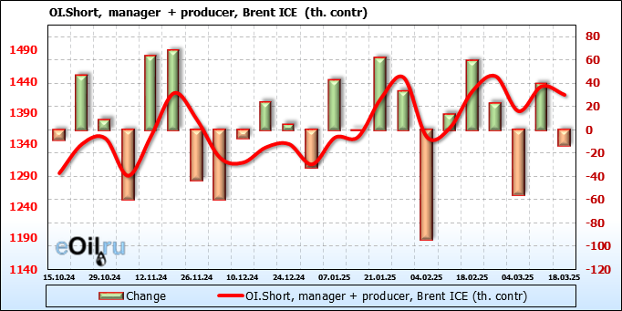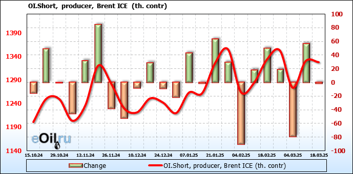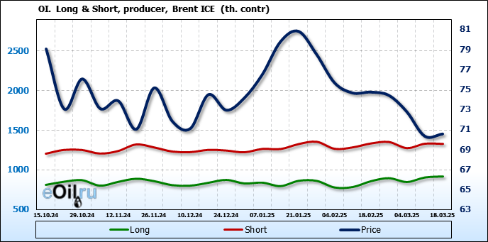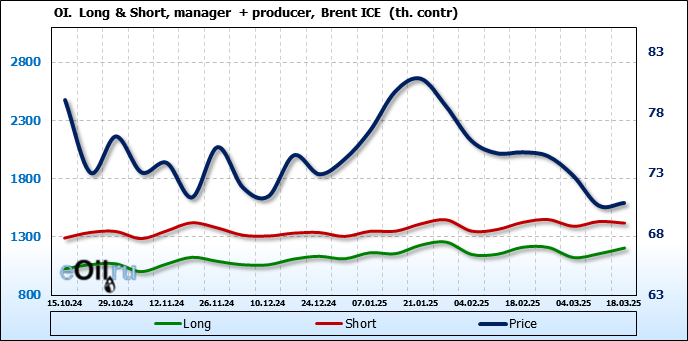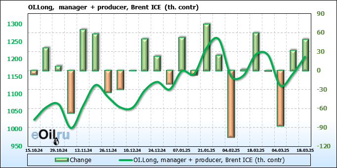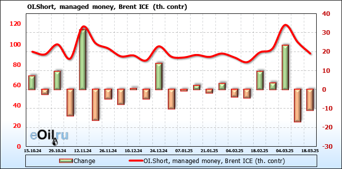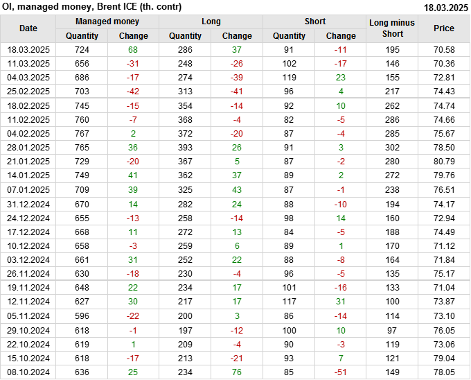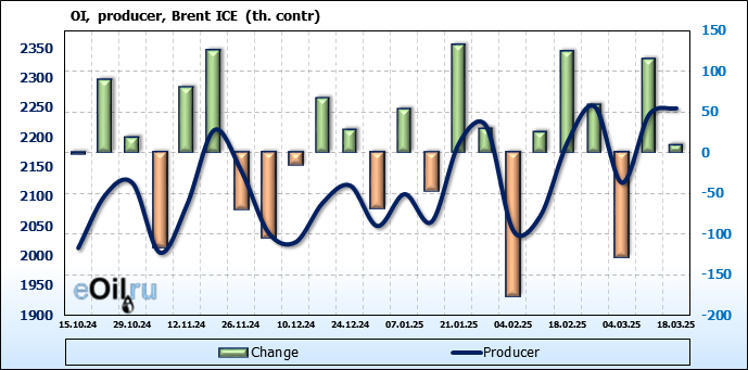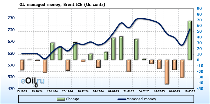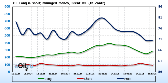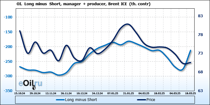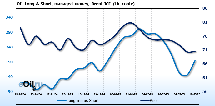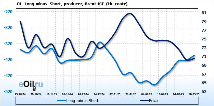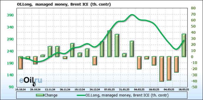 За прошедшую неделю, 12.03.25 — 18.03.25, разница между длинными и короткими позициями управляющих увеличилась на 48.3 тыс. контрактов. В тоже время, цена выросла на 0.22 доллара.