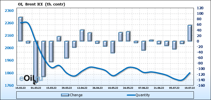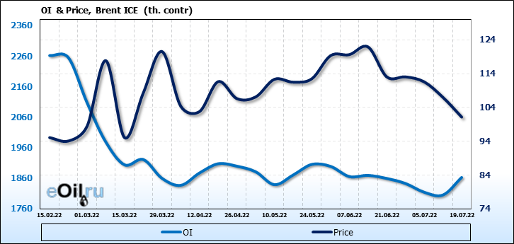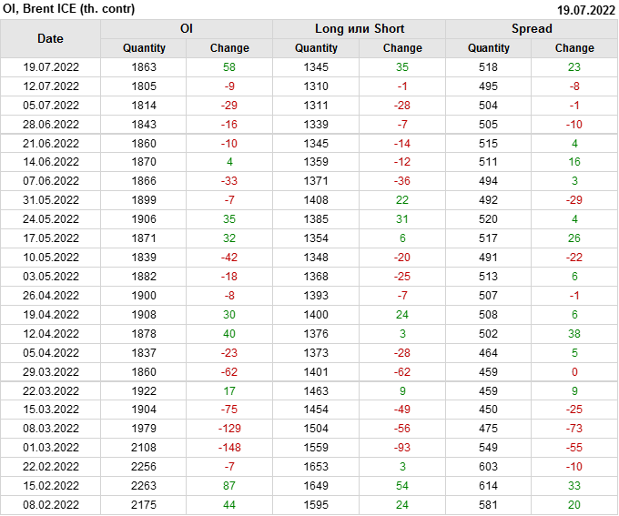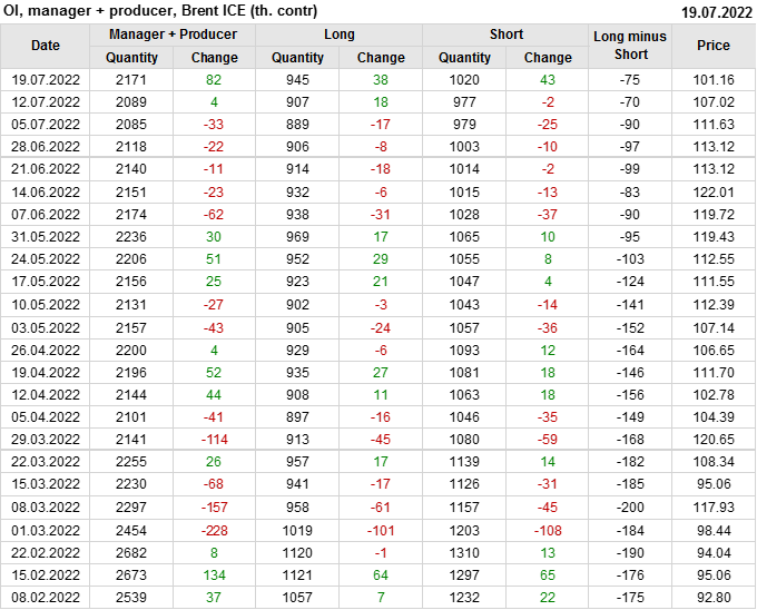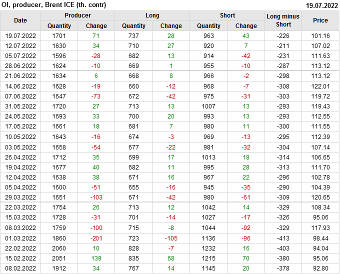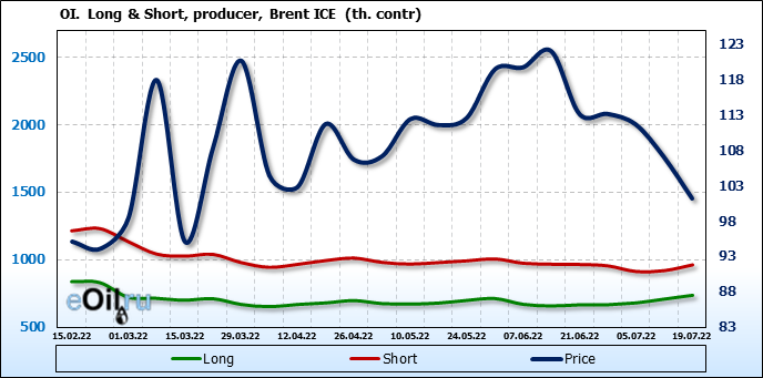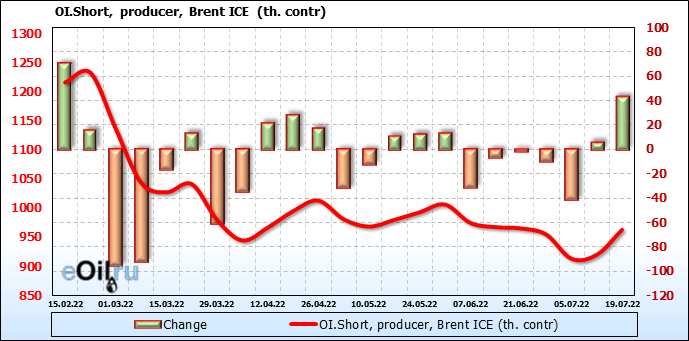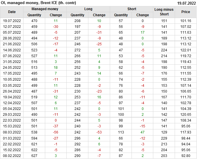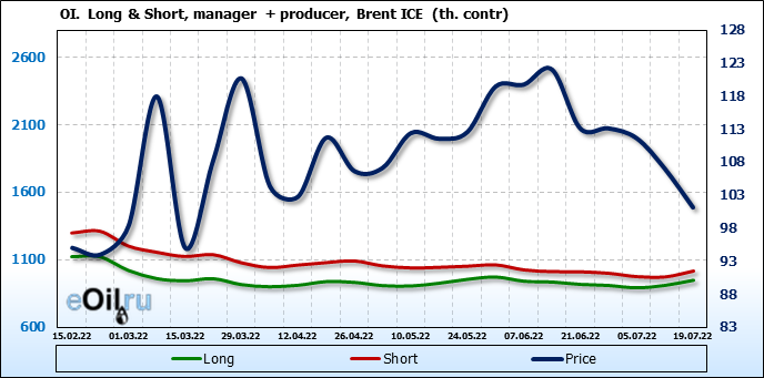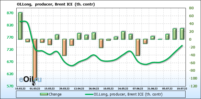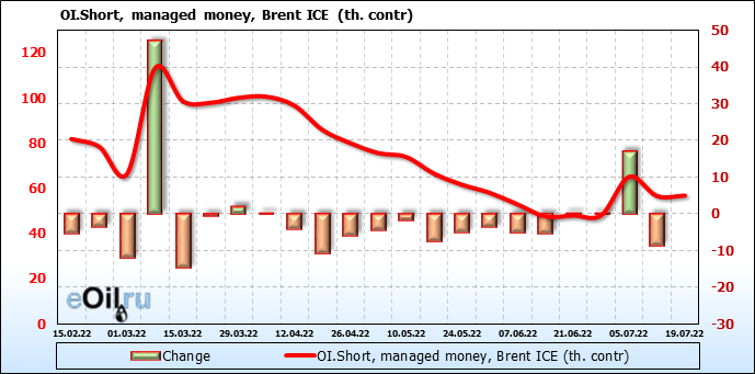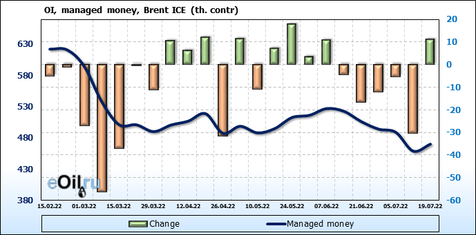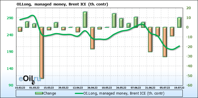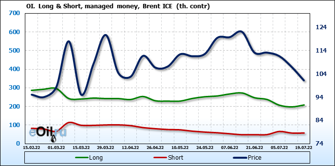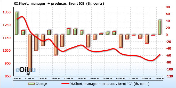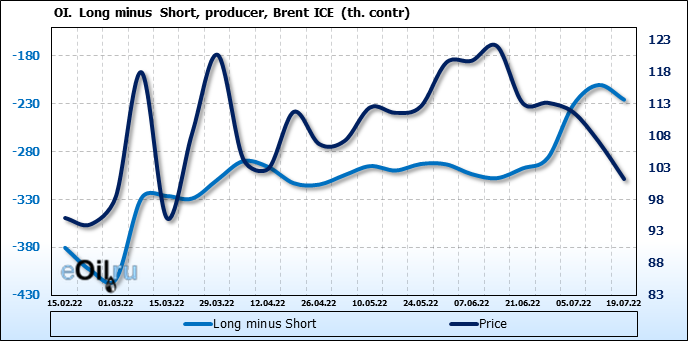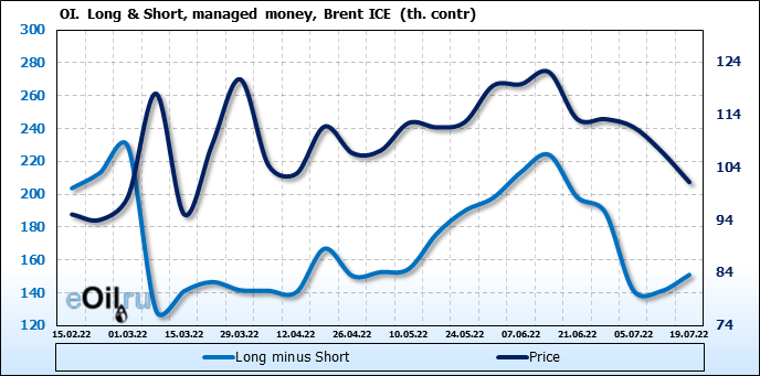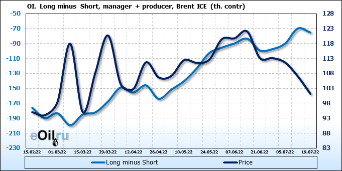За прошедшую неделю, 13.07.22 — 19.07.22, разница между длинными и короткими позициями управляющих увеличилась на 10 тыс. контрактов. В тоже время, цена упала на 5.86 доллара.