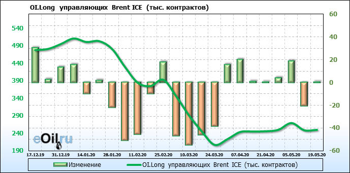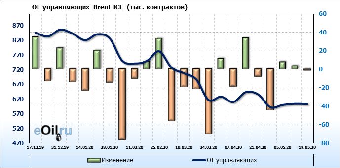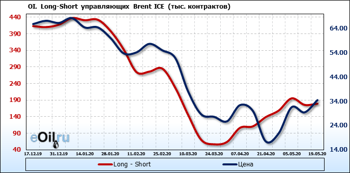 За прошлую неделю, 13.05.20 — 19.05.20, разница между длинными и короткими позициями управляющих выросла на 4 тыс. контрактов. В тоже время, цена выросла на 5.05 доллара. Управляющие наращивают позиции, разгоняя тем самым рост цен, что говорит нам о текущей силе рынка.