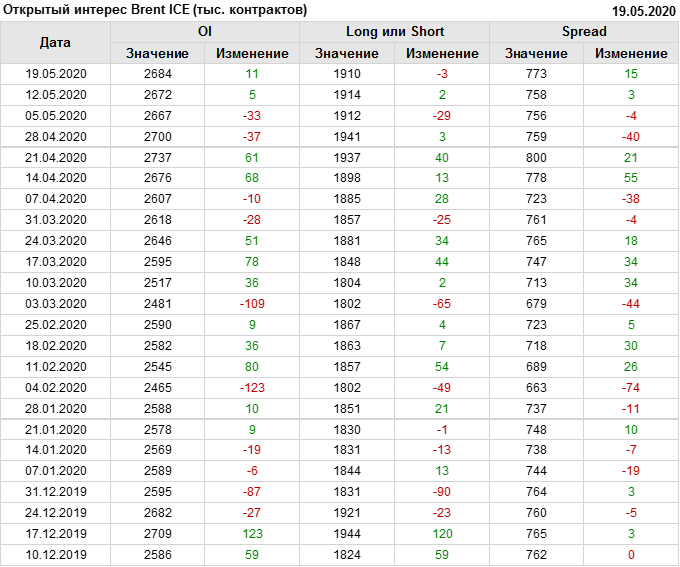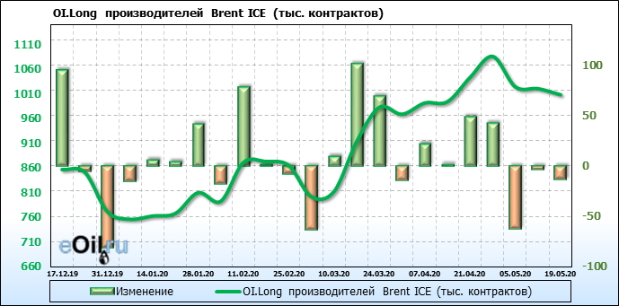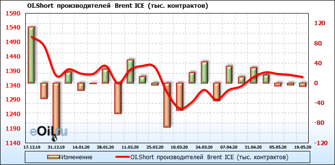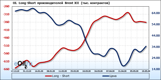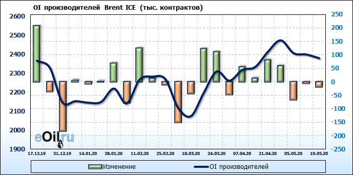 За прошлую неделю, 13.05.20 — 19.05.20, разница между длинными и короткими позициями производителей упала на 5 тыс. контрактов. В тоже время, цена выросла на 5.05 доллара. Производители увеличивают продажи, предполагая, что текущие уровни являются привлекательными для них. И не смотря на это, рынок продолжает расти, что показывает силу текущего тренда.